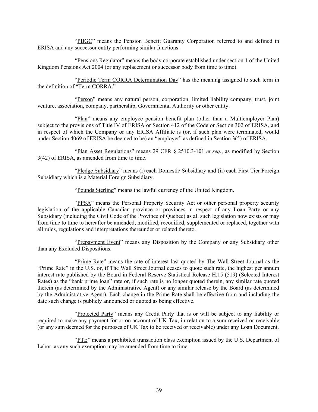 “PBGC” means the Pension Benefit Guaranty Corporation referred to and defined in ERISA and any successor entity performing similar functions. “Pensions Regulator” means the body corporate established under section 1 of the United Kingdom Pensions Act 2004 (or any replacement or successor body from time to time). “Periodic Term CORRA Determination Day” has the meaning assigned to such term in the definition of “Term CORRA.” “Person” means any natural person, corporation, limited liability company, trust, joint venture, association, company, partnership, Governmental Authority or other entity. “Plan” means any employee pension benefit plan (other than a Multiemployer Plan) subject to the provisions of Title IV of ERISA or Section 412 of the Code or Section 302 of ERISA, and in respect of which the Company or any ERISA Affiliate is (or, if such plan were terminated, would under Section 4069 of ERISA be deemed to be) an “employer” as defined in Section 3(5) of ERISA. “Plan Asset Regulations” means 29 CFR § 2510.3-101 et seq., as modified by Section 3(42) of ERISA, as amended from time to time. “Pledge Subsidiary” means (i) each Domestic Subsidiary and (ii) each First Tier Foreign Subsidiary which is a Material Foreign Subsidiary. “Pounds Sterling” means the lawful currency of the United Kingdom. “PPSA” means the Personal Property Security Act or other personal property security legislation of the applicable Canadian province or provinces in respect of any Loan Party or any Subsidiary (including the Civil Code of the Province of Quebec) as all such legislation now exists or may from time to time to hereafter be amended, modified, recodified, supplemented or replaced, together with all rules, regulations and interpretations thereunder or related thereto. “Prepayment Event” means any Disposition by the Company or any Subsidiary other than any Excluded Dispositions. “Prime Rate” means the rate of interest last quoted by The Wall Street Journal as the “Prime Rate” in the U.S. or, if The Wall Street Journal ceases to quote such rate, the highest per annum interest rate published by the Board in Federal Reserve Statistical Release H.15 (519) (Selected Interest Rates) as the “bank prime loan” rate or, if such rate is no longer quoted therein, any similar rate quoted therein (as determined by the Administrative Agent) or any similar release by the Board (as determined by the Administrative Agent). Each change in the Prime Rate shall be effective from and including the date such change is publicly announced or quoted as being effective. “Protected Party” means any Credit Party that is or will be subject to any liability or required to make any payment for or on account of UK Tax, in relation to a sum received or receivable (or any sum deemed for the purposes of UK Tax to be received or receivable) under any Loan Document. “PTE” means a prohibited transaction class exemption issued by the U.S. Department of Labor, as any such exemption may be amended from time to time. 39