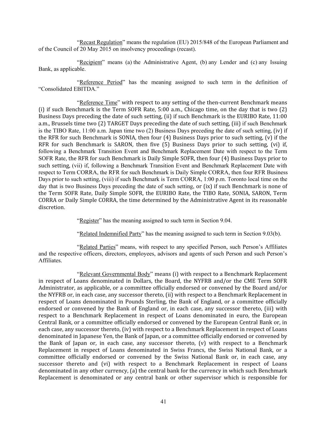 “Recast Regulation” means the regulation (EU) 2015/848 of the European Parliament and of the Council of 20 May 2015 on insolvency proceedings (recast). “Recipient” means (a) the Administrative Agent, (b) any Lender and (c) any Issuing Bank, as applicable. “Reference Period” has the meaning assigned to such term in the definition of “Consolidated EBITDA.” “Reference Time” with respect to any setting of the then-current Benchmark means(i) if such Benchmark is the Term SOFR Rate, 5:00 a.m., Chicago time, on the day that is two (2)Business Days preceding the date of such setting, (ii) if such Benchmark is the EURIBO Rate, 11:00a.m., Brussels time two (2) TARGET Days preceding the date of such setting, (iii) if such Benchmark is the TIBO Rate, 11:00 a.m. Japan time two (2) Business Days preceding the date of such setting, (iv) ifthe RFR for such Benchmark is SONIA, then four (4) Business Days prior to such setting, (v) if theRFR for such Benchmark is SARON, then five (5) Business Days prior to such setting, (vi) if, following a Benchmark Transition Event and Benchmark Replacement Date with respect to the Term SOFR Rate, the RFR for such Benchmark is Daily Simple SOFR, then four (4) Business Days prior tosuch setting, (vii) if, following a Benchmark Transition Event and Benchmark Replacement Date with respect to Term CORRA, the RFR for such Benchmark is Daily Simple CORRA, then four RFR Business Days prior to such setting, (viii) if such Benchmark is Term CORRA, 1:00 p.m. Toronto local time on the day that is two Business Days preceding the date of such setting, or (ix) if such Benchmark is none ofthe Term SOFR Rate, Daily Simple SOFR, the EURIBO Rate, the TIBO Rate, SONIA, SARON, TermCORRA or Daily Simple CORRA, the time determined by the Administrative Agent in its reasonablediscretion. “Register” has the meaning assigned to such term in Section 9.04. “Related Indemnified Party” has the meaning assigned to such term in Section 9.03(b). “Related Parties” means, with respect to any specified Person, such Person’s Affiliates and the respective officers, directors, employees, advisors and agents of such Person and such Person’s Affiliates. “Relevant Governmental Body” means (i) with respect to a Benchmark Replacementin respect of Loans denominated in Dollars, the Board, the NYFRB and/or the CME Term SOFRAdministrator, as applicable, or a committee officially endorsed or convened by the Board and/orthe NYFRB or, in each case, any successor thereto, (ii) with respect to a Benchmark Replacement inrespect of Loans denominated in Pounds Sterling, the Bank of England, or a committee officiallyendorsed or convened by the Bank of England or, in each case, any successor thereto, (iii) withrespect to a Benchmark Replacement in respect of Loans denominated in euro, the EuropeanCentral Bank, or a committee officially endorsed or convened by the European Central Bank or, ineach case, any successor thereto, (iv) with respect to a Benchmark Replacement in respect of Loansdenominated in Japanese Yen, the Bank of Japan, or a committee officially endorsed or convened bythe Bank of Japan or, in each case, any successor thereto, (v) with respect to a BenchmarkReplacement in respect of Loans denominated in Swiss Francs, the Swiss National Bank, or acommittee officially endorsed or convened by the Swiss National Bank or, in each case, anysuccessor thereto and (vi) with respect to a Benchmark Replacement in respect of Loansdenominated in any other currency, (a) the central bank for the currency in which such BenchmarkReplacement is denominated or any central bank or other supervisor which is responsible for 41