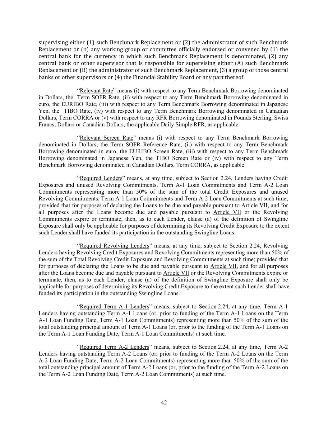 supervising either (1) such Benchmark Replacement or (2) the administrator of such BenchmarkReplacement or (b) any working group or committee officially endorsed or convened by (1) thecentral bank for the currency in which such Benchmark Replacement is denominated, (2) anycentral bank or other supervisor that is responsible for supervising either (A) such BenchmarkReplacement or (B) the administrator of such Benchmark Replacement, (3) a group of those centralbanks or other supervisors or (4) the Financial Stability Board or any part thereof. “Relevant Rate” means (i) with respect to any Term Benchmark Borrowing denominated in Dollars, the Term SOFR Rate, (ii) with respect to any Term Benchmark Borrowing denominated in euro, the EURIBO Rate, (iii) with respect to any Term Benchmark Borrowing denominated in Japanese Yen, the TIBO Rate, (iv) with respect to any Term Benchmark Borrowing denominated in Canadian Dollars, Term CORRA or (v) with respect to any RFR Borrowing denominated in Pounds Sterling, Swiss Francs, Dollars or Canadian Dollars, the applicable Daily Simple RFR, as applicable. “Relevant Screen Rate” means (i) with respect to any Term Benchmark Borrowing denominated in Dollars, the Term SOFR Reference Rate, (ii) with respect to any Term Benchmark Borrowing denominated in euro, the EURIBO Screen Rate, (iii) with respect to any Term Benchmark Borrowing denominated in Japanese Yen, the TIBO Screen Rate or (iv) with respect to any Term Benchmark Borrowing denominated in Canadian Dollars, Term CORRA, as applicable. “Required Lenders” means, at any time, subject to Section 2.24, Lenders having Credit Exposures and unused Revolving Commitments, Term A-1 Loan Commitments and Term A-2 Loan Commitments representing more than 50% of the sum of the total Credit Exposures and unused Revolving Commitments, Term A-1 Loan Commitments and Term A-2 Loan Commitments at such time; provided that for purposes of declaring the Loans to be due and payable pursuant to Article VII, and for all purposes after the Loans become due and payable pursuant to Article VII or the Revolving Commitments expire or terminate, then, as to each Lender, clause (a) of the definition of Swingline Exposure shall only be applicable for purposes of determining its Revolving Credit Exposure to the extent such Lender shall have funded its participation in the outstanding Swingline Loans. “Required Revolving Lenders” means, at any time, subject to Section 2.24, Revolving Lenders having Revolving Credit Exposures and Revolving Commitments representing more than 50% of the sum of the Total Revolving Credit Exposure and Revolving Commitments at such time; provided that for purposes of declaring the Loans to be due and payable pursuant to Article VII, and for all purposes after the Loans become due and payable pursuant to Article VII or the Revolving Commitments expire or terminate, then, as to each Lender, clause (a) of the definition of Swingline Exposure shall only be applicable for purposes of determining its Revolving Credit Exposure to the extent such Lender shall have funded its participation in the outstanding Swingline Loans. “Required Term A-1 Lenders” means, subject to Section 2.24, at any time, Term A-1 Lenders having outstanding Term A-1 Loans (or, prior to funding of the Term A-1 Loans on the Term A-1 Loan Funding Date, Term A-1 Loan Commitments) representing more than 50% of the sum of the total outstanding principal amount of Term A-1 Loans (or, prior to the funding of the Term A-1 Loans on the Term A-1 Loan Funding Date, Term A-1 Loan Commitments) at such time. “Required Term A-2 Lenders” means, subject to Section 2.24, at any time, Term A-2 Lenders having outstanding Term A-2 Loans (or, prior to funding of the Term A-2 Loans on the Term A-2 Loan Funding Date, Term A-2 Loan Commitments) representing more than 50% of the sum of the total outstanding principal amount of Term A-2 Loans (or, prior to the funding of the Term A-2 Loans on the Term A-2 Loan Funding Date, Term A-2 Loan Commitments) at such time. 42