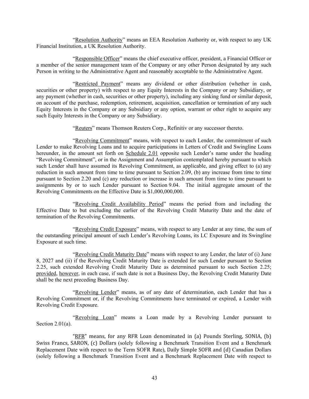 “Resolution Authority” means an EEA Resolution Authority or, with respect to any UK Financial Institution, a UK Resolution Authority. “Responsible Officer” means the chief executive officer, president, a Financial Officer or a member of the senior management team of the Company or any other Person designated by any such Person in writing to the Administrative Agent and reasonably acceptable to the Administrative Agent. “Restricted Payment” means any dividend or other distribution (whether in cash, securities or other property) with respect to any Equity Interests in the Company or any Subsidiary, or any payment (whether in cash, securities or other property), including any sinking fund or similar deposit, on account of the purchase, redemption, retirement, acquisition, cancellation or termination of any such Equity Interests in the Company or any Subsidiary or any option, warrant or other right to acquire any such Equity Interests in the Company or any Subsidiary. “Reuters” means Thomson Reuters Corp., Refinitiv or any successor thereto. “Revolving Commitment” means, with respect to each Lender, the commitment of such Lender to make Revolving Loans and to acquire participations in Letters of Credit and Swingline Loans hereunder, in the amount set forth on Schedule 2.01 opposite such Lender’s name under the heading “Revolving Commitment”, or in the Assignment and Assumption contemplated hereby pursuant to which such Lender shall have assumed its Revolving Commitment, as applicable, and giving effect to (a) any reduction in such amount from time to time pursuant to Section 2.09, (b) any increase from time to time pursuant to Section 2.20 and (c) any reduction or increase in such amount from time to time pursuant to assignments by or to such Lender pursuant to Section 9.04. The initial aggregate amount of the Revolving Commitments on the Effective Date is $1,000,000,000. “Revolving Credit Availability Period” means the period from and including the Effective Date to but excluding the earlier of the Revolving Credit Maturity Date and the date of termination of the Revolving Commitments. “Revolving Credit Exposure” means, with respect to any Lender at any time, the sum of the outstanding principal amount of such Lender’s Revolving Loans, its LC Exposure and its Swingline Exposure at such time. “Revolving Credit Maturity Date” means with respect to any Lender, the later of (i) June 8, 2027 and (ii) if the Revolving Credit Maturity Date is extended for such Lender pursuant to Section 2.25, such extended Revolving Credit Maturity Date as determined pursuant to such Section 2.25; provided, however, in each case, if such date is not a Business Day, the Revolving Credit Maturity Date shall be the next preceding Business Day. “Revolving Lender” means, as of any date of determination, each Lender that has a Revolving Commitment or, if the Revolving Commitments have terminated or expired, a Lender with Revolving Credit Exposure. “Revolving Loan” means a Loan made by a Revolving Lender pursuant to Section 2.01(a). “RFR” means, for any RFR Loan denominated in (a) Pounds Sterling, SONIA, (b)Swiss Francs, SARON, (c) Dollars (solely following a Benchmark Transition Event and a Benchmark Replacement Date with respect to the Term SOFR Rate), Daily Simple SOFR and (d) Canadian Dollars (solely following a Benchmark Transition Event and a Benchmark Replacement Date with respect to 43