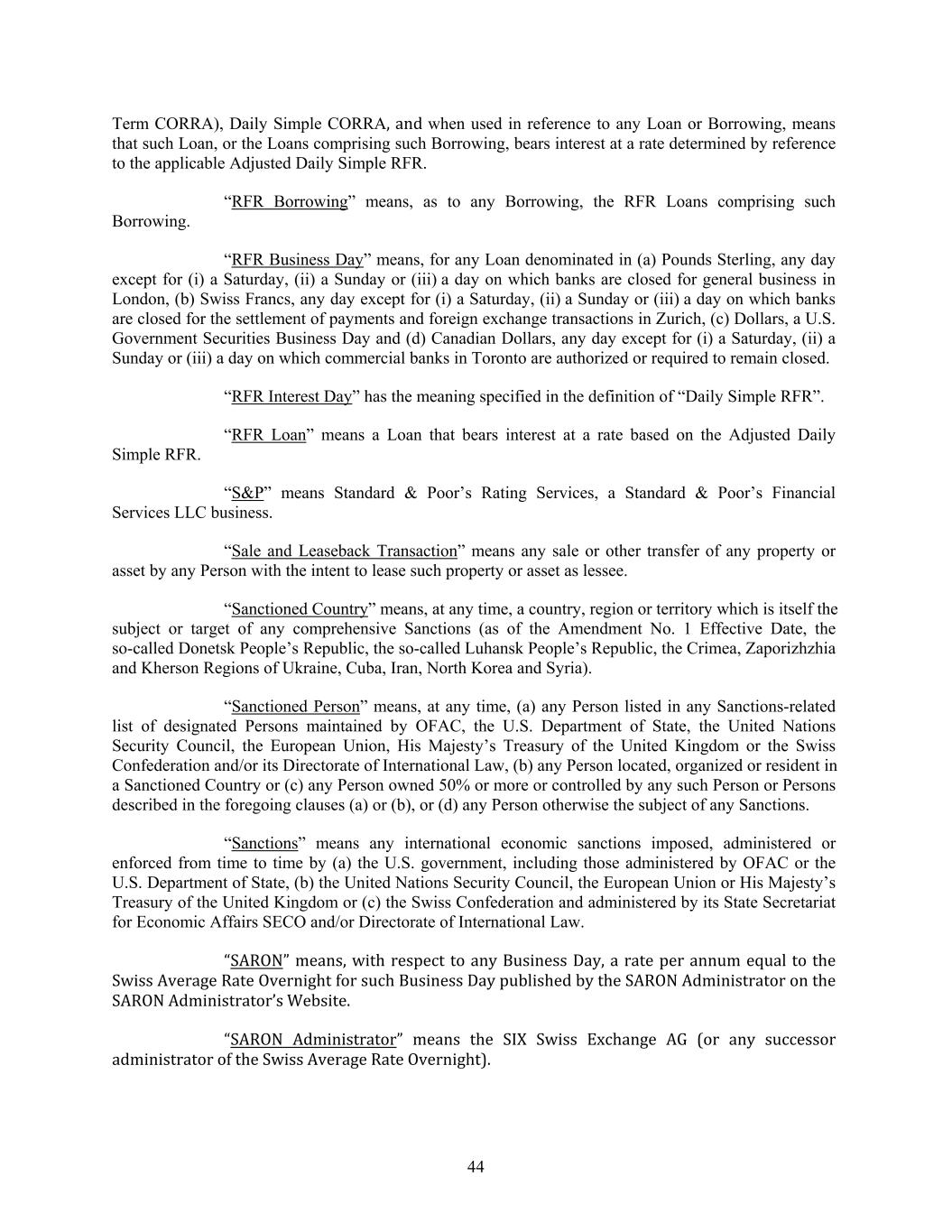 Term CORRA), Daily Simple CORRA, and when used in reference to any Loan or Borrowing, means that such Loan, or the Loans comprising such Borrowing, bears interest at a rate determined by reference to the applicable Adjusted Daily Simple RFR. “RFR Borrowing” means, as to any Borrowing, the RFR Loans comprising such Borrowing. “RFR Business Day” means, for any Loan denominated in (a) Pounds Sterling, any day except for (i) a Saturday, (ii) a Sunday or (iii) a day on which banks are closed for general business in London, (b) Swiss Francs, any day except for (i) a Saturday, (ii) a Sunday or (iii) a day on which banks are closed for the settlement of payments and foreign exchange transactions in Zurich, (c) Dollars, a U.S. Government Securities Business Day and (d) Canadian Dollars, any day except for (i) a Saturday, (ii) a Sunday or (iii) a day on which commercial banks in Toronto are authorized or required to remain closed. “RFR Interest Day” has the meaning specified in the definition of “Daily Simple RFR”. “RFR Loan” means a Loan that bears interest at a rate based on the Adjusted Daily Simple RFR. “S&P” means Standard & Poor’s Rating Services, a Standard & Poor’s Financial Services LLC business. “Sale and Leaseback Transaction” means any sale or other transfer of any property or asset by any Person with the intent to lease such property or asset as lessee. “Sanctioned Country” means, at any time, a country, region or territory which is itself the subject or target of any comprehensive Sanctions (as of the Amendment No. 1 Effective Date, the so-called Donetsk People’s Republic, the so-called Luhansk People’s Republic, the Crimea, Zaporizhzhia and Kherson Regions of Ukraine, Cuba, Iran, North Korea and Syria). “Sanctioned Person” means, at any time, (a) any Person listed in any Sanctions-related list of designated Persons maintained by OFAC, the U.S. Department of State, the United Nations Security Council, the European Union, His Majesty’s Treasury of the United Kingdom or the Swiss Confederation and/or its Directorate of International Law, (b) any Person located, organized or resident in a Sanctioned Country or (c) any Person owned 50% or more or controlled by any such Person or Persons described in the foregoing clauses (a) or (b), or (d) any Person otherwise the subject of any Sanctions. “Sanctions” means any international economic sanctions imposed, administered or enforced from time to time by (a) the U.S. government, including those administered by OFAC or the U.S. Department of State, (b) the United Nations Security Council, the European Union or His Majesty’s Treasury of the United Kingdom or (c) the Swiss Confederation and administered by its State Secretariat for Economic Affairs SECO and/or Directorate of International Law.“SARON” means, with respect to any Business Day, a rate per annum equal to theSwiss Average Rate Overnight for such Business Day published by the SARON Administrator on theSARON Administrator’s Website.“SARON Administrator” means the SIX Swiss Exchange AG (or any successoradministrator of the Swiss Average Rate Overnight). 44