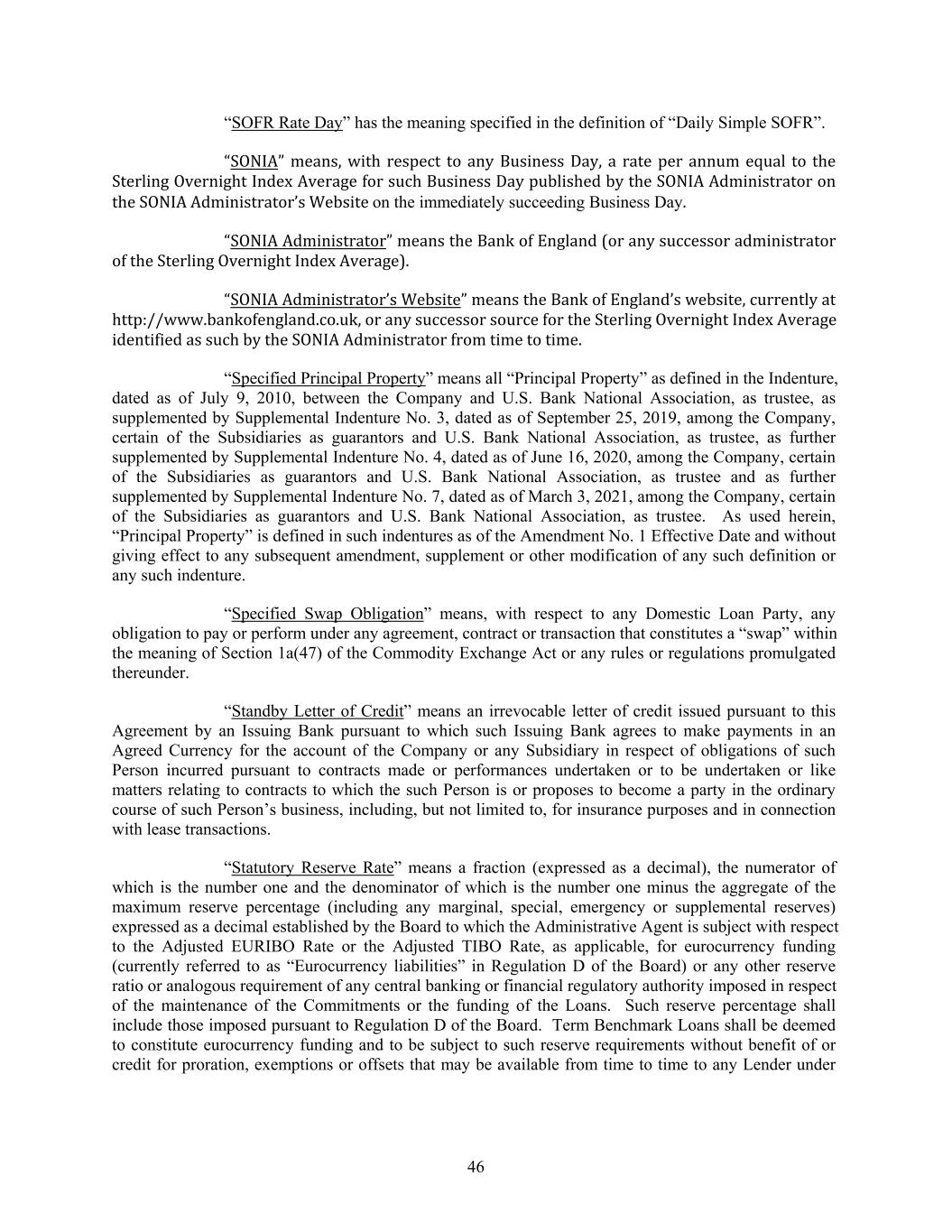 “SOFR Rate Day” has the meaning specified in the definition of “Daily Simple SOFR”.“SONIA” means, with respect to any Business Day, a rate per annum equal to theSterling Overnight Index Average for such Business Day published by the SONIA Administrator onthe SONIA Administrator’s Website on the immediately succeeding Business Day.“SONIA Administrator” means the Bank of England (or any successor administratorof the Sterling Overnight Index Average).“SONIA Administrator’s Website” means the Bank of England’s website, currently athttp://www.bankofengland.co.uk, or any successor source for the Sterling Overnight Index Averageidentified as such by the SONIA Administrator from time to time. “Specified Principal Property” means all “Principal Property” as defined in the Indenture, dated as of July 9, 2010, between the Company and U.S. Bank National Association, as trustee, as supplemented by Supplemental Indenture No. 3, dated as of September 25, 2019, among the Company, certain of the Subsidiaries as guarantors and U.S. Bank National Association, as trustee, as further supplemented by Supplemental Indenture No. 4, dated as of June 16, 2020, among the Company, certain of the Subsidiaries as guarantors and U.S. Bank National Association, as trustee and as further supplemented by Supplemental Indenture No. 7, dated as of March 3, 2021, among the Company, certain of the Subsidiaries as guarantors and U.S. Bank National Association, as trustee. As used herein, “Principal Property” is defined in such indentures as of the Amendment No. 1 Effective Date and without giving effect to any subsequent amendment, supplement or other modification of any such definition or any such indenture. “Specified Swap Obligation” means, with respect to any Domestic Loan Party, any obligation to pay or perform under any agreement, contract or transaction that constitutes a “swap” within the meaning of Section 1a(47) of the Commodity Exchange Act or any rules or regulations promulgated thereunder. “Standby Letter of Credit” means an irrevocable letter of credit issued pursuant to this Agreement by an Issuing Bank pursuant to which such Issuing Bank agrees to make payments in an Agreed Currency for the account of the Company or any Subsidiary in respect of obligations of such Person incurred pursuant to contracts made or performances undertaken or to be undertaken or like matters relating to contracts to which the such Person is or proposes to become a party in the ordinary course of such Person’s business, including, but not limited to, for insurance purposes and in connection with lease transactions. “Statutory Reserve Rate” means a fraction (expressed as a decimal), the numerator of which is the number one and the denominator of which is the number one minus the aggregate of the maximum reserve percentage (including any marginal, special, emergency or supplemental reserves) expressed as a decimal established by the Board to which the Administrative Agent is subject with respect to the Adjusted EURIBO Rate or the Adjusted TIBO Rate, as applicable, for eurocurrency funding (currently referred to as “Eurocurrency liabilities” in Regulation D of the Board) or any other reserve ratio or analogous requirement of any central banking or financial regulatory authority imposed in respect of the maintenance of the Commitments or the funding of the Loans. Such reserve percentage shall include those imposed pursuant to Regulation D of the Board. Term Benchmark Loans shall be deemed to constitute eurocurrency funding and to be subject to such reserve requirements without benefit of or credit for proration, exemptions or offsets that may be available from time to time to any Lender under 46