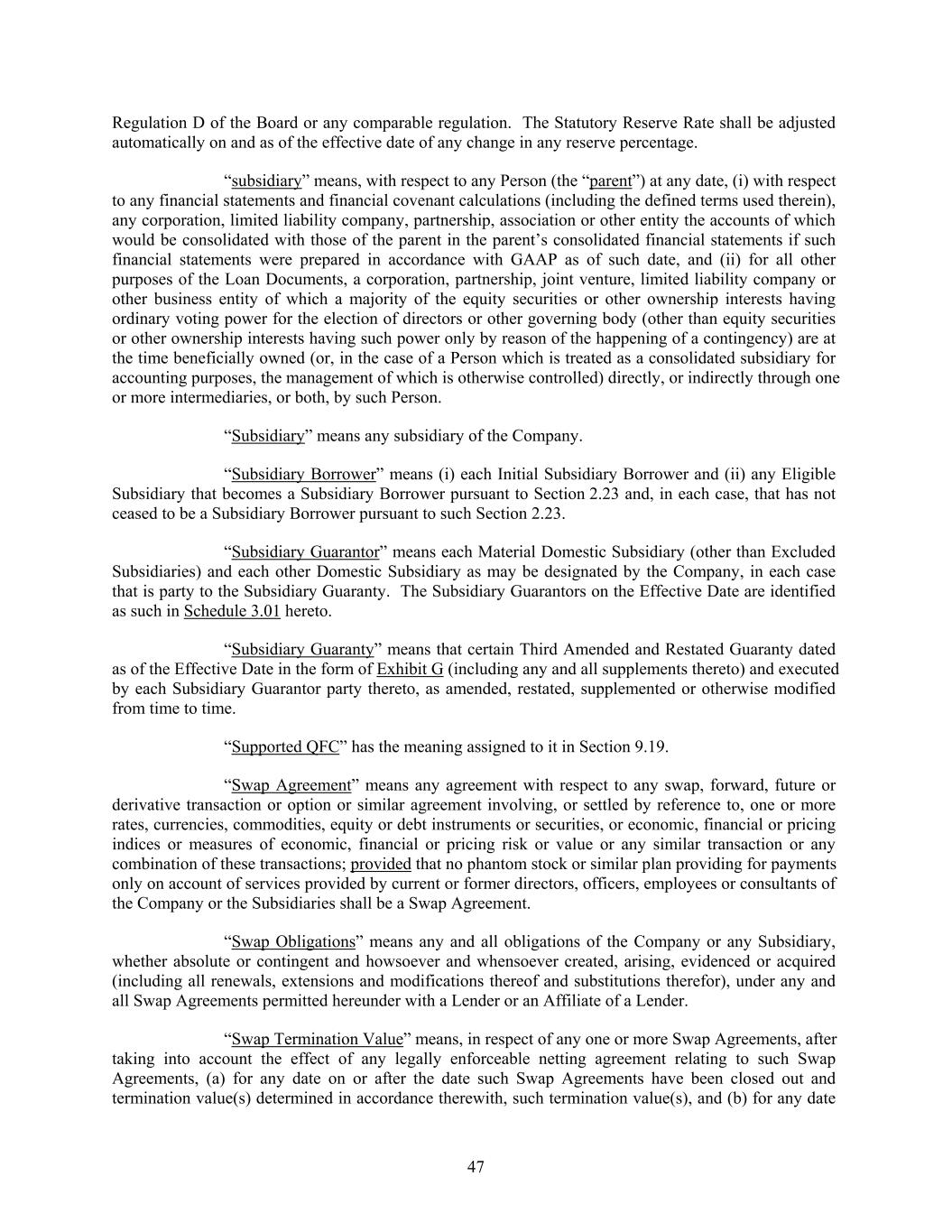 Regulation D of the Board or any comparable regulation. The Statutory Reserve Rate shall be adjusted automatically on and as of the effective date of any change in any reserve percentage. “subsidiary” means, with respect to any Person (the “parent”) at any date, (i) with respect to any financial statements and financial covenant calculations (including the defined terms used therein), any corporation, limited liability company, partnership, association or other entity the accounts of which would be consolidated with those of the parent in the parent’s consolidated financial statements if such financial statements were prepared in accordance with GAAP as of such date, and (ii) for all other purposes of the Loan Documents, a corporation, partnership, joint venture, limited liability company or other business entity of which a majority of the equity securities or other ownership interests having ordinary voting power for the election of directors or other governing body (other than equity securities or other ownership interests having such power only by reason of the happening of a contingency) are at the time beneficially owned (or, in the case of a Person which is treated as a consolidated subsidiary for accounting purposes, the management of which is otherwise controlled) directly, or indirectly through one or more intermediaries, or both, by such Person. “Subsidiary” means any subsidiary of the Company. “Subsidiary Borrower” means (i) each Initial Subsidiary Borrower and (ii) any Eligible Subsidiary that becomes a Subsidiary Borrower pursuant to Section 2.23 and, in each case, that has not ceased to be a Subsidiary Borrower pursuant to such Section 2.23. “Subsidiary Guarantor” means each Material Domestic Subsidiary (other than Excluded Subsidiaries) and each other Domestic Subsidiary as may be designated by the Company, in each case that is party to the Subsidiary Guaranty. The Subsidiary Guarantors on the Effective Date are identified as such in Schedule 3.01 hereto. “Subsidiary Guaranty” means that certain Third Amended and Restated Guaranty dated as of the Effective Date in the form of Exhibit G (including any and all supplements thereto) and executed by each Subsidiary Guarantor party thereto, as amended, restated, supplemented or otherwise modified from time to time. “Supported QFC” has the meaning assigned to it in Section 9.19. “Swap Agreement” means any agreement with respect to any swap, forward, future or derivative transaction or option or similar agreement involving, or settled by reference to, one or more rates, currencies, commodities, equity or debt instruments or securities, or economic, financial or pricing indices or measures of economic, financial or pricing risk or value or any similar transaction or any combination of these transactions; provided that no phantom stock or similar plan providing for payments only on account of services provided by current or former directors, officers, employees or consultants of the Company or the Subsidiaries shall be a Swap Agreement. “Swap Obligations” means any and all obligations of the Company or any Subsidiary, whether absolute or contingent and howsoever and whensoever created, arising, evidenced or acquired (including all renewals, extensions and modifications thereof and substitutions therefor), under any and all Swap Agreements permitted hereunder with a Lender or an Affiliate of a Lender. “Swap Termination Value” means, in respect of any one or more Swap Agreements, after taking into account the effect of any legally enforceable netting agreement relating to such Swap Agreements, (a) for any date on or after the date such Swap Agreements have been closed out and termination value(s) determined in accordance therewith, such termination value(s), and (b) for any date 47