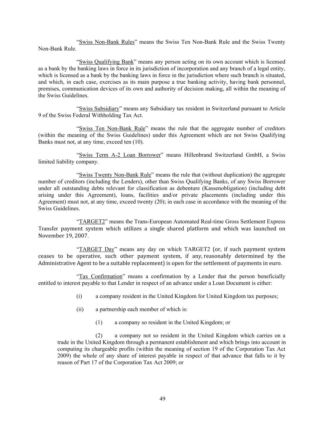 “Swiss Non-Bank Rules” means the Swiss Ten Non-Bank Rule and the Swiss Twenty Non-Bank Rule. “Swiss Qualifying Bank” means any person acting on its own account which is licensed as a bank by the banking laws in force in its jurisdiction of incorporation and any branch of a legal entity, which is licensed as a bank by the banking laws in force in the jurisdiction where such branch is situated, and which, in each case, exercises as its main purpose a true banking activity, having bank personnel, premises, communication devices of its own and authority of decision making, all within the meaning of the Swiss Guidelines. “Swiss Subsidiary” means any Subsidiary tax resident in Switzerland pursuant to Article 9 of the Swiss Federal Withholding Tax Act. “Swiss Ten Non-Bank Rule” means the rule that the aggregate number of creditors (within the meaning of the Swiss Guidelines) under this Agreement which are not Swiss Qualifying Banks must not, at any time, exceed ten (10). “Swiss Term A-2 Loan Borrower” means Hillenbrand Switzerland GmbH, a Swiss limited liability company. “Swiss Twenty Non-Bank Rule” means the rule that (without duplication) the aggregate number of creditors (including the Lenders), other than Swiss Qualifying Banks, of any Swiss Borrower under all outstanding debts relevant for classification as debenture (Kassenobligation) (including debt arising under this Agreement), loans, facilities and/or private placements (including under this Agreement) must not, at any time, exceed twenty (20); in each case in accordance with the meaning of the Swiss Guidelines. “TARGET2” means the Trans-European Automated Real-time Gross Settlement Express Transfer payment system which utilizes a single shared platform and which was launched onNovember 19, 2007. “TARGET Day” means any day on which TARGET2 (or, if such payment systemceases to be operative, such other payment system, if any, reasonably determined by theAdministrative Agent to be a suitable replacement) is open for the settlement of payments in euro. “Tax Confirmation” means a confirmation by a Lender that the person beneficially entitled to interest payable to that Lender in respect of an advance under a Loan Document is either: (i) a company resident in the United Kingdom for United Kingdom tax purposes; (ii) a partnership each member of which is: (1) a company so resident in the United Kingdom; or (2) a company not so resident in the United Kingdom which carries on a trade in the United Kingdom through a permanent establishment and which brings into account in computing its chargeable profits (within the meaning of section 19 of the Corporation Tax Act 2009) the whole of any share of interest payable in respect of that advance that falls to it by reason of Part 17 of the Corporation Tax Act 2009; or 49