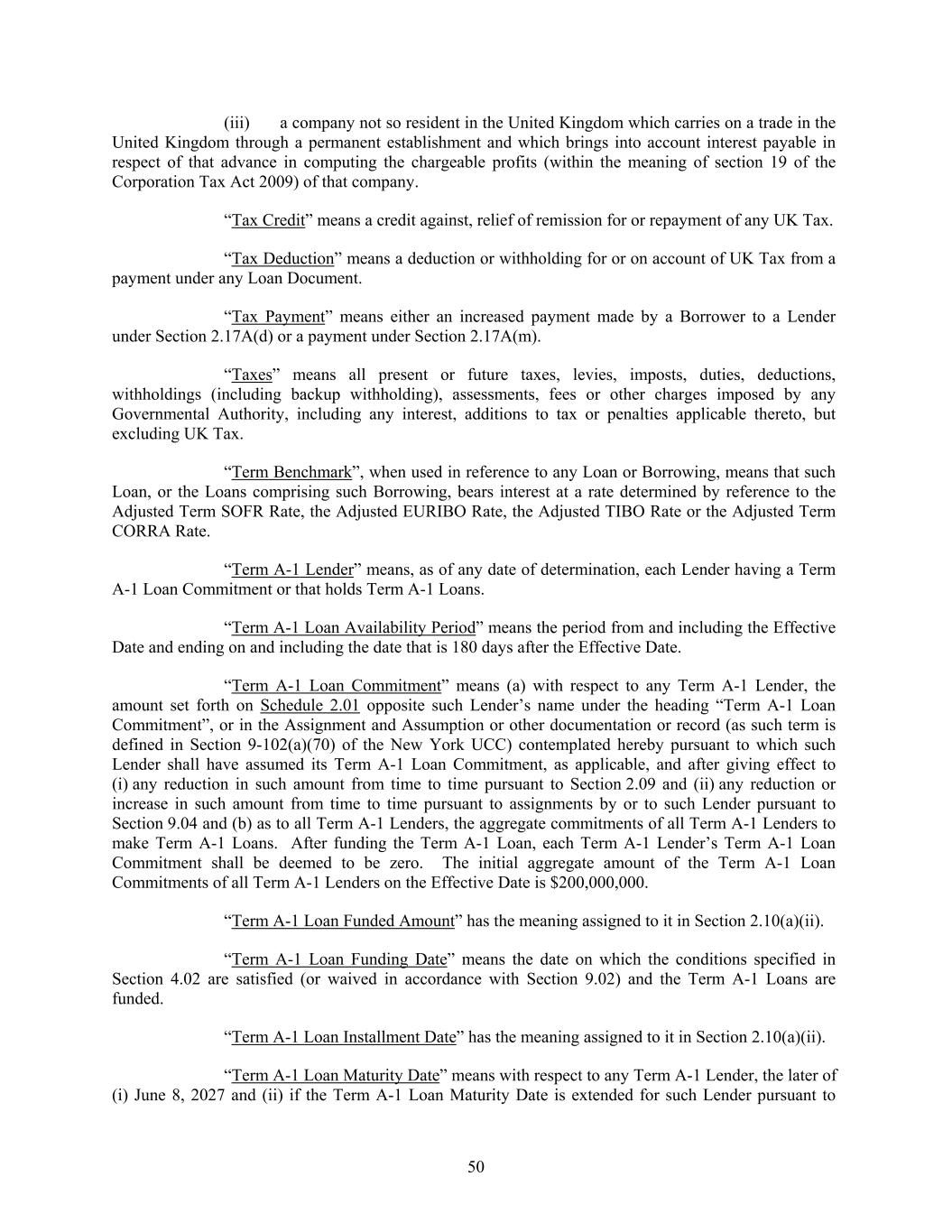 (iii) a company not so resident in the United Kingdom which carries on a trade in the United Kingdom through a permanent establishment and which brings into account interest payable in respect of that advance in computing the chargeable profits (within the meaning of section 19 of the Corporation Tax Act 2009) of that company. “Tax Credit” means a credit against, relief of remission for or repayment of any UK Tax. “Tax Deduction” means a deduction or withholding for or on account of UK Tax from a payment under any Loan Document. “Tax Payment” means either an increased payment made by a Borrower to a Lender under Section 2.17A(d) or a payment under Section 2.17A(m). “Taxes” means all present or future taxes, levies, imposts, duties, deductions, withholdings (including backup withholding), assessments, fees or other charges imposed by any Governmental Authority, including any interest, additions to tax or penalties applicable thereto, but excluding UK Tax. “Term Benchmark”, when used in reference to any Loan or Borrowing, means that such Loan, or the Loans comprising such Borrowing, bears interest at a rate determined by reference to the Adjusted Term SOFR Rate, the Adjusted EURIBO Rate, the Adjusted TIBO Rate or the Adjusted Term CORRA Rate. “Term A-1 Lender” means, as of any date of determination, each Lender having a Term A-1 Loan Commitment or that holds Term A-1 Loans. “Term A-1 Loan Availability Period” means the period from and including the Effective Date and ending on and including the date that is 180 days after the Effective Date. “Term A-1 Loan Commitment” means (a) with respect to any Term A-1 Lender, the amount set forth on Schedule 2.01 opposite such Lender’s name under the heading “Term A-1 Loan Commitment”, or in the Assignment and Assumption or other documentation or record (as such term is defined in Section 9-102(a)(70) of the New York UCC) contemplated hereby pursuant to which such Lender shall have assumed its Term A-1 Loan Commitment, as applicable, and after giving effect to (i) any reduction in such amount from time to time pursuant to Section 2.09 and (ii) any reduction or increase in such amount from time to time pursuant to assignments by or to such Lender pursuant to Section 9.04 and (b) as to all Term A-1 Lenders, the aggregate commitments of all Term A-1 Lenders to make Term A-1 Loans. After funding the Term A-1 Loan, each Term A-1 Lender’s Term A-1 Loan Commitment shall be deemed to be zero. The initial aggregate amount of the Term A-1 Loan Commitments of all Term A-1 Lenders on the Effective Date is $200,000,000. “Term A-1 Loan Funded Amount” has the meaning assigned to it in Section 2.10(a)(ii). “Term A-1 Loan Funding Date” means the date on which the conditions specified in Section 4.02 are satisfied (or waived in accordance with Section 9.02) and the Term A-1 Loans are funded. “Term A-1 Loan Installment Date” has the meaning assigned to it in Section 2.10(a)(ii). “Term A-1 Loan Maturity Date” means with respect to any Term A-1 Lender, the later of (i) June 8, 2027 and (ii) if the Term A-1 Loan Maturity Date is extended for such Lender pursuant to 50