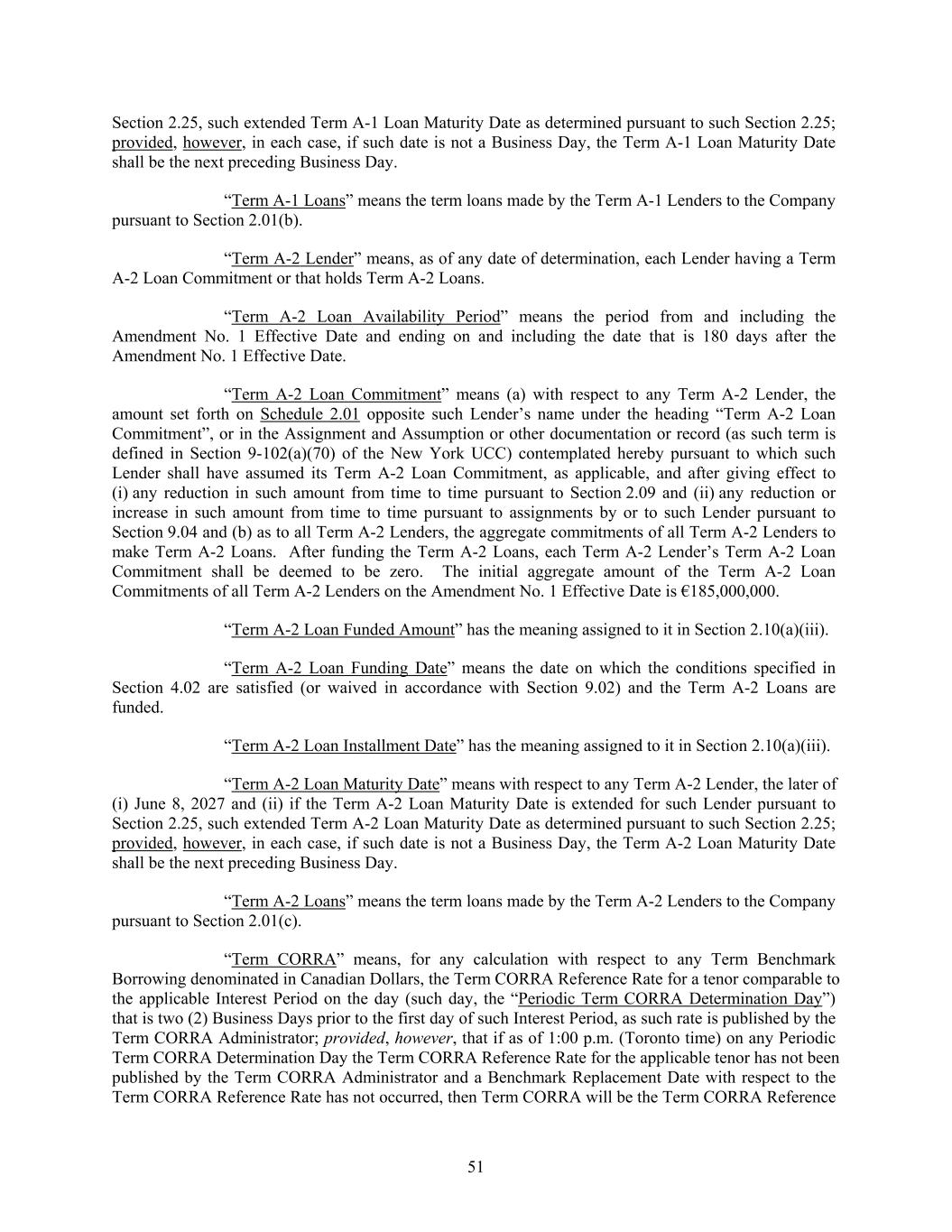 Section 2.25, such extended Term A-1 Loan Maturity Date as determined pursuant to such Section 2.25; provided, however, in each case, if such date is not a Business Day, the Term A-1 Loan Maturity Date shall be the next preceding Business Day. “Term A-1 Loans” means the term loans made by the Term A-1 Lenders to the Company pursuant to Section 2.01(b). “Term A-2 Lender” means, as of any date of determination, each Lender having a Term A-2 Loan Commitment or that holds Term A-2 Loans. “Term A-2 Loan Availability Period” means the period from and including the Amendment No. 1 Effective Date and ending on and including the date that is 180 days after the Amendment No. 1 Effective Date. “Term A-2 Loan Commitment” means (a) with respect to any Term A-2 Lender, the amount set forth on Schedule 2.01 opposite such Lender’s name under the heading “Term A-2 Loan Commitment”, or in the Assignment and Assumption or other documentation or record (as such term is defined in Section 9-102(a)(70) of the New York UCC) contemplated hereby pursuant to which such Lender shall have assumed its Term A-2 Loan Commitment, as applicable, and after giving effect to (i) any reduction in such amount from time to time pursuant to Section 2.09 and (ii) any reduction or increase in such amount from time to time pursuant to assignments by or to such Lender pursuant to Section 9.04 and (b) as to all Term A-2 Lenders, the aggregate commitments of all Term A-2 Lenders to make Term A-2 Loans. After funding the Term A-2 Loans, each Term A-2 Lender’s Term A-2 Loan Commitment shall be deemed to be zero. The initial aggregate amount of the Term A-2 Loan Commitments of all Term A-2 Lenders on the Amendment No. 1 Effective Date is €185,000,000. “Term A-2 Loan Funded Amount” has the meaning assigned to it in Section 2.10(a)(iii). “Term A-2 Loan Funding Date” means the date on which the conditions specified in Section 4.02 are satisfied (or waived in accordance with Section 9.02) and the Term A-2 Loans are funded. “Term A-2 Loan Installment Date” has the meaning assigned to it in Section 2.10(a)(iii). “Term A-2 Loan Maturity Date” means with respect to any Term A-2 Lender, the later of (i) June 8, 2027 and (ii) if the Term A-2 Loan Maturity Date is extended for such Lender pursuant to Section 2.25, such extended Term A-2 Loan Maturity Date as determined pursuant to such Section 2.25; provided, however, in each case, if such date is not a Business Day, the Term A-2 Loan Maturity Date shall be the next preceding Business Day. “Term A-2 Loans” means the term loans made by the Term A-2 Lenders to the Company pursuant to Section 2.01(c). “Term CORRA” means, for any calculation with respect to any Term Benchmark Borrowing denominated in Canadian Dollars, the Term CORRA Reference Rate for a tenor comparable to the applicable Interest Period on the day (such day, the “Periodic Term CORRA Determination Day”) that is two (2) Business Days prior to the first day of such Interest Period, as such rate is published by the Term CORRA Administrator; provided, however, that if as of 1:00 p.m. (Toronto time) on any Periodic Term CORRA Determination Day the Term CORRA Reference Rate for the applicable tenor has not been published by the Term CORRA Administrator and a Benchmark Replacement Date with respect to the Term CORRA Reference Rate has not occurred, then Term CORRA will be the Term CORRA Reference 51