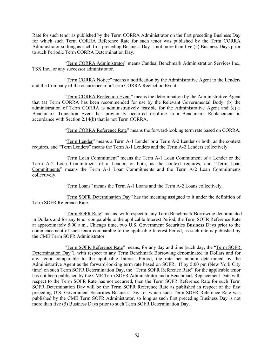 Rate for such tenor as published by the Term CORRA Administrator on the first preceding Business Day for which such Term CORRA Reference Rate for such tenor was published by the Term CORRA Administrator so long as such first preceding Business Day is not more than five (5) Business Days prior to such Periodic Term CORRA Determination Day. “Term CORRA Administrator” means Candeal Benchmark Administration Services Inc., TSX Inc., or any successor administrator. “Term CORRA Notice” means a notification by the Administrative Agent to the Lenders and the Company of the occurrence of a Term CORRA Reelection Event. “Term CORRA Reelection Event” means the determination by the Administrative Agent that (a) Term CORRA has been recommended for use by the Relevant Governmental Body, (b) the administration of Term CORRA is administratively feasible for the Administrative Agent and (c) a Benchmark Transition Event has previously occurred resulting in a Benchmark Replacement in accordance with Section 2.14(b) that is not Term CORRA. “Term CORRA Reference Rate” means the forward-looking term rate based on CORRA. “Term Lender” means a Term A-1 Lender or a Term A-2 Lender or both, as the context requires, and “Term Lenders” means the Term A-1 Lenders and the Term A-2 Lenders collectively. “Term Loan Commitment” means the Term A-1 Loan Commitment of a Lender or the Term A-2 Loan Commitment of a Lender, or both, as the context requires, and “Term Loan Commitments” means the Term A-1 Loan Commitments and the Term A-2 Loan Commitments collectively. “Term Loans” means the Term A-1 Loans and the Term A-2 Loans collectively. “Term SOFR Determination Day” has the meaning assigned to it under the definition of Term SOFR Reference Rate. “Term SOFR Rate” means, with respect to any Term Benchmark Borrowing denominated in Dollars and for any tenor comparable to the applicable Interest Period, the Term SOFR Reference Rate at approximately 5:00 a.m., Chicago time, two U.S. Government Securities Business Days prior to the commencement of such tenor comparable to the applicable Interest Period, as such rate is published by the CME Term SOFR Administrator. “Term SOFR Reference Rate” means, for any day and time (such day, the “Term SOFR Determination Day”), with respect to any Term Benchmark Borrowing denominated in Dollars and for any tenor comparable to the applicable Interest Period, the rate per annum determined by the Administrative Agent as the forward-looking term rate based on SOFR. If by 5:00 pm (New York City time) on such Term SOFR Determination Day, the “Term SOFR Reference Rate” for the applicable tenor has not been published by the CME Term SOFR Administrator and a Benchmark Replacement Date with respect to the Term SOFR Rate has not occurred, then the Term SOFR Reference Rate for such Term SOFR Determination Day will be the Term SOFR Reference Rate as published in respect of the first preceding U.S. Government Securities Business Day for which such Term SOFR Reference Rate was published by the CME Term SOFR Administrator, so long as such first preceding Business Day is not more than five (5) Business Days prior to such Term SOFR Determination Day. 52