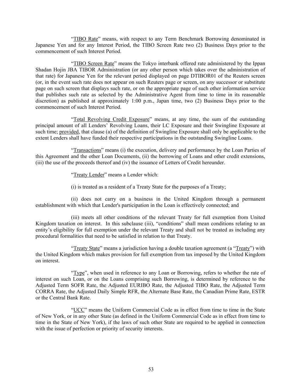 “TIBO Rate” means, with respect to any Term Benchmark Borrowing denominated in Japanese Yen and for any Interest Period, the TIBO Screen Rate two (2) Business Days prior to the commencement of such Interest Period. “TIBO Screen Rate” means the Tokyo interbank offered rate administered by the Ippan Shadan Hojin JBA TIBOR Administration (or any other person which takes over the administration of that rate) for Japanese Yen for the relevant period displayed on page DTIBOR01 of the Reuters screen (or, in the event such rate does not appear on such Reuters page or screen, on any successor or substitute page on such screen that displays such rate, or on the appropriate page of such other information service that publishes such rate as selected by the Administrative Agent from time to time in its reasonable discretion) as published at approximately 1:00 p.m., Japan time, two (2) Business Days prior to the commencement of such Interest Period. “Total Revolving Credit Exposure” means, at any time, the sum of the outstanding principal amount of all Lenders’ Revolving Loans, their LC Exposure and their Swingline Exposure at such time; provided, that clause (a) of the definition of Swingline Exposure shall only be applicable to the extent Lenders shall have funded their respective participations in the outstanding Swingline Loans. “Transactions” means (i) the execution, delivery and performance by the Loan Parties of this Agreement and the other Loan Documents, (ii) the borrowing of Loans and other credit extensions, (iii) the use of the proceeds thereof and (iv) the issuance of Letters of Credit hereunder. “Treaty Lender” means a Lender which: (i) is treated as a resident of a Treaty State for the purposes of a Treaty; (ii) does not carry on a business in the United Kingdom through a permanent establishment with which that Lender's participation in the Loan is effectively connected; and (iii) meets all other conditions of the relevant Treaty for full exemption from United Kingdom taxation on interest. In this subclause (iii), “conditions” shall mean conditions relating to an entity’s eligibility for full exemption under the relevant Treaty and shall not be treated as including any procedural formalities that need to be satisfied in relation to that Treaty. “Treaty State” means a jurisdiction having a double taxation agreement (a “Treaty”) with the United Kingdom which makes provision for full exemption from tax imposed by the United Kingdom on interest. “Type”, when used in reference to any Loan or Borrowing, refers to whether the rate of interest on such Loan, or on the Loans comprising such Borrowing, is determined by reference to the Adjusted Term SOFR Rate, the Adjusted EURIBO Rate, the Adjusted TIBO Rate, the Adjusted Term CORRA Rate, the Adjusted Daily Simple RFR, the Alternate Base Rate, the Canadian Prime Rate, ESTR or the Central Bank Rate. “UCC” means the Uniform Commercial Code as in effect from time to time in the State of New York, or in any other State (as defined in the Uniform Commercial Code as in effect from time to time in the State of New York), if the laws of such other State are required to be applied in connection with the issue of perfection or priority of security interests. 53