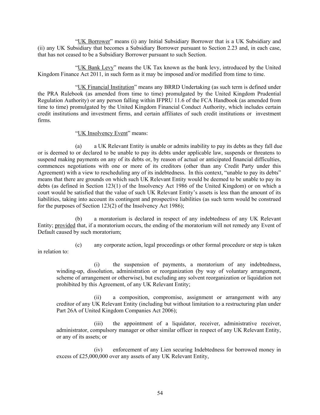 “UK Borrower” means (i) any Initial Subsidiary Borrower that is a UK Subsidiary and (ii) any UK Subsidiary that becomes a Subsidiary Borrower pursuant to Section 2.23 and, in each case, that has not ceased to be a Subsidiary Borrower pursuant to such Section. “UK Bank Levy” means the UK Tax known as the bank levy, introduced by the United Kingdom Finance Act 2011, in such form as it may be imposed and/or modified from time to time. “UK Financial Institution” means any BRRD Undertaking (as such term is defined under the PRA Rulebook (as amended from time to time) promulgated by the United Kingdom Prudential Regulation Authority) or any person falling within IFPRU 11.6 of the FCA Handbook (as amended from time to time) promulgated by the United Kingdom Financial Conduct Authority, which includes certain credit institutions and investment firms, and certain affiliates of such credit institutions or investment firms. “UK Insolvency Event” means: (a) a UK Relevant Entity is unable or admits inability to pay its debts as they fall due or is deemed to or declared to be unable to pay its debts under applicable law, suspends or threatens to suspend making payments on any of its debts or, by reason of actual or anticipated financial difficulties, commences negotiations with one or more of its creditors (other than any Credit Party under this Agreement) with a view to rescheduling any of its indebtedness. In this context, “unable to pay its debts” means that there are grounds on which such UK Relevant Entity would be deemed to be unable to pay its debts (as defined in Section 123(1) of the Insolvency Act 1986 of the United Kingdom) or on which a court would be satisfied that the value of such UK Relevant Entity’s assets is less than the amount of its liabilities, taking into account its contingent and prospective liabilities (as such term would be construed for the purposes of Section 123(2) of the Insolvency Act 1986); (b) a moratorium is declared in respect of any indebtedness of any UK Relevant Entity; provided that, if a moratorium occurs, the ending of the moratorium will not remedy any Event of Default caused by such moratorium; (c) any corporate action, legal proceedings or other formal procedure or step is taken in relation to: (i) the suspension of payments, a moratorium of any indebtedness, winding-up, dissolution, administration or reorganization (by way of voluntary arrangement, scheme of arrangement or otherwise), but excluding any solvent reorganization or liquidation not prohibited by this Agreement, of any UK Relevant Entity; (ii) a composition, compromise, assignment or arrangement with any creditor of any UK Relevant Entity (including but without limitation to a restructuring plan under Part 26A of United Kingdom Companies Act 2006); (iii) the appointment of a liquidator, receiver, administrative receiver, administrator, compulsory manager or other similar officer in respect of any UK Relevant Entity, or any of its assets; or (iv) enforcement of any Lien securing Indebtedness for borrowed money in excess of £25,000,000 over any assets of any UK Relevant Entity, 54