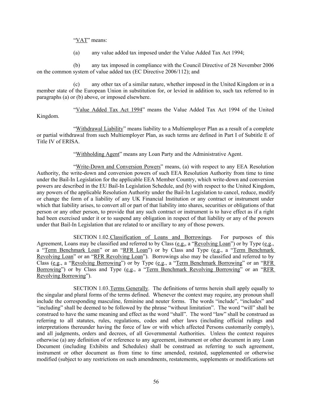 “VAT” means: (a) any value added tax imposed under the Value Added Tax Act 1994; (b) any tax imposed in compliance with the Council Directive of 28 November 2006 on the common system of value added tax (EC Directive 2006/112); and (c) any other tax of a similar nature, whether imposed in the United Kingdom or in a member state of the European Union in substitution for, or levied in addition to, such tax referred to in paragraphs (a) or (b) above, or imposed elsewhere. “Value Added Tax Act 1994” means the Value Added Tax Act 1994 of the United Kingdom. “Withdrawal Liability” means liability to a Multiemployer Plan as a result of a complete or partial withdrawal from such Multiemployer Plan, as such terms are defined in Part I of Subtitle E of Title IV of ERISA. “Withholding Agent” means any Loan Party and the Administrative Agent. “Write-Down and Conversion Powers” means, (a) with respect to any EEA Resolution Authority, the write-down and conversion powers of such EEA Resolution Authority from time to time under the Bail-In Legislation for the applicable EEA Member Country, which write-down and conversion powers are described in the EU Bail-In Legislation Schedule, and (b) with respect to the United Kingdom, any powers of the applicable Resolution Authority under the Bail-In Legislation to cancel, reduce, modify or change the form of a liability of any UK Financial Institution or any contract or instrument under which that liability arises, to convert all or part of that liability into shares, securities or obligations of that person or any other person, to provide that any such contract or instrument is to have effect as if a right had been exercised under it or to suspend any obligation in respect of that liability or any of the powers under that Bail-In Legislation that are related to or ancillary to any of those powers. SECTION 1.02.Classification of Loans and Borrowings. For purposes of this Agreement, Loans may be classified and referred to by Class (e.g., a “Revolving Loan”) or by Type (e.g., a “Term Benchmark Loan” or an “RFR Loan”) or by Class and Type (e.g., a “Term Benchmark Revolving Loan” or an “RFR Revolving Loan”). Borrowings also may be classified and referred to by Class (e.g., a “Revolving Borrowing”) or by Type (e.g., a “Term Benchmark Borrowing” or an “RFR Borrowing”) or by Class and Type (e.g., a “Term Benchmark Revolving Borrowing” or an “RFR Revolving Borrowing”). SECTION 1.03.Terms Generally. The definitions of terms herein shall apply equally to the singular and plural forms of the terms defined. Whenever the context may require, any pronoun shall include the corresponding masculine, feminine and neuter forms. The words “include”, “includes” and “including” shall be deemed to be followed by the phrase “without limitation”. The word “will” shall be construed to have the same meaning and effect as the word “shall”. The word “law” shall be construed as referring to all statutes, rules, regulations, codes and other laws (including official rulings and interpretations thereunder having the force of law or with which affected Persons customarily comply), and all judgments, orders and decrees, of all Governmental Authorities. Unless the context requires otherwise (a) any definition of or reference to any agreement, instrument or other document in any Loan Document (including Exhibits and Schedules) shall be construed as referring to such agreement, instrument or other document as from time to time amended, restated, supplemented or otherwise modified (subject to any restrictions on such amendments, restatements, supplements or modifications set 56
