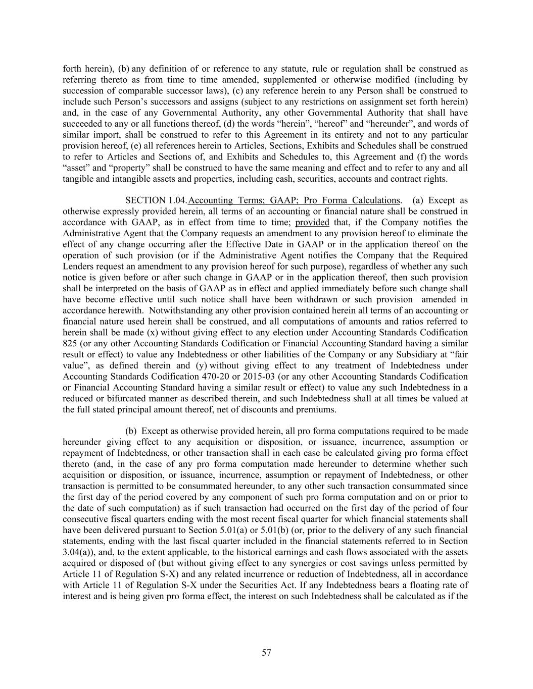 forth herein), (b) any definition of or reference to any statute, rule or regulation shall be construed as referring thereto as from time to time amended, supplemented or otherwise modified (including by succession of comparable successor laws), (c) any reference herein to any Person shall be construed to include such Person’s successors and assigns (subject to any restrictions on assignment set forth herein) and, in the case of any Governmental Authority, any other Governmental Authority that shall have succeeded to any or all functions thereof, (d) the words “herein”, “hereof” and “hereunder”, and words of similar import, shall be construed to refer to this Agreement in its entirety and not to any particular provision hereof, (e) all references herein to Articles, Sections, Exhibits and Schedules shall be construed to refer to Articles and Sections of, and Exhibits and Schedules to, this Agreement and (f) the words “asset” and “property” shall be construed to have the same meaning and effect and to refer to any and all tangible and intangible assets and properties, including cash, securities, accounts and contract rights. SECTION 1.04.Accounting Terms; GAAP; Pro Forma Calculations. (a) Except as otherwise expressly provided herein, all terms of an accounting or financial nature shall be construed in accordance with GAAP, as in effect from time to time; provided that, if the Company notifies the Administrative Agent that the Company requests an amendment to any provision hereof to eliminate the effect of any change occurring after the Effective Date in GAAP or in the application thereof on the operation of such provision (or if the Administrative Agent notifies the Company that the Required Lenders request an amendment to any provision hereof for such purpose), regardless of whether any such notice is given before or after such change in GAAP or in the application thereof, then such provision shall be interpreted on the basis of GAAP as in effect and applied immediately before such change shall have become effective until such notice shall have been withdrawn or such provision amended in accordance herewith. Notwithstanding any other provision contained herein all terms of an accounting or financial nature used herein shall be construed, and all computations of amounts and ratios referred to herein shall be made (x) without giving effect to any election under Accounting Standards Codification 825 (or any other Accounting Standards Codification or Financial Accounting Standard having a similar result or effect) to value any Indebtedness or other liabilities of the Company or any Subsidiary at “fair value”, as defined therein and (y) without giving effect to any treatment of Indebtedness under Accounting Standards Codification 470-20 or 2015-03 (or any other Accounting Standards Codification or Financial Accounting Standard having a similar result or effect) to value any such Indebtedness in a reduced or bifurcated manner as described therein, and such Indebtedness shall at all times be valued at the full stated principal amount thereof, net of discounts and premiums. (b) Except as otherwise provided herein, all pro forma computations required to be made hereunder giving effect to any acquisition or disposition, or issuance, incurrence, assumption or repayment of Indebtedness, or other transaction shall in each case be calculated giving pro forma effect thereto (and, in the case of any pro forma computation made hereunder to determine whether such acquisition or disposition, or issuance, incurrence, assumption or repayment of Indebtedness, or other transaction is permitted to be consummated hereunder, to any other such transaction consummated since the first day of the period covered by any component of such pro forma computation and on or prior to the date of such computation) as if such transaction had occurred on the first day of the period of four consecutive fiscal quarters ending with the most recent fiscal quarter for which financial statements shall have been delivered pursuant to Section 5.01(a) or 5.01(b) (or, prior to the delivery of any such financial statements, ending with the last fiscal quarter included in the financial statements referred to in Section 3.04(a)), and, to the extent applicable, to the historical earnings and cash flows associated with the assets acquired or disposed of (but without giving effect to any synergies or cost savings unless permitted by Article 11 of Regulation S-X) and any related incurrence or reduction of Indebtedness, all in accordance with Article 11 of Regulation S-X under the Securities Act. If any Indebtedness bears a floating rate of interest and is being given pro forma effect, the interest on such Indebtedness shall be calculated as if the 57