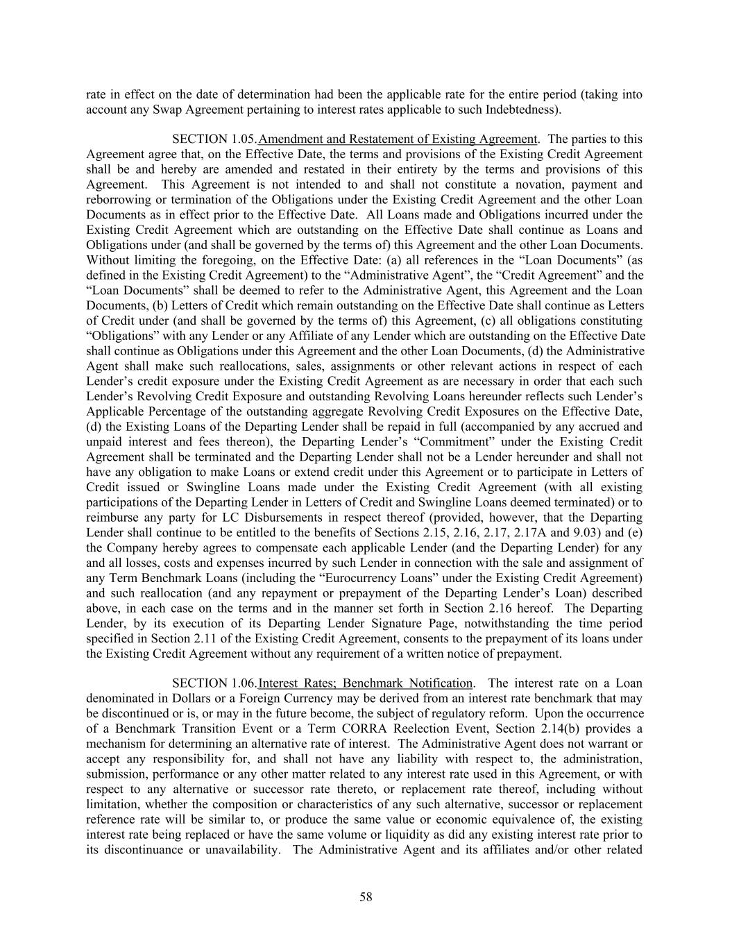 rate in effect on the date of determination had been the applicable rate for the entire period (taking into account any Swap Agreement pertaining to interest rates applicable to such Indebtedness). SECTION 1.05.Amendment and Restatement of Existing Agreement. The parties to this Agreement agree that, on the Effective Date, the terms and provisions of the Existing Credit Agreement shall be and hereby are amended and restated in their entirety by the terms and provisions of this Agreement. This Agreement is not intended to and shall not constitute a novation, payment and reborrowing or termination of the Obligations under the Existing Credit Agreement and the other Loan Documents as in effect prior to the Effective Date. All Loans made and Obligations incurred under the Existing Credit Agreement which are outstanding on the Effective Date shall continue as Loans and Obligations under (and shall be governed by the terms of) this Agreement and the other Loan Documents. Without limiting the foregoing, on the Effective Date: (a) all references in the “Loan Documents” (as defined in the Existing Credit Agreement) to the “Administrative Agent”, the “Credit Agreement” and the “Loan Documents” shall be deemed to refer to the Administrative Agent, this Agreement and the Loan Documents, (b) Letters of Credit which remain outstanding on the Effective Date shall continue as Letters of Credit under (and shall be governed by the terms of) this Agreement, (c) all obligations constituting “Obligations” with any Lender or any Affiliate of any Lender which are outstanding on the Effective Date shall continue as Obligations under this Agreement and the other Loan Documents, (d) the Administrative Agent shall make such reallocations, sales, assignments or other relevant actions in respect of each Lender’s credit exposure under the Existing Credit Agreement as are necessary in order that each such Lender’s Revolving Credit Exposure and outstanding Revolving Loans hereunder reflects such Lender’s Applicable Percentage of the outstanding aggregate Revolving Credit Exposures on the Effective Date, (d) the Existing Loans of the Departing Lender shall be repaid in full (accompanied by any accrued and unpaid interest and fees thereon), the Departing Lender’s “Commitment” under the Existing Credit Agreement shall be terminated and the Departing Lender shall not be a Lender hereunder and shall not have any obligation to make Loans or extend credit under this Agreement or to participate in Letters of Credit issued or Swingline Loans made under the Existing Credit Agreement (with all existing participations of the Departing Lender in Letters of Credit and Swingline Loans deemed terminated) or to reimburse any party for LC Disbursements in respect thereof (provided, however, that the Departing Lender shall continue to be entitled to the benefits of Sections 2.15, 2.16, 2.17, 2.17A and 9.03) and (e) the Company hereby agrees to compensate each applicable Lender (and the Departing Lender) for any and all losses, costs and expenses incurred by such Lender in connection with the sale and assignment of any Term Benchmark Loans (including the “Eurocurrency Loans” under the Existing Credit Agreement) and such reallocation (and any repayment or prepayment of the Departing Lender’s Loan) described above, in each case on the terms and in the manner set forth in Section 2.16 hereof. The Departing Lender, by its execution of its Departing Lender Signature Page, notwithstanding the time period specified in Section 2.11 of the Existing Credit Agreement, consents to the prepayment of its loans under the Existing Credit Agreement without any requirement of a written notice of prepayment. SECTION 1.06.Interest Rates; Benchmark Notification. The interest rate on a Loan denominated in Dollars or a Foreign Currency may be derived from an interest rate benchmark that may be discontinued or is, or may in the future become, the subject of regulatory reform. Upon the occurrence of a Benchmark Transition Event or a Term CORRA Reelection Event, Section 2.14(b) provides a mechanism for determining an alternative rate of interest. The Administrative Agent does not warrant or accept any responsibility for, and shall not have any liability with respect to, the administration, submission, performance or any other matter related to any interest rate used in this Agreement, or with respect to any alternative or successor rate thereto, or replacement rate thereof, including without limitation, whether the composition or characteristics of any such alternative, successor or replacement reference rate will be similar to, or produce the same value or economic equivalence of, the existing interest rate being replaced or have the same volume or liquidity as did any existing interest rate prior to its discontinuance or unavailability. The Administrative Agent and its affiliates and/or other related 58