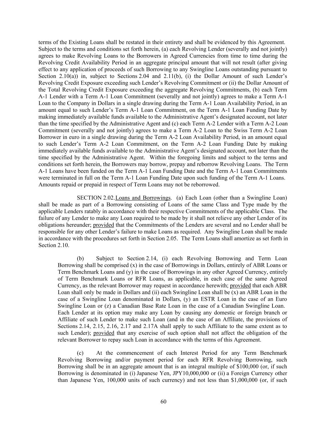 terms of the Existing Loans shall be restated in their entirety and shall be evidenced by this Agreement. Subject to the terms and conditions set forth herein, (a) each Revolving Lender (severally and not jointly) agrees to make Revolving Loans to the Borrowers in Agreed Currencies from time to time during the Revolving Credit Availability Period in an aggregate principal amount that will not result (after giving effect to any application of proceeds of such Borrowing to any Swingline Loans outstanding pursuant to Section 2.10(a)) in, subject to Sections 2.04 and 2.11(b), (i) the Dollar Amount of such Lender’s Revolving Credit Exposure exceeding such Lender’s Revolving Commitment or (ii) the Dollar Amount of the Total Revolving Credit Exposure exceeding the aggregate Revolving Commitments, (b) each Term A-1 Lender with a Term A-1 Loan Commitment (severally and not jointly) agrees to make a Term A-1 Loan to the Company in Dollars in a single drawing during the Term A-1 Loan Availability Period, in an amount equal to such Lender’s Term A-1 Loan Commitment, on the Term A-1 Loan Funding Date by making immediately available funds available to the Administrative Agent’s designated account, not later than the time specified by the Administrative Agent and (c) each Term A-2 Lender with a Term A-2 Loan Commitment (severally and not jointly) agrees to make a Term A-2 Loan to the Swiss Term A-2 Loan Borrower in euro in a single drawing during the Term A-2 Loan Availability Period, in an amount equal to such Lender’s Term A-2 Loan Commitment, on the Term A-2 Loan Funding Date by making immediately available funds available to the Administrative Agent’s designated account, not later than the time specified by the Administrative Agent. Within the foregoing limits and subject to the terms and conditions set forth herein, the Borrowers may borrow, prepay and reborrow Revolving Loans. The Term A-1 Loans have been funded on the Term A-1 Loan Funding Date and the Term A-1 Loan Commitments were terminated in full on the Term A-1 Loan Funding Date upon such funding of the Term A-1 Loans. Amounts repaid or prepaid in respect of Term Loans may not be reborrowed. SECTION 2.02.Loans and Borrowings. (a) Each Loan (other than a Swingline Loan) shall be made as part of a Borrowing consisting of Loans of the same Class and Type made by the applicable Lenders ratably in accordance with their respective Commitments of the applicable Class. The failure of any Lender to make any Loan required to be made by it shall not relieve any other Lender of its obligations hereunder; provided that the Commitments of the Lenders are several and no Lender shall be responsible for any other Lender’s failure to make Loans as required. Any Swingline Loan shall be made in accordance with the procedures set forth in Section 2.05. The Term Loans shall amortize as set forth in Section 2.10. (b) Subject to Section 2.14, (i) each Revolving Borrowing and Term Loan Borrowing shall be comprised (x) in the case of Borrowings in Dollars, entirely of ABR Loans or Term Benchmark Loans and (y) in the case of Borrowings in any other Agreed Currency, entirely of Term Benchmark Loans or RFR Loans, as applicable, in each case of the same Agreed Currency, as the relevant Borrower may request in accordance herewith; provided that each ABR Loan shall only be made in Dollars and (ii) each Swingline Loan shall be (x) an ABR Loan in the case of a Swingline Loan denominated in Dollars, (y) an ESTR Loan in the case of an Euro Swingline Loan or (z) a Canadian Base Rate Loan in the case of a Canadian Swingline Loan. Each Lender at its option may make any Loan by causing any domestic or foreign branch or Affiliate of such Lender to make such Loan (and in the case of an Affiliate, the provisions of Sections 2.14, 2.15, 2.16, 2.17 and 2.17A shall apply to such Affiliate to the same extent as to such Lender); provided that any exercise of such option shall not affect the obligation of the relevant Borrower to repay such Loan in accordance with the terms of this Agreement. (c) At the commencement of each Interest Period for any Term Benchmark Revolving Borrowing and/or payment period for each RFR Revolving Borrowing, such Borrowing shall be in an aggregate amount that is an integral multiple of $100,000 (or, if such Borrowing is denominated in (i) Japanese Yen, JPY10,000,000 or (ii) a Foreign Currency other than Japanese Yen, 100,000 units of such currency) and not less than $1,000,000 (or, if such 60