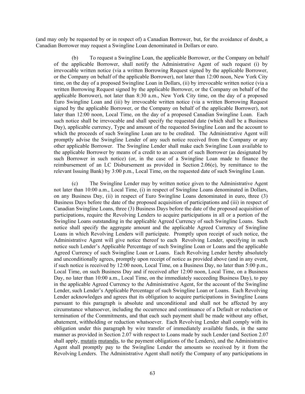 (and may only be requested by or in respect of) a Canadian Borrower, but, for the avoidance of doubt, a Canadian Borrower may request a Swingline Loan denominated in Dollars or euro. (b) To request a Swingline Loan, the applicable Borrower, or the Company on behalf of the applicable Borrower, shall notify the Administrative Agent of such request (i) by irrevocable written notice (via a written Borrowing Request signed by the applicable Borrower, or the Company on behalf of the applicable Borrower), not later than 12:00 noon, New York City time, on the day of a proposed Swingline Loan in Dollars, (ii) by irrevocable written notice (via a written Borrowing Request signed by the applicable Borrower, or the Company on behalf of the applicable Borrower), not later than 8:30 a.m., New York City time, on the day of a proposed Euro Swingline Loan and (iii) by irrevocable written notice (via a written Borrowing Request signed by the applicable Borrower, or the Company on behalf of the applicable Borrower), not later than 12:00 noon, Local Time, on the day of a proposed Canadian Swingline Loan. Each such notice shall be irrevocable and shall specify the requested date (which shall be a Business Day), applicable currency, Type and amount of the requested Swingline Loan and the account to which the proceeds of such Swingline Loan are to be credited. The Administrative Agent will promptly advise the Swingline Lender of any such notice received from the Company or any other applicable Borrower. The Swingline Lender shall make each Swingline Loan available to the applicable Borrower by means of a credit to an account of such Borrower (as designated by such Borrower in such notice) (or, in the case of a Swingline Loan made to finance the reimbursement of an LC Disbursement as provided in Section 2.06(e), by remittance to the relevant Issuing Bank) by 3:00 p.m., Local Time, on the requested date of such Swingline Loan. (c) The Swingline Lender may by written notice given to the Administrative Agent not later than 10:00 a.m., Local Time, (i) in respect of Swingline Loans denominated in Dollars, on any Business Day, (ii) in respect of Euro Swingline Loans denominated in euro, three (3) Business Days before the date of the proposed acquisition of participations and (iii) in respect of Canadian Swingline Loans, three (3) Business Days before the date of the proposed acquisition of participations, require the Revolving Lenders to acquire participations in all or a portion of the Swingline Loans outstanding in the applicable Agreed Currency of such Swingline Loans. Such notice shall specify the aggregate amount and the applicable Agreed Currency of Swingline Loans in which Revolving Lenders will participate. Promptly upon receipt of such notice, the Administrative Agent will give notice thereof to each Revolving Lender, specifying in such notice such Lender’s Applicable Percentage of such Swingline Loan or Loans and the applicable Agreed Currency of such Swingline Loan or Loans. Each Revolving Lender hereby absolutely and unconditionally agrees, promptly upon receipt of notice as provided above (and in any event, if such notice is received by 12:00 noon, Local Time, on a Business Day, no later than 5:00 p.m., Local Time, on such Business Day and if received after 12:00 noon, Local Time, on a Business Day, no later than 10:00 a.m., Local Time, on the immediately succeeding Business Day), to pay in the applicable Agreed Currency to the Administrative Agent, for the account of the Swingline Lender, such Lender’s Applicable Percentage of such Swingline Loan or Loans. Each Revolving Lender acknowledges and agrees that its obligation to acquire participations in Swingline Loans pursuant to this paragraph is absolute and unconditional and shall not be affected by any circumstance whatsoever, including the occurrence and continuance of a Default or reduction or termination of the Commitments, and that each such payment shall be made without any offset, abatement, withholding or reduction whatsoever. Each Revolving Lender shall comply with its obligation under this paragraph by wire transfer of immediately available funds, in the same manner as provided in Section 2.07 with respect to Loans made by such Lender (and Section 2.07 shall apply, mutatis mutandis, to the payment obligations of the Lenders), and the Administrative Agent shall promptly pay to the Swingline Lender the amounts so received by it from the Revolving Lenders. The Administrative Agent shall notify the Company of any participations in 63