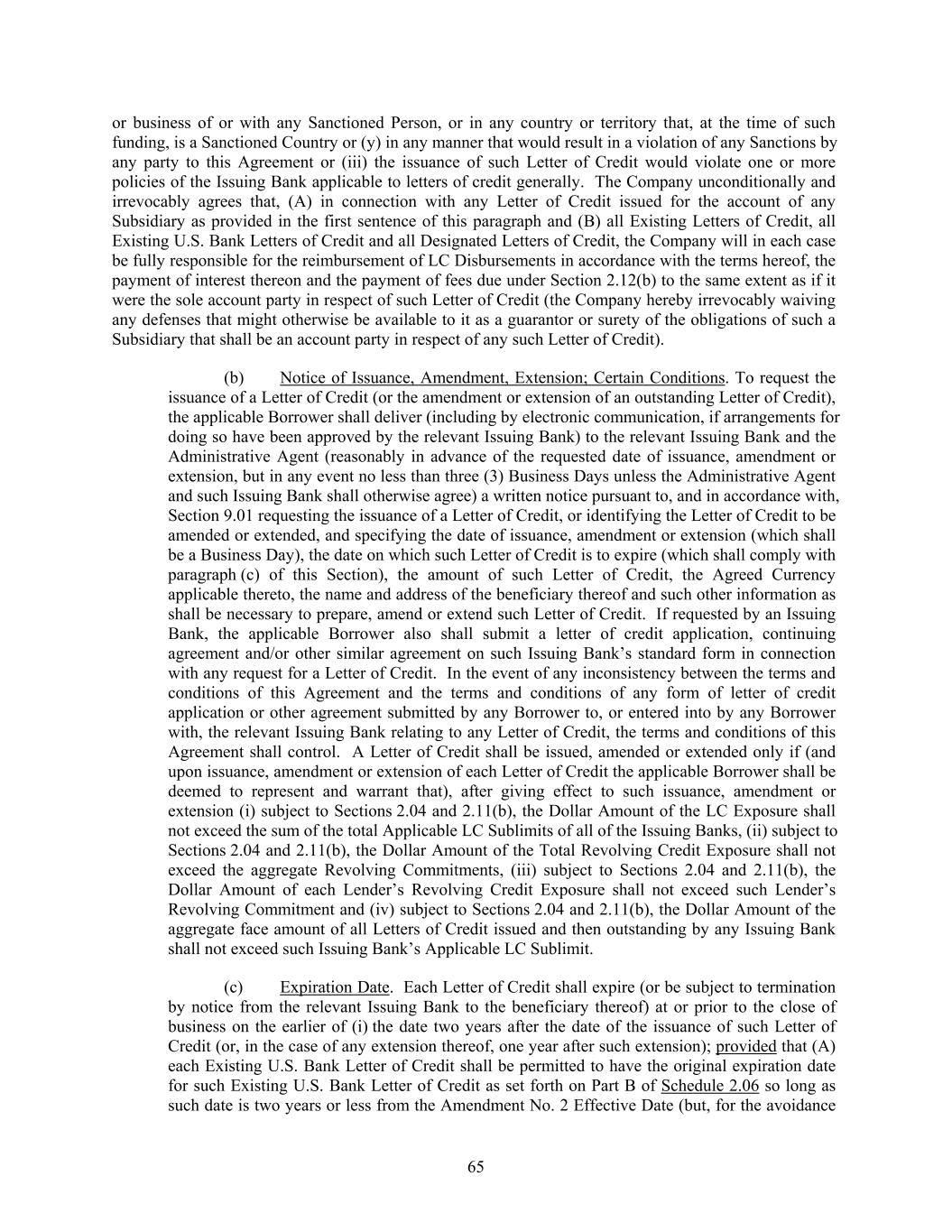 or business of or with any Sanctioned Person, or in any country or territory that, at the time of such funding, is a Sanctioned Country or (y) in any manner that would result in a violation of any Sanctions by any party to this Agreement or (iii) the issuance of such Letter of Credit would violate one or more policies of the Issuing Bank applicable to letters of credit generally. The Company unconditionally and irrevocably agrees that, (A) in connection with any Letter of Credit issued for the account of any Subsidiary as provided in the first sentence of this paragraph and (B) all Existing Letters of Credit, all Existing U.S. Bank Letters of Credit and all Designated Letters of Credit, the Company will in each case be fully responsible for the reimbursement of LC Disbursements in accordance with the terms hereof, the payment of interest thereon and the payment of fees due under Section 2.12(b) to the same extent as if it were the sole account party in respect of such Letter of Credit (the Company hereby irrevocably waiving any defenses that might otherwise be available to it as a guarantor or surety of the obligations of such a Subsidiary that shall be an account party in respect of any such Letter of Credit). (b) Notice of Issuance, Amendment, Extension; Certain Conditions. To request the issuance of a Letter of Credit (or the amendment or extension of an outstanding Letter of Credit), the applicable Borrower shall deliver (including by electronic communication, if arrangements for doing so have been approved by the relevant Issuing Bank) to the relevant Issuing Bank and the Administrative Agent (reasonably in advance of the requested date of issuance, amendment or extension, but in any event no less than three (3) Business Days unless the Administrative Agent and such Issuing Bank shall otherwise agree) a written notice pursuant to, and in accordance with, Section 9.01 requesting the issuance of a Letter of Credit, or identifying the Letter of Credit to be amended or extended, and specifying the date of issuance, amendment or extension (which shall be a Business Day), the date on which such Letter of Credit is to expire (which shall comply with paragraph (c) of this Section), the amount of such Letter of Credit, the Agreed Currency applicable thereto, the name and address of the beneficiary thereof and such other information as shall be necessary to prepare, amend or extend such Letter of Credit. If requested by an Issuing Bank, the applicable Borrower also shall submit a letter of credit application, continuing agreement and/or other similar agreement on such Issuing Bank’s standard form in connection with any request for a Letter of Credit. In the event of any inconsistency between the terms and conditions of this Agreement and the terms and conditions of any form of letter of credit application or other agreement submitted by any Borrower to, or entered into by any Borrower with, the relevant Issuing Bank relating to any Letter of Credit, the terms and conditions of this Agreement shall control. A Letter of Credit shall be issued, amended or extended only if (and upon issuance, amendment or extension of each Letter of Credit the applicable Borrower shall be deemed to represent and warrant that), after giving effect to such issuance, amendment or extension (i) subject to Sections 2.04 and 2.11(b), the Dollar Amount of the LC Exposure shall not exceed the sum of the total Applicable LC Sublimits of all of the Issuing Banks, (ii) subject to Sections 2.04 and 2.11(b), the Dollar Amount of the Total Revolving Credit Exposure shall not exceed the aggregate Revolving Commitments, (iii) subject to Sections 2.04 and 2.11(b), the Dollar Amount of each Lender’s Revolving Credit Exposure shall not exceed such Lender’s Revolving Commitment and (iv) subject to Sections 2.04 and 2.11(b), the Dollar Amount of the aggregate face amount of all Letters of Credit issued and then outstanding by any Issuing Bank shall not exceed such Issuing Bank’s Applicable LC Sublimit. (c) Expiration Date. Each Letter of Credit shall expire (or be subject to termination by notice from the relevant Issuing Bank to the beneficiary thereof) at or prior to the close of business on the earlier of (i) the date two years after the date of the issuance of such Letter of Credit (or, in the case of any extension thereof, one year after such extension); provided that (A) each Existing U.S. Bank Letter of Credit shall be permitted to have the original expiration date for such Existing U.S. Bank Letter of Credit as set forth on Part B of Schedule 2.06 so long as such date is two years or less from the Amendment No. 2 Effective Date (but, for the avoidance 65