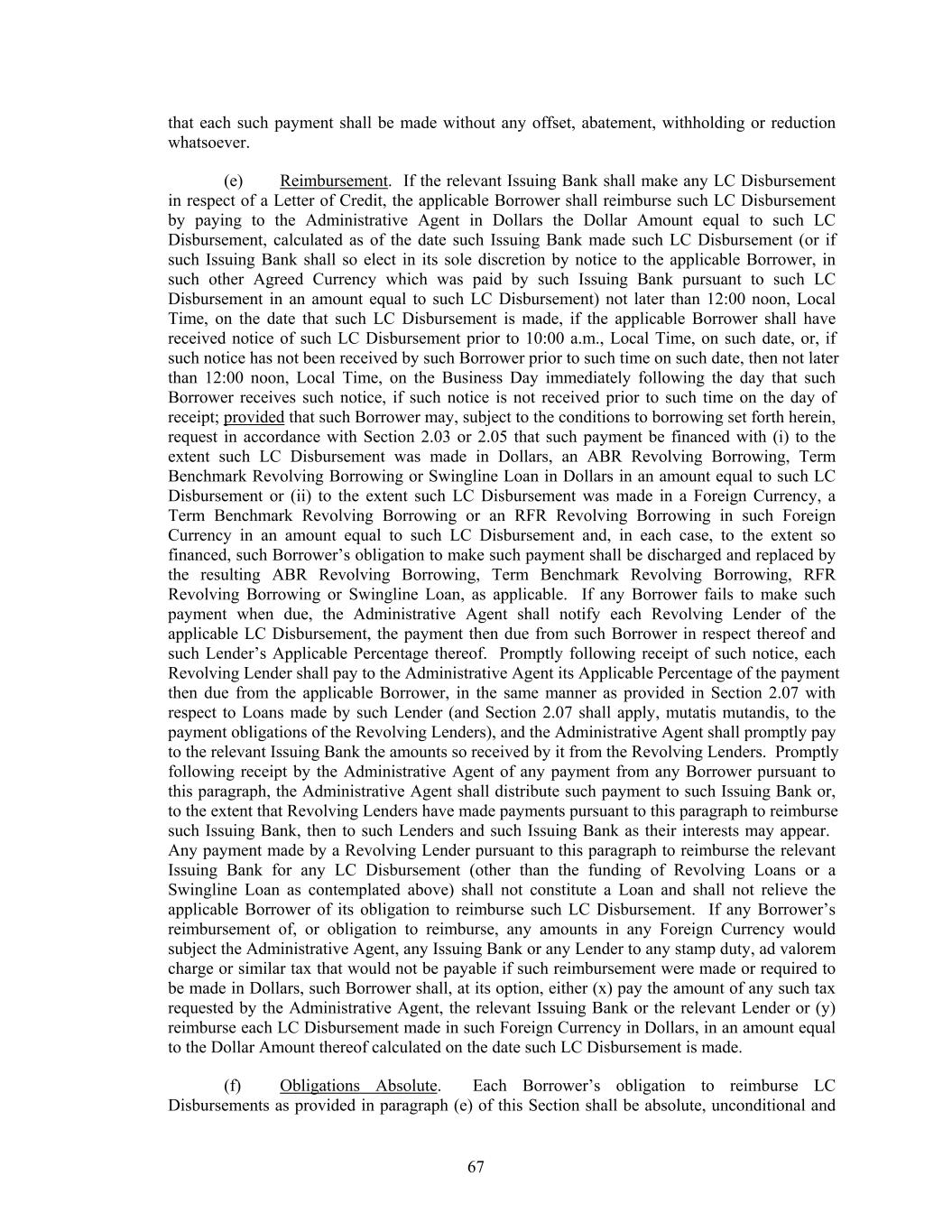 that each such payment shall be made without any offset, abatement, withholding or reduction whatsoever. (e) Reimbursement. If the relevant Issuing Bank shall make any LC Disbursement in respect of a Letter of Credit, the applicable Borrower shall reimburse such LC Disbursement by paying to the Administrative Agent in Dollars the Dollar Amount equal to such LC Disbursement, calculated as of the date such Issuing Bank made such LC Disbursement (or if such Issuing Bank shall so elect in its sole discretion by notice to the applicable Borrower, in such other Agreed Currency which was paid by such Issuing Bank pursuant to such LC Disbursement in an amount equal to such LC Disbursement) not later than 12:00 noon, Local Time, on the date that such LC Disbursement is made, if the applicable Borrower shall have received notice of such LC Disbursement prior to 10:00 a.m., Local Time, on such date, or, if such notice has not been received by such Borrower prior to such time on such date, then not later than 12:00 noon, Local Time, on the Business Day immediately following the day that such Borrower receives such notice, if such notice is not received prior to such time on the day of receipt; provided that such Borrower may, subject to the conditions to borrowing set forth herein, request in accordance with Section 2.03 or 2.05 that such payment be financed with (i) to the extent such LC Disbursement was made in Dollars, an ABR Revolving Borrowing, Term Benchmark Revolving Borrowing or Swingline Loan in Dollars in an amount equal to such LC Disbursement or (ii) to the extent such LC Disbursement was made in a Foreign Currency, a Term Benchmark Revolving Borrowing or an RFR Revolving Borrowing in such Foreign Currency in an amount equal to such LC Disbursement and, in each case, to the extent so financed, such Borrower’s obligation to make such payment shall be discharged and replaced by the resulting ABR Revolving Borrowing, Term Benchmark Revolving Borrowing, RFR Revolving Borrowing or Swingline Loan, as applicable. If any Borrower fails to make such payment when due, the Administrative Agent shall notify each Revolving Lender of the applicable LC Disbursement, the payment then due from such Borrower in respect thereof and such Lender’s Applicable Percentage thereof. Promptly following receipt of such notice, each Revolving Lender shall pay to the Administrative Agent its Applicable Percentage of the payment then due from the applicable Borrower, in the same manner as provided in Section 2.07 with respect to Loans made by such Lender (and Section 2.07 shall apply, mutatis mutandis, to the payment obligations of the Revolving Lenders), and the Administrative Agent shall promptly pay to the relevant Issuing Bank the amounts so received by it from the Revolving Lenders. Promptly following receipt by the Administrative Agent of any payment from any Borrower pursuant to this paragraph, the Administrative Agent shall distribute such payment to such Issuing Bank or, to the extent that Revolving Lenders have made payments pursuant to this paragraph to reimburse such Issuing Bank, then to such Lenders and such Issuing Bank as their interests may appear. Any payment made by a Revolving Lender pursuant to this paragraph to reimburse the relevant Issuing Bank for any LC Disbursement (other than the funding of Revolving Loans or a Swingline Loan as contemplated above) shall not constitute a Loan and shall not relieve the applicable Borrower of its obligation to reimburse such LC Disbursement. If any Borrower’s reimbursement of, or obligation to reimburse, any amounts in any Foreign Currency would subject the Administrative Agent, any Issuing Bank or any Lender to any stamp duty, ad valorem charge or similar tax that would not be payable if such reimbursement were made or required to be made in Dollars, such Borrower shall, at its option, either (x) pay the amount of any such tax requested by the Administrative Agent, the relevant Issuing Bank or the relevant Lender or (y) reimburse each LC Disbursement made in such Foreign Currency in Dollars, in an amount equal to the Dollar Amount thereof calculated on the date such LC Disbursement is made. (f) Obligations Absolute. Each Borrower’s obligation to reimburse LC Disbursements as provided in paragraph (e) of this Section shall be absolute, unconditional and 67