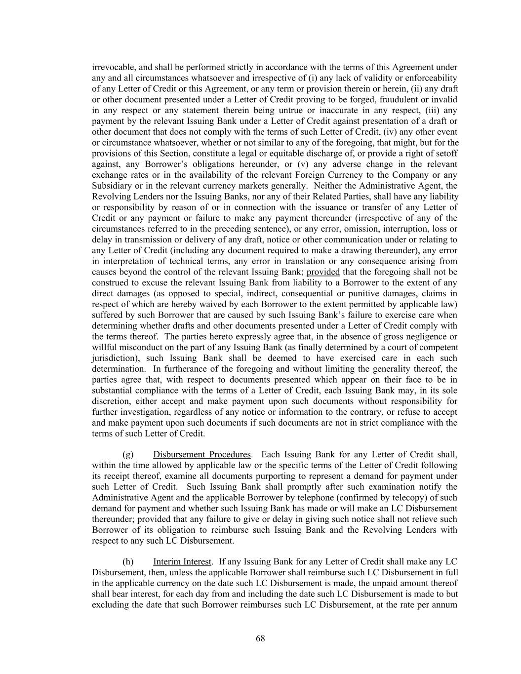 irrevocable, and shall be performed strictly in accordance with the terms of this Agreement under any and all circumstances whatsoever and irrespective of (i) any lack of validity or enforceability of any Letter of Credit or this Agreement, or any term or provision therein or herein, (ii) any draft or other document presented under a Letter of Credit proving to be forged, fraudulent or invalid in any respect or any statement therein being untrue or inaccurate in any respect, (iii) any payment by the relevant Issuing Bank under a Letter of Credit against presentation of a draft or other document that does not comply with the terms of such Letter of Credit, (iv) any other event or circumstance whatsoever, whether or not similar to any of the foregoing, that might, but for the provisions of this Section, constitute a legal or equitable discharge of, or provide a right of setoff against, any Borrower’s obligations hereunder, or (v) any adverse change in the relevant exchange rates or in the availability of the relevant Foreign Currency to the Company or any Subsidiary or in the relevant currency markets generally. Neither the Administrative Agent, the Revolving Lenders nor the Issuing Banks, nor any of their Related Parties, shall have any liability or responsibility by reason of or in connection with the issuance or transfer of any Letter of Credit or any payment or failure to make any payment thereunder (irrespective of any of the circumstances referred to in the preceding sentence), or any error, omission, interruption, loss or delay in transmission or delivery of any draft, notice or other communication under or relating to any Letter of Credit (including any document required to make a drawing thereunder), any error in interpretation of technical terms, any error in translation or any consequence arising from causes beyond the control of the relevant Issuing Bank; provided that the foregoing shall not be construed to excuse the relevant Issuing Bank from liability to a Borrower to the extent of any direct damages (as opposed to special, indirect, consequential or punitive damages, claims in respect of which are hereby waived by each Borrower to the extent permitted by applicable law) suffered by such Borrower that are caused by such Issuing Bank’s failure to exercise care when determining whether drafts and other documents presented under a Letter of Credit comply with the terms thereof. The parties hereto expressly agree that, in the absence of gross negligence or willful misconduct on the part of any Issuing Bank (as finally determined by a court of competent jurisdiction), such Issuing Bank shall be deemed to have exercised care in each such determination. In furtherance of the foregoing and without limiting the generality thereof, the parties agree that, with respect to documents presented which appear on their face to be in substantial compliance with the terms of a Letter of Credit, each Issuing Bank may, in its sole discretion, either accept and make payment upon such documents without responsibility for further investigation, regardless of any notice or information to the contrary, or refuse to accept and make payment upon such documents if such documents are not in strict compliance with the terms of such Letter of Credit. (g) Disbursement Procedures. Each Issuing Bank for any Letter of Credit shall, within the time allowed by applicable law or the specific terms of the Letter of Credit following its receipt thereof, examine all documents purporting to represent a demand for payment under such Letter of Credit. Such Issuing Bank shall promptly after such examination notify the Administrative Agent and the applicable Borrower by telephone (confirmed by telecopy) of such demand for payment and whether such Issuing Bank has made or will make an LC Disbursement thereunder; provided that any failure to give or delay in giving such notice shall not relieve such Borrower of its obligation to reimburse such Issuing Bank and the Revolving Lenders with respect to any such LC Disbursement. (h) Interim Interest. If any Issuing Bank for any Letter of Credit shall make any LC Disbursement, then, unless the applicable Borrower shall reimburse such LC Disbursement in full in the applicable currency on the date such LC Disbursement is made, the unpaid amount thereof shall bear interest, for each day from and including the date such LC Disbursement is made to but excluding the date that such Borrower reimburses such LC Disbursement, at the rate per annum 68