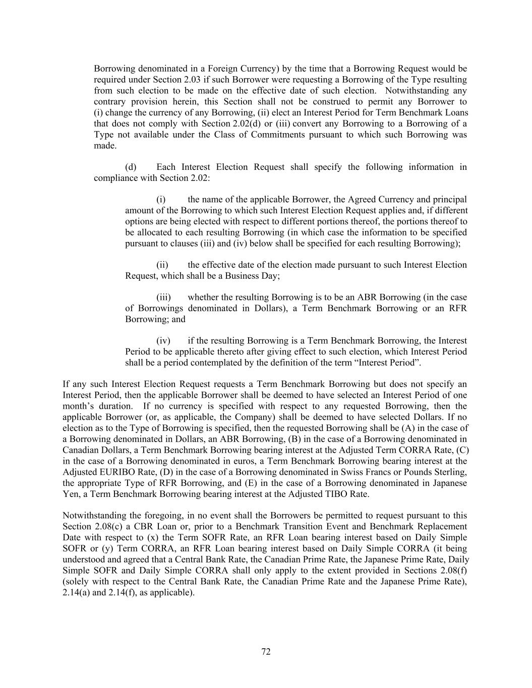 Borrowing denominated in a Foreign Currency) by the time that a Borrowing Request would be required under Section 2.03 if such Borrower were requesting a Borrowing of the Type resulting from such election to be made on the effective date of such election. Notwithstanding any contrary provision herein, this Section shall not be construed to permit any Borrower to (i) change the currency of any Borrowing, (ii) elect an Interest Period for Term Benchmark Loans that does not comply with Section 2.02(d) or (iii) convert any Borrowing to a Borrowing of a Type not available under the Class of Commitments pursuant to which such Borrowing was made. (d) Each Interest Election Request shall specify the following information in compliance with Section 2.02: (i) the name of the applicable Borrower, the Agreed Currency and principal amount of the Borrowing to which such Interest Election Request applies and, if different options are being elected with respect to different portions thereof, the portions thereof to be allocated to each resulting Borrowing (in which case the information to be specified pursuant to clauses (iii) and (iv) below shall be specified for each resulting Borrowing); (ii) the effective date of the election made pursuant to such Interest Election Request, which shall be a Business Day; (iii) whether the resulting Borrowing is to be an ABR Borrowing (in the case of Borrowings denominated in Dollars), a Term Benchmark Borrowing or an RFR Borrowing; and (iv) if the resulting Borrowing is a Term Benchmark Borrowing, the Interest Period to be applicable thereto after giving effect to such election, which Interest Period shall be a period contemplated by the definition of the term “Interest Period”. If any such Interest Election Request requests a Term Benchmark Borrowing but does not specify an Interest Period, then the applicable Borrower shall be deemed to have selected an Interest Period of one month’s duration. If no currency is specified with respect to any requested Borrowing, then the applicable Borrower (or, as applicable, the Company) shall be deemed to have selected Dollars. If no election as to the Type of Borrowing is specified, then the requested Borrowing shall be (A) in the case of a Borrowing denominated in Dollars, an ABR Borrowing, (B) in the case of a Borrowing denominated in Canadian Dollars, a Term Benchmark Borrowing bearing interest at the Adjusted Term CORRA Rate, (C) in the case of a Borrowing denominated in euros, a Term Benchmark Borrowing bearing interest at the Adjusted EURIBO Rate, (D) in the case of a Borrowing denominated in Swiss Francs or Pounds Sterling, the appropriate Type of RFR Borrowing, and (E) in the case of a Borrowing denominated in Japanese Yen, a Term Benchmark Borrowing bearing interest at the Adjusted TIBO Rate. Notwithstanding the foregoing, in no event shall the Borrowers be permitted to request pursuant to this Section 2.08(c) a CBR Loan or, prior to a Benchmark Transition Event and Benchmark Replacement Date with respect to (x) the Term SOFR Rate, an RFR Loan bearing interest based on Daily Simple SOFR or (y) Term CORRA, an RFR Loan bearing interest based on Daily Simple CORRA (it being understood and agreed that a Central Bank Rate, the Canadian Prime Rate, the Japanese Prime Rate, Daily Simple SOFR and Daily Simple CORRA shall only apply to the extent provided in Sections 2.08(f) (solely with respect to the Central Bank Rate, the Canadian Prime Rate and the Japanese Prime Rate), 2.14(a) and 2.14(f), as applicable). 72