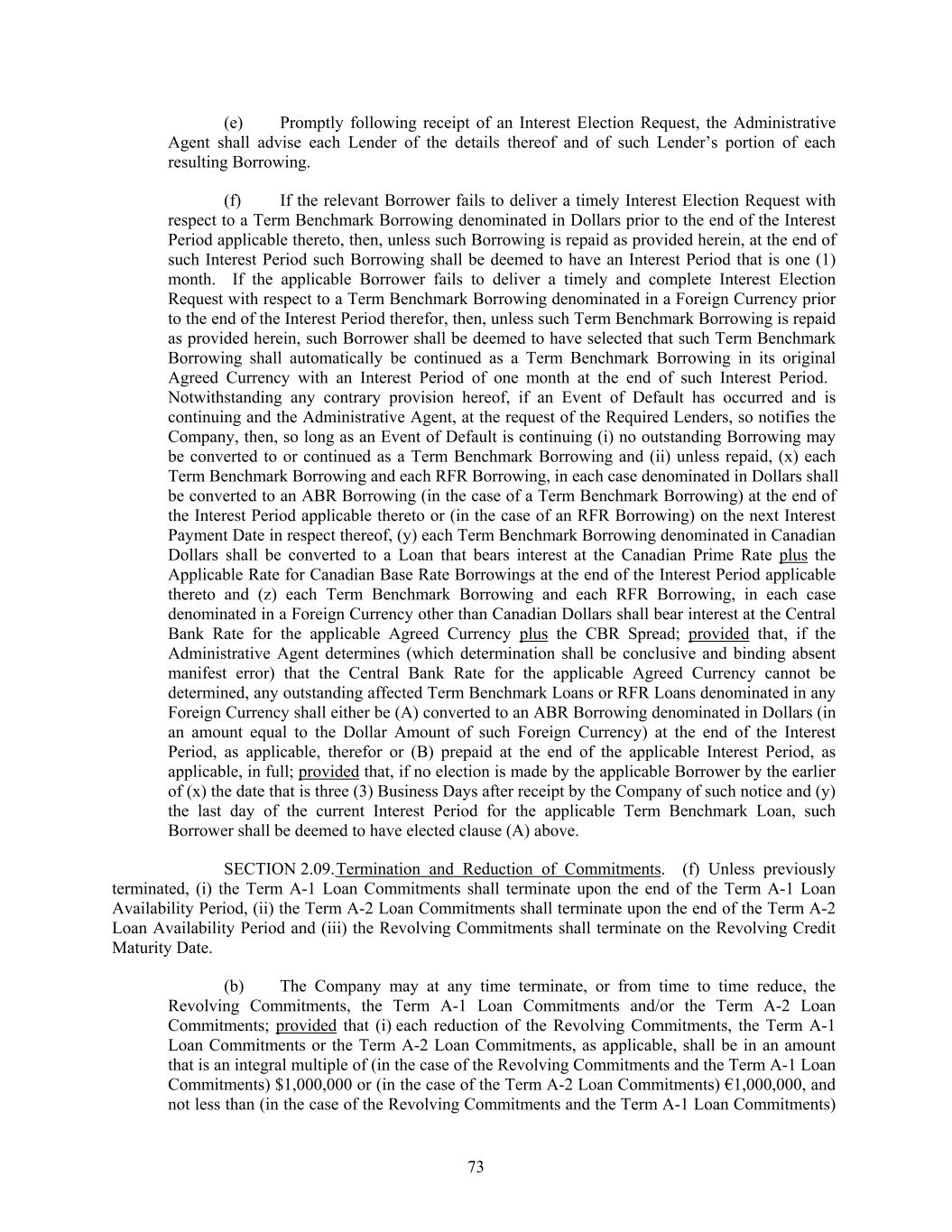 (e) Promptly following receipt of an Interest Election Request, the Administrative Agent shall advise each Lender of the details thereof and of such Lender’s portion of each resulting Borrowing. (f) If the relevant Borrower fails to deliver a timely Interest Election Request with respect to a Term Benchmark Borrowing denominated in Dollars prior to the end of the Interest Period applicable thereto, then, unless such Borrowing is repaid as provided herein, at the end of such Interest Period such Borrowing shall be deemed to have an Interest Period that is one (1) month. If the applicable Borrower fails to deliver a timely and complete Interest Election Request with respect to a Term Benchmark Borrowing denominated in a Foreign Currency prior to the end of the Interest Period therefor, then, unless such Term Benchmark Borrowing is repaid as provided herein, such Borrower shall be deemed to have selected that such Term Benchmark Borrowing shall automatically be continued as a Term Benchmark Borrowing in its original Agreed Currency with an Interest Period of one month at the end of such Interest Period. Notwithstanding any contrary provision hereof, if an Event of Default has occurred and is continuing and the Administrative Agent, at the request of the Required Lenders, so notifies the Company, then, so long as an Event of Default is continuing (i) no outstanding Borrowing may be converted to or continued as a Term Benchmark Borrowing and (ii) unless repaid, (x) each Term Benchmark Borrowing and each RFR Borrowing, in each case denominated in Dollars shall be converted to an ABR Borrowing (in the case of a Term Benchmark Borrowing) at the end of the Interest Period applicable thereto or (in the case of an RFR Borrowing) on the next Interest Payment Date in respect thereof, (y) each Term Benchmark Borrowing denominated in Canadian Dollars shall be converted to a Loan that bears interest at the Canadian Prime Rate plus the Applicable Rate for Canadian Base Rate Borrowings at the end of the Interest Period applicable thereto and (z) each Term Benchmark Borrowing and each RFR Borrowing, in each case denominated in a Foreign Currency other than Canadian Dollars shall bear interest at the Central Bank Rate for the applicable Agreed Currency plus the CBR Spread; provided that, if the Administrative Agent determines (which determination shall be conclusive and binding absent manifest error) that the Central Bank Rate for the applicable Agreed Currency cannot be determined, any outstanding affected Term Benchmark Loans or RFR Loans denominated in any Foreign Currency shall either be (A) converted to an ABR Borrowing denominated in Dollars (in an amount equal to the Dollar Amount of such Foreign Currency) at the end of the Interest Period, as applicable, therefor or (B) prepaid at the end of the applicable Interest Period, as applicable, in full; provided that, if no election is made by the applicable Borrower by the earlier of (x) the date that is three (3) Business Days after receipt by the Company of such notice and (y) the last day of the current Interest Period for the applicable Term Benchmark Loan, such Borrower shall be deemed to have elected clause (A) above. SECTION 2.09.Termination and Reduction of Commitments. (f) Unless previously terminated, (i) the Term A-1 Loan Commitments shall terminate upon the end of the Term A-1 Loan Availability Period, (ii) the Term A-2 Loan Commitments shall terminate upon the end of the Term A-2 Loan Availability Period and (iii) the Revolving Commitments shall terminate on the Revolving Credit Maturity Date. (b) The Company may at any time terminate, or from time to time reduce, the Revolving Commitments, the Term A-1 Loan Commitments and/or the Term A-2 Loan Commitments; provided that (i) each reduction of the Revolving Commitments, the Term A-1 Loan Commitments or the Term A-2 Loan Commitments, as applicable, shall be in an amount that is an integral multiple of (in the case of the Revolving Commitments and the Term A-1 Loan Commitments) $1,000,000 or (in the case of the Term A-2 Loan Commitments) €1,000,000, and not less than (in the case of the Revolving Commitments and the Term A-1 Loan Commitments) 73