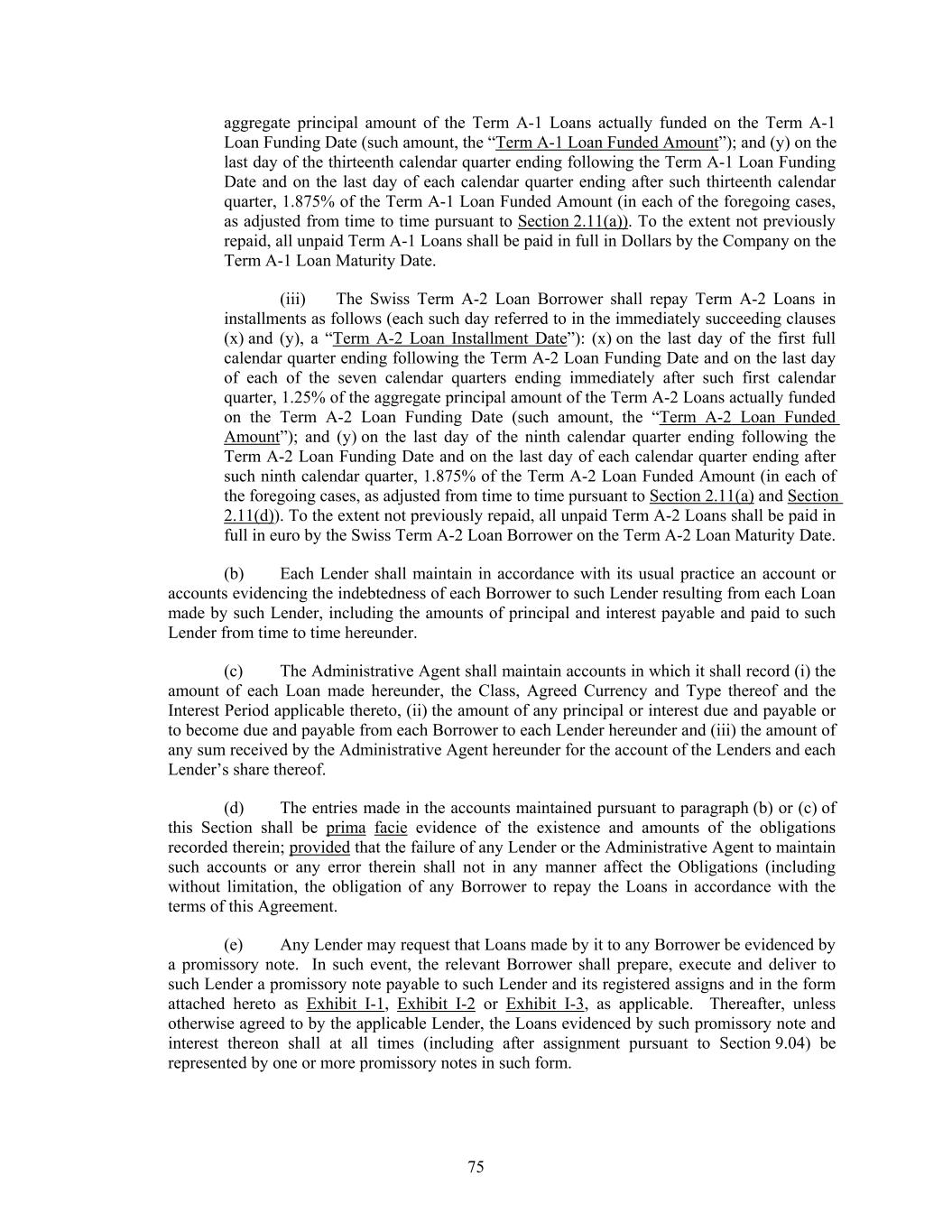 aggregate principal amount of the Term A-1 Loans actually funded on the Term A-1 Loan Funding Date (such amount, the “Term A-1 Loan Funded Amount”); and (y) on the last day of the thirteenth calendar quarter ending following the Term A-1 Loan Funding Date and on the last day of each calendar quarter ending after such thirteenth calendar quarter, 1.875% of the Term A-1 Loan Funded Amount (in each of the foregoing cases, as adjusted from time to time pursuant to Section 2.11(a)). To the extent not previously repaid, all unpaid Term A-1 Loans shall be paid in full in Dollars by the Company on the Term A-1 Loan Maturity Date. (iii) The Swiss Term A-2 Loan Borrower shall repay Term A-2 Loans in installments as follows (each such day referred to in the immediately succeeding clauses (x) and (y), a “Term A-2 Loan Installment Date”): (x) on the last day of the first full calendar quarter ending following the Term A-2 Loan Funding Date and on the last day of each of the seven calendar quarters ending immediately after such first calendar quarter, 1.25% of the aggregate principal amount of the Term A-2 Loans actually funded on the Term A-2 Loan Funding Date (such amount, the “Term A-2 Loan Funded Amount”); and (y) on the last day of the ninth calendar quarter ending following the Term A-2 Loan Funding Date and on the last day of each calendar quarter ending after such ninth calendar quarter, 1.875% of the Term A-2 Loan Funded Amount (in each of the foregoing cases, as adjusted from time to time pursuant to Section 2.11(a) and Section 2.11(d)). To the extent not previously repaid, all unpaid Term A-2 Loans shall be paid in full in euro by the Swiss Term A-2 Loan Borrower on the Term A-2 Loan Maturity Date. (b) Each Lender shall maintain in accordance with its usual practice an account or accounts evidencing the indebtedness of each Borrower to such Lender resulting from each Loan made by such Lender, including the amounts of principal and interest payable and paid to such Lender from time to time hereunder. (c) The Administrative Agent shall maintain accounts in which it shall record (i) the amount of each Loan made hereunder, the Class, Agreed Currency and Type thereof and the Interest Period applicable thereto, (ii) the amount of any principal or interest due and payable or to become due and payable from each Borrower to each Lender hereunder and (iii) the amount of any sum received by the Administrative Agent hereunder for the account of the Lenders and each Lender’s share thereof. (d) The entries made in the accounts maintained pursuant to paragraph (b) or (c) of this Section shall be prima facie evidence of the existence and amounts of the obligations recorded therein; provided that the failure of any Lender or the Administrative Agent to maintain such accounts or any error therein shall not in any manner affect the Obligations (including without limitation, the obligation of any Borrower to repay the Loans in accordance with the terms of this Agreement. (e) Any Lender may request that Loans made by it to any Borrower be evidenced by a promissory note. In such event, the relevant Borrower shall prepare, execute and deliver to such Lender a promissory note payable to such Lender and its registered assigns and in the form attached hereto as Exhibit I-1, Exhibit I-2 or Exhibit I-3, as applicable. Thereafter, unless otherwise agreed to by the applicable Lender, the Loans evidenced by such promissory note and interest thereon shall at all times (including after assignment pursuant to Section 9.04) be represented by one or more promissory notes in such form. 75
