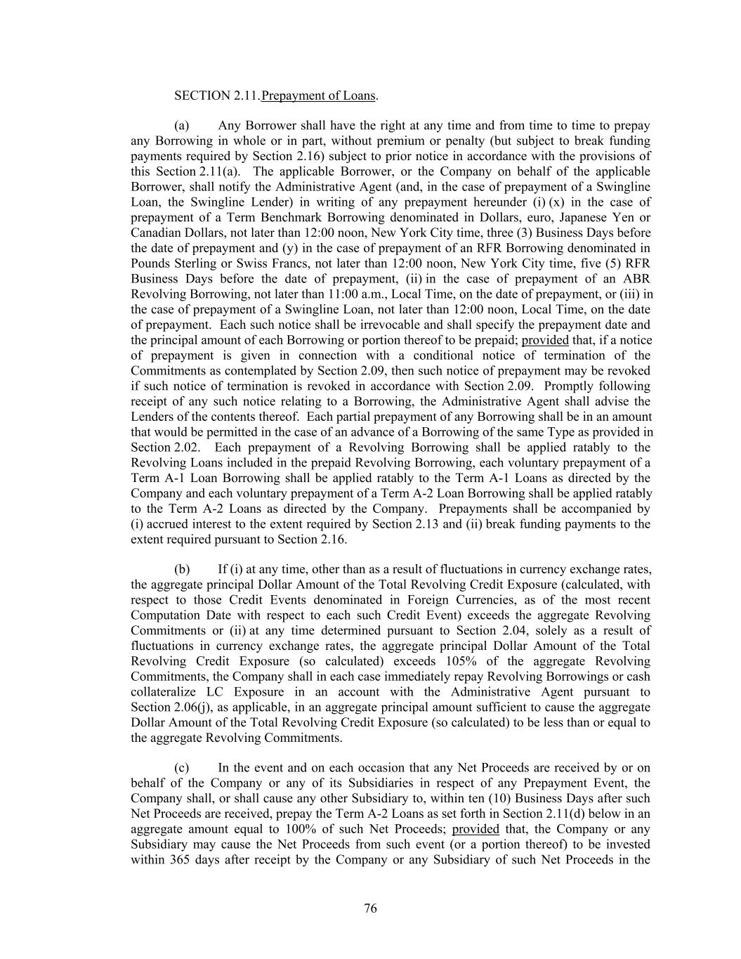 SECTION 2.11.Prepayment of Loans. (a) Any Borrower shall have the right at any time and from time to time to prepay any Borrowing in whole or in part, without premium or penalty (but subject to break funding payments required by Section 2.16) subject to prior notice in accordance with the provisions of this Section 2.11(a). The applicable Borrower, or the Company on behalf of the applicable Borrower, shall notify the Administrative Agent (and, in the case of prepayment of a Swingline Loan, the Swingline Lender) in writing of any prepayment hereunder (i) (x) in the case of prepayment of a Term Benchmark Borrowing denominated in Dollars, euro, Japanese Yen or Canadian Dollars, not later than 12:00 noon, New York City time, three (3) Business Days before the date of prepayment and (y) in the case of prepayment of an RFR Borrowing denominated in Pounds Sterling or Swiss Francs, not later than 12:00 noon, New York City time, five (5) RFR Business Days before the date of prepayment, (ii) in the case of prepayment of an ABR Revolving Borrowing, not later than 11:00 a.m., Local Time, on the date of prepayment, or (iii) in the case of prepayment of a Swingline Loan, not later than 12:00 noon, Local Time, on the date of prepayment. Each such notice shall be irrevocable and shall specify the prepayment date and the principal amount of each Borrowing or portion thereof to be prepaid; provided that, if a notice of prepayment is given in connection with a conditional notice of termination of the Commitments as contemplated by Section 2.09, then such notice of prepayment may be revoked if such notice of termination is revoked in accordance with Section 2.09. Promptly following receipt of any such notice relating to a Borrowing, the Administrative Agent shall advise the Lenders of the contents thereof. Each partial prepayment of any Borrowing shall be in an amount that would be permitted in the case of an advance of a Borrowing of the same Type as provided in Section 2.02. Each prepayment of a Revolving Borrowing shall be applied ratably to the Revolving Loans included in the prepaid Revolving Borrowing, each voluntary prepayment of a Term A-1 Loan Borrowing shall be applied ratably to the Term A-1 Loans as directed by the Company and each voluntary prepayment of a Term A-2 Loan Borrowing shall be applied ratably to the Term A-2 Loans as directed by the Company. Prepayments shall be accompanied by (i) accrued interest to the extent required by Section 2.13 and (ii) break funding payments to the extent required pursuant to Section 2.16. (b) If (i) at any time, other than as a result of fluctuations in currency exchange rates, the aggregate principal Dollar Amount of the Total Revolving Credit Exposure (calculated, with respect to those Credit Events denominated in Foreign Currencies, as of the most recent Computation Date with respect to each such Credit Event) exceeds the aggregate Revolving Commitments or (ii) at any time determined pursuant to Section 2.04, solely as a result of fluctuations in currency exchange rates, the aggregate principal Dollar Amount of the Total Revolving Credit Exposure (so calculated) exceeds 105% of the aggregate Revolving Commitments, the Company shall in each case immediately repay Revolving Borrowings or cash collateralize LC Exposure in an account with the Administrative Agent pursuant to Section 2.06(j), as applicable, in an aggregate principal amount sufficient to cause the aggregate Dollar Amount of the Total Revolving Credit Exposure (so calculated) to be less than or equal to the aggregate Revolving Commitments. (c) In the event and on each occasion that any Net Proceeds are received by or on behalf of the Company or any of its Subsidiaries in respect of any Prepayment Event, the Company shall, or shall cause any other Subsidiary to, within ten (10) Business Days after such Net Proceeds are received, prepay the Term A-2 Loans as set forth in Section 2.11(d) below in an aggregate amount equal to 100% of such Net Proceeds; provided that, the Company or any Subsidiary may cause the Net Proceeds from such event (or a portion thereof) to be invested within 365 days after receipt by the Company or any Subsidiary of such Net Proceeds in the 76