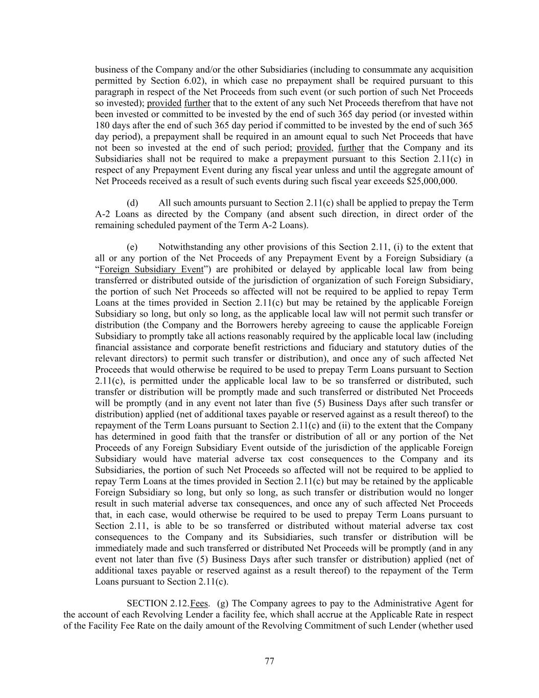 business of the Company and/or the other Subsidiaries (including to consummate any acquisition permitted by Section 6.02), in which case no prepayment shall be required pursuant to this paragraph in respect of the Net Proceeds from such event (or such portion of such Net Proceeds so invested); provided further that to the extent of any such Net Proceeds therefrom that have not been invested or committed to be invested by the end of such 365 day period (or invested within 180 days after the end of such 365 day period if committed to be invested by the end of such 365 day period), a prepayment shall be required in an amount equal to such Net Proceeds that have not been so invested at the end of such period; provided, further that the Company and its Subsidiaries shall not be required to make a prepayment pursuant to this Section 2.11(c) in respect of any Prepayment Event during any fiscal year unless and until the aggregate amount of Net Proceeds received as a result of such events during such fiscal year exceeds $25,000,000. (d) All such amounts pursuant to Section 2.11(c) shall be applied to prepay the Term A-2 Loans as directed by the Company (and absent such direction, in direct order of the remaining scheduled payment of the Term A-2 Loans). (e) Notwithstanding any other provisions of this Section 2.11, (i) to the extent that all or any portion of the Net Proceeds of any Prepayment Event by a Foreign Subsidiary (a “Foreign Subsidiary Event”) are prohibited or delayed by applicable local law from being transferred or distributed outside of the jurisdiction of organization of such Foreign Subsidiary, the portion of such Net Proceeds so affected will not be required to be applied to repay Term Loans at the times provided in Section 2.11(c) but may be retained by the applicable Foreign Subsidiary so long, but only so long, as the applicable local law will not permit such transfer or distribution (the Company and the Borrowers hereby agreeing to cause the applicable Foreign Subsidiary to promptly take all actions reasonably required by the applicable local law (including financial assistance and corporate benefit restrictions and fiduciary and statutory duties of the relevant directors) to permit such transfer or distribution), and once any of such affected Net Proceeds that would otherwise be required to be used to prepay Term Loans pursuant to Section 2.11(c), is permitted under the applicable local law to be so transferred or distributed, such transfer or distribution will be promptly made and such transferred or distributed Net Proceeds will be promptly (and in any event not later than five (5) Business Days after such transfer or distribution) applied (net of additional taxes payable or reserved against as a result thereof) to the repayment of the Term Loans pursuant to Section 2.11(c) and (ii) to the extent that the Company has determined in good faith that the transfer or distribution of all or any portion of the Net Proceeds of any Foreign Subsidiary Event outside of the jurisdiction of the applicable Foreign Subsidiary would have material adverse tax cost consequences to the Company and its Subsidiaries, the portion of such Net Proceeds so affected will not be required to be applied to repay Term Loans at the times provided in Section 2.11(c) but may be retained by the applicable Foreign Subsidiary so long, but only so long, as such transfer or distribution would no longer result in such material adverse tax consequences, and once any of such affected Net Proceeds that, in each case, would otherwise be required to be used to prepay Term Loans pursuant to Section 2.11, is able to be so transferred or distributed without material adverse tax cost consequences to the Company and its Subsidiaries, such transfer or distribution will be immediately made and such transferred or distributed Net Proceeds will be promptly (and in any event not later than five (5) Business Days after such transfer or distribution) applied (net of additional taxes payable or reserved against as a result thereof) to the repayment of the Term Loans pursuant to Section 2.11(c). SECTION 2.12.Fees. (g) The Company agrees to pay to the Administrative Agent for the account of each Revolving Lender a facility fee, which shall accrue at the Applicable Rate in respect of the Facility Fee Rate on the daily amount of the Revolving Commitment of such Lender (whether used 77