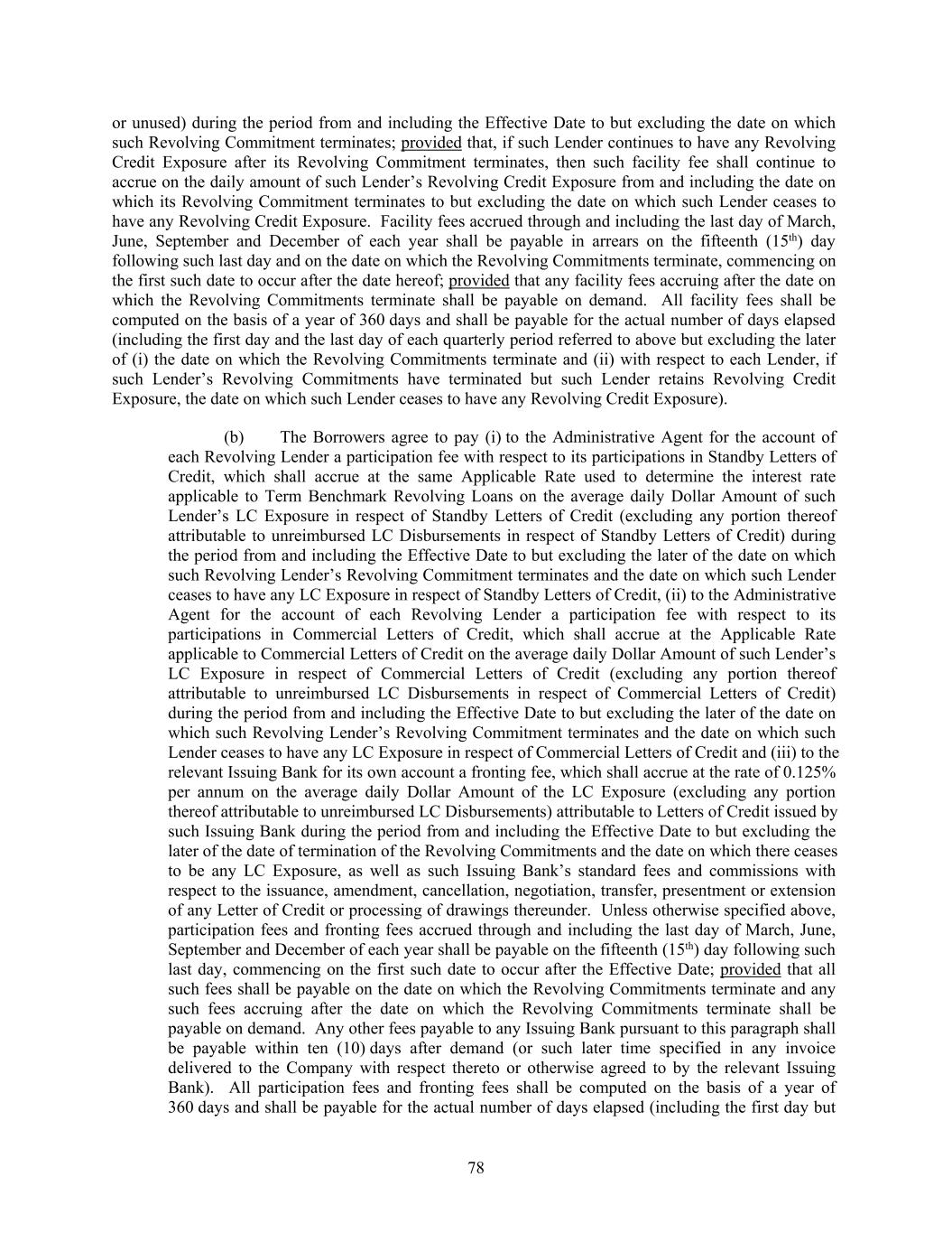 or unused) during the period from and including the Effective Date to but excluding the date on which such Revolving Commitment terminates; provided that, if such Lender continues to have any Revolving Credit Exposure after its Revolving Commitment terminates, then such facility fee shall continue to accrue on the daily amount of such Lender’s Revolving Credit Exposure from and including the date on which its Revolving Commitment terminates to but excluding the date on which such Lender ceases to have any Revolving Credit Exposure. Facility fees accrued through and including the last day of March, June, September and December of each year shall be payable in arrears on the fifteenth (15th) day following such last day and on the date on which the Revolving Commitments terminate, commencing on the first such date to occur after the date hereof; provided that any facility fees accruing after the date on which the Revolving Commitments terminate shall be payable on demand. All facility fees shall be computed on the basis of a year of 360 days and shall be payable for the actual number of days elapsed (including the first day and the last day of each quarterly period referred to above but excluding the later of (i) the date on which the Revolving Commitments terminate and (ii) with respect to each Lender, if such Lender’s Revolving Commitments have terminated but such Lender retains Revolving Credit Exposure, the date on which such Lender ceases to have any Revolving Credit Exposure). (b) The Borrowers agree to pay (i) to the Administrative Agent for the account of each Revolving Lender a participation fee with respect to its participations in Standby Letters of Credit, which shall accrue at the same Applicable Rate used to determine the interest rate applicable to Term Benchmark Revolving Loans on the average daily Dollar Amount of such Lender’s LC Exposure in respect of Standby Letters of Credit (excluding any portion thereof attributable to unreimbursed LC Disbursements in respect of Standby Letters of Credit) during the period from and including the Effective Date to but excluding the later of the date on which such Revolving Lender’s Revolving Commitment terminates and the date on which such Lender ceases to have any LC Exposure in respect of Standby Letters of Credit, (ii) to the Administrative Agent for the account of each Revolving Lender a participation fee with respect to its participations in Commercial Letters of Credit, which shall accrue at the Applicable Rate applicable to Commercial Letters of Credit on the average daily Dollar Amount of such Lender’s LC Exposure in respect of Commercial Letters of Credit (excluding any portion thereof attributable to unreimbursed LC Disbursements in respect of Commercial Letters of Credit) during the period from and including the Effective Date to but excluding the later of the date on which such Revolving Lender’s Revolving Commitment terminates and the date on which such Lender ceases to have any LC Exposure in respect of Commercial Letters of Credit and (iii) to the relevant Issuing Bank for its own account a fronting fee, which shall accrue at the rate of 0.125% per annum on the average daily Dollar Amount of the LC Exposure (excluding any portion thereof attributable to unreimbursed LC Disbursements) attributable to Letters of Credit issued by such Issuing Bank during the period from and including the Effective Date to but excluding the later of the date of termination of the Revolving Commitments and the date on which there ceases to be any LC Exposure, as well as such Issuing Bank’s standard fees and commissions with respect to the issuance, amendment, cancellation, negotiation, transfer, presentment or extension of any Letter of Credit or processing of drawings thereunder. Unless otherwise specified above, participation fees and fronting fees accrued through and including the last day of March, June, September and December of each year shall be payable on the fifteenth (15th) day following such last day, commencing on the first such date to occur after the Effective Date; provided that all such fees shall be payable on the date on which the Revolving Commitments terminate and any such fees accruing after the date on which the Revolving Commitments terminate shall be payable on demand. Any other fees payable to any Issuing Bank pursuant to this paragraph shall be payable within ten (10) days after demand (or such later time specified in any invoice delivered to the Company with respect thereto or otherwise agreed to by the relevant Issuing Bank). All participation fees and fronting fees shall be computed on the basis of a year of 360 days and shall be payable for the actual number of days elapsed (including the first day but 78