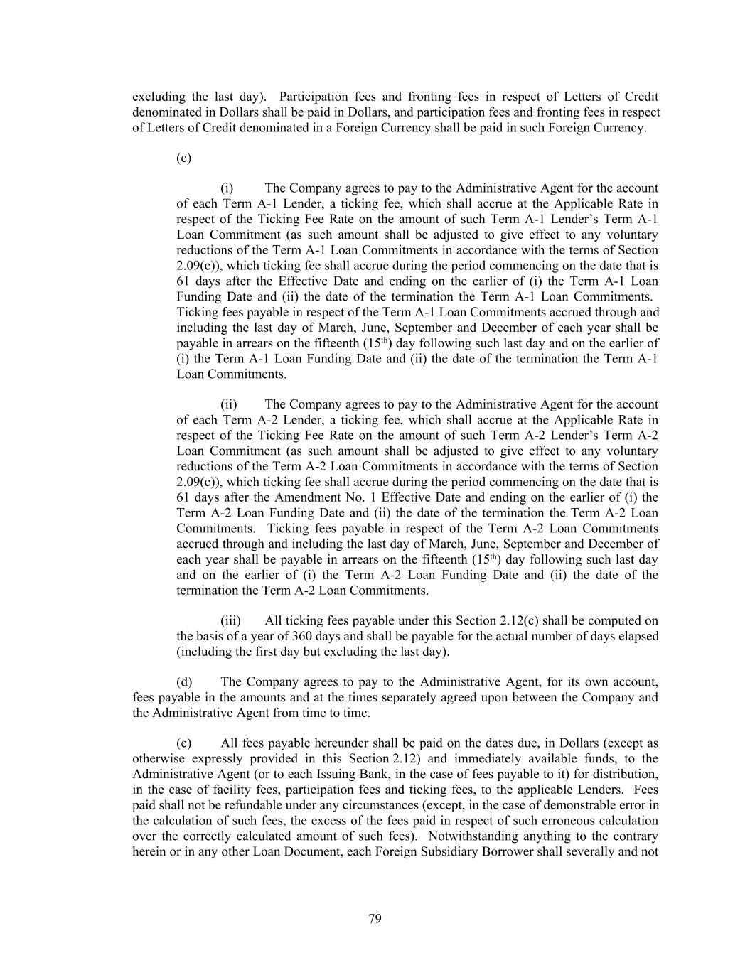 excluding the last day). Participation fees and fronting fees in respect of Letters of Credit denominated in Dollars shall be paid in Dollars, and participation fees and fronting fees in respect of Letters of Credit denominated in a Foreign Currency shall be paid in such Foreign Currency. (c) (i) The Company agrees to pay to the Administrative Agent for the account of each Term A-1 Lender, a ticking fee, which shall accrue at the Applicable Rate in respect of the Ticking Fee Rate on the amount of such Term A-1 Lender’s Term A-1 Loan Commitment (as such amount shall be adjusted to give effect to any voluntary reductions of the Term A-1 Loan Commitments in accordance with the terms of Section 2.09(c)), which ticking fee shall accrue during the period commencing on the date that is 61 days after the Effective Date and ending on the earlier of (i) the Term A-1 Loan Funding Date and (ii) the date of the termination the Term A-1 Loan Commitments. Ticking fees payable in respect of the Term A-1 Loan Commitments accrued through and including the last day of March, June, September and December of each year shall be payable in arrears on the fifteenth (15th) day following such last day and on the earlier of (i) the Term A-1 Loan Funding Date and (ii) the date of the termination the Term A-1 Loan Commitments. (ii) The Company agrees to pay to the Administrative Agent for the account of each Term A-2 Lender, a ticking fee, which shall accrue at the Applicable Rate in respect of the Ticking Fee Rate on the amount of such Term A-2 Lender’s Term A-2 Loan Commitment (as such amount shall be adjusted to give effect to any voluntary reductions of the Term A-2 Loan Commitments in accordance with the terms of Section 2.09(c)), which ticking fee shall accrue during the period commencing on the date that is 61 days after the Amendment No. 1 Effective Date and ending on the earlier of (i) the Term A-2 Loan Funding Date and (ii) the date of the termination the Term A-2 Loan Commitments. Ticking fees payable in respect of the Term A-2 Loan Commitments accrued through and including the last day of March, June, September and December of each year shall be payable in arrears on the fifteenth (15th) day following such last day and on the earlier of (i) the Term A-2 Loan Funding Date and (ii) the date of the termination the Term A-2 Loan Commitments. (iii) All ticking fees payable under this Section 2.12(c) shall be computed on the basis of a year of 360 days and shall be payable for the actual number of days elapsed (including the first day but excluding the last day). (d) The Company agrees to pay to the Administrative Agent, for its own account, fees payable in the amounts and at the times separately agreed upon between the Company and the Administrative Agent from time to time. (e) All fees payable hereunder shall be paid on the dates due, in Dollars (except as otherwise expressly provided in this Section 2.12) and immediately available funds, to the Administrative Agent (or to each Issuing Bank, in the case of fees payable to it) for distribution, in the case of facility fees, participation fees and ticking fees, to the applicable Lenders. Fees paid shall not be refundable under any circumstances (except, in the case of demonstrable error in the calculation of such fees, the excess of the fees paid in respect of such erroneous calculation over the correctly calculated amount of such fees). Notwithstanding anything to the contrary herein or in any other Loan Document, each Foreign Subsidiary Borrower shall severally and not 79