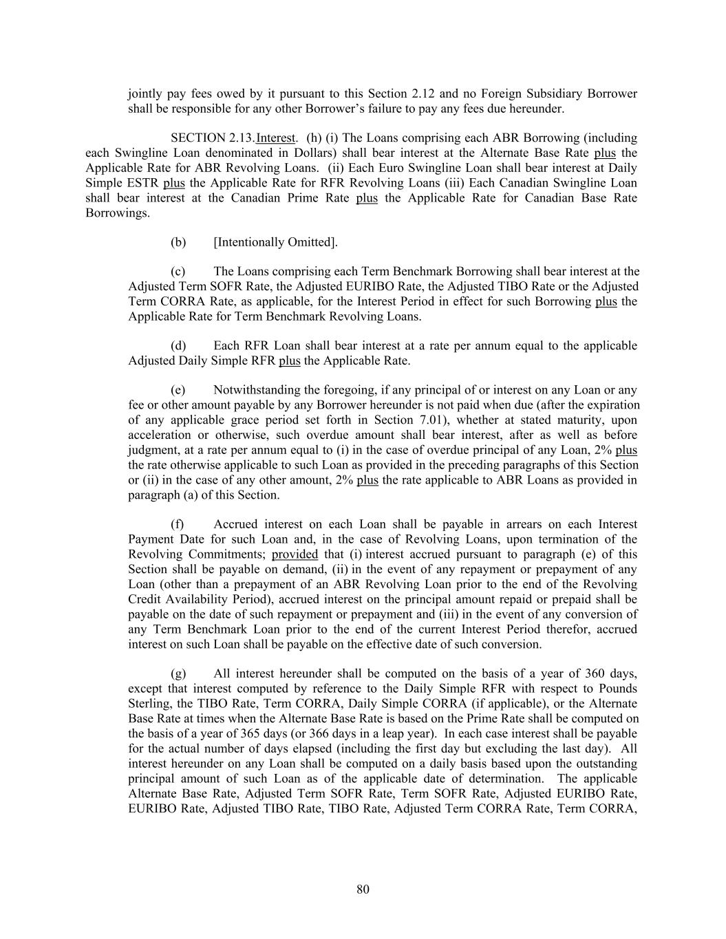 jointly pay fees owed by it pursuant to this Section 2.12 and no Foreign Subsidiary Borrower shall be responsible for any other Borrower’s failure to pay any fees due hereunder. SECTION 2.13.Interest. (h) (i) The Loans comprising each ABR Borrowing (including each Swingline Loan denominated in Dollars) shall bear interest at the Alternate Base Rate plus the Applicable Rate for ABR Revolving Loans. (ii) Each Euro Swingline Loan shall bear interest at Daily Simple ESTR plus the Applicable Rate for RFR Revolving Loans (iii) Each Canadian Swingline Loan shall bear interest at the Canadian Prime Rate plus the Applicable Rate for Canadian Base Rate Borrowings. (b) [Intentionally Omitted]. (c) The Loans comprising each Term Benchmark Borrowing shall bear interest at the Adjusted Term SOFR Rate, the Adjusted EURIBO Rate, the Adjusted TIBO Rate or the Adjusted Term CORRA Rate, as applicable, for the Interest Period in effect for such Borrowing plus the Applicable Rate for Term Benchmark Revolving Loans. (d) Each RFR Loan shall bear interest at a rate per annum equal to the applicable Adjusted Daily Simple RFR plus the Applicable Rate. (e) Notwithstanding the foregoing, if any principal of or interest on any Loan or any fee or other amount payable by any Borrower hereunder is not paid when due (after the expiration of any applicable grace period set forth in Section 7.01), whether at stated maturity, upon acceleration or otherwise, such overdue amount shall bear interest, after as well as before judgment, at a rate per annum equal to (i) in the case of overdue principal of any Loan, 2% plus the rate otherwise applicable to such Loan as provided in the preceding paragraphs of this Section or (ii) in the case of any other amount, 2% plus the rate applicable to ABR Loans as provided in paragraph (a) of this Section. (f) Accrued interest on each Loan shall be payable in arrears on each Interest Payment Date for such Loan and, in the case of Revolving Loans, upon termination of the Revolving Commitments; provided that (i) interest accrued pursuant to paragraph (e) of this Section shall be payable on demand, (ii) in the event of any repayment or prepayment of any Loan (other than a prepayment of an ABR Revolving Loan prior to the end of the Revolving Credit Availability Period), accrued interest on the principal amount repaid or prepaid shall be payable on the date of such repayment or prepayment and (iii) in the event of any conversion of any Term Benchmark Loan prior to the end of the current Interest Period therefor, accrued interest on such Loan shall be payable on the effective date of such conversion. (g) All interest hereunder shall be computed on the basis of a year of 360 days, except that interest computed by reference to the Daily Simple RFR with respect to Pounds Sterling, the TIBO Rate, Term CORRA, Daily Simple CORRA (if applicable), or the Alternate Base Rate at times when the Alternate Base Rate is based on the Prime Rate shall be computed on the basis of a year of 365 days (or 366 days in a leap year). In each case interest shall be payable for the actual number of days elapsed (including the first day but excluding the last day). All interest hereunder on any Loan shall be computed on a daily basis based upon the outstanding principal amount of such Loan as of the applicable date of determination. The applicable Alternate Base Rate, Adjusted Term SOFR Rate, Term SOFR Rate, Adjusted EURIBO Rate, EURIBO Rate, Adjusted TIBO Rate, TIBO Rate, Adjusted Term CORRA Rate, Term CORRA, 80