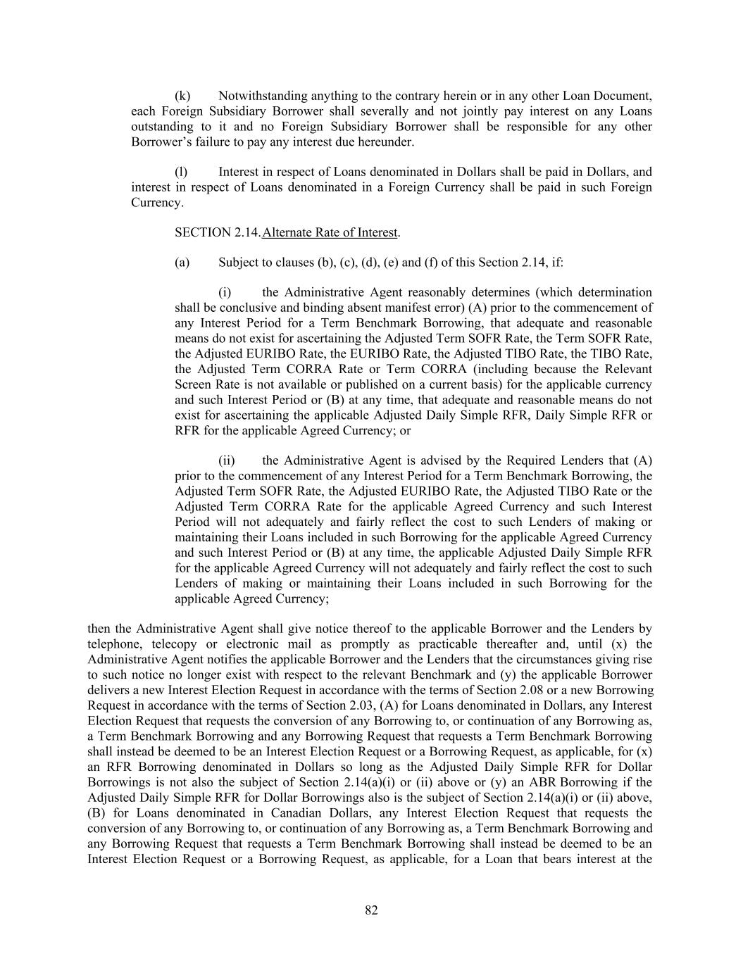 (k) Notwithstanding anything to the contrary herein or in any other Loan Document, each Foreign Subsidiary Borrower shall severally and not jointly pay interest on any Loans outstanding to it and no Foreign Subsidiary Borrower shall be responsible for any other Borrower’s failure to pay any interest due hereunder. (l) Interest in respect of Loans denominated in Dollars shall be paid in Dollars, and interest in respect of Loans denominated in a Foreign Currency shall be paid in such Foreign Currency. SECTION 2.14.Alternate Rate of Interest. (a) Subject to clauses (b), (c), (d), (e) and (f) of this Section 2.14, if: (i) the Administrative Agent reasonably determines (which determination shall be conclusive and binding absent manifest error) (A) prior to the commencement of any Interest Period for a Term Benchmark Borrowing, that adequate and reasonable means do not exist for ascertaining the Adjusted Term SOFR Rate, the Term SOFR Rate, the Adjusted EURIBO Rate, the EURIBO Rate, the Adjusted TIBO Rate, the TIBO Rate, the Adjusted Term CORRA Rate or Term CORRA (including because the Relevant Screen Rate is not available or published on a current basis) for the applicable currency and such Interest Period or (B) at any time, that adequate and reasonable means do not exist for ascertaining the applicable Adjusted Daily Simple RFR, Daily Simple RFR or RFR for the applicable Agreed Currency; or (ii) the Administrative Agent is advised by the Required Lenders that (A) prior to the commencement of any Interest Period for a Term Benchmark Borrowing, the Adjusted Term SOFR Rate, the Adjusted EURIBO Rate, the Adjusted TIBO Rate or the Adjusted Term CORRA Rate for the applicable Agreed Currency and such Interest Period will not adequately and fairly reflect the cost to such Lenders of making or maintaining their Loans included in such Borrowing for the applicable Agreed Currency and such Interest Period or (B) at any time, the applicable Adjusted Daily Simple RFR for the applicable Agreed Currency will not adequately and fairly reflect the cost to such Lenders of making or maintaining their Loans included in such Borrowing for the applicable Agreed Currency; then the Administrative Agent shall give notice thereof to the applicable Borrower and the Lenders by telephone, telecopy or electronic mail as promptly as practicable thereafter and, until (x) the Administrative Agent notifies the applicable Borrower and the Lenders that the circumstances giving rise to such notice no longer exist with respect to the relevant Benchmark and (y) the applicable Borrower delivers a new Interest Election Request in accordance with the terms of Section 2.08 or a new Borrowing Request in accordance with the terms of Section 2.03, (A) for Loans denominated in Dollars, any Interest Election Request that requests the conversion of any Borrowing to, or continuation of any Borrowing as, a Term Benchmark Borrowing and any Borrowing Request that requests a Term Benchmark Borrowing shall instead be deemed to be an Interest Election Request or a Borrowing Request, as applicable, for (x) an RFR Borrowing denominated in Dollars so long as the Adjusted Daily Simple RFR for Dollar Borrowings is not also the subject of Section 2.14(a)(i) or (ii) above or (y) an ABR Borrowing if the Adjusted Daily Simple RFR for Dollar Borrowings also is the subject of Section 2.14(a)(i) or (ii) above, (B) for Loans denominated in Canadian Dollars, any Interest Election Request that requests the conversion of any Borrowing to, or continuation of any Borrowing as, a Term Benchmark Borrowing and any Borrowing Request that requests a Term Benchmark Borrowing shall instead be deemed to be an Interest Election Request or a Borrowing Request, as applicable, for a Loan that bears interest at the 82