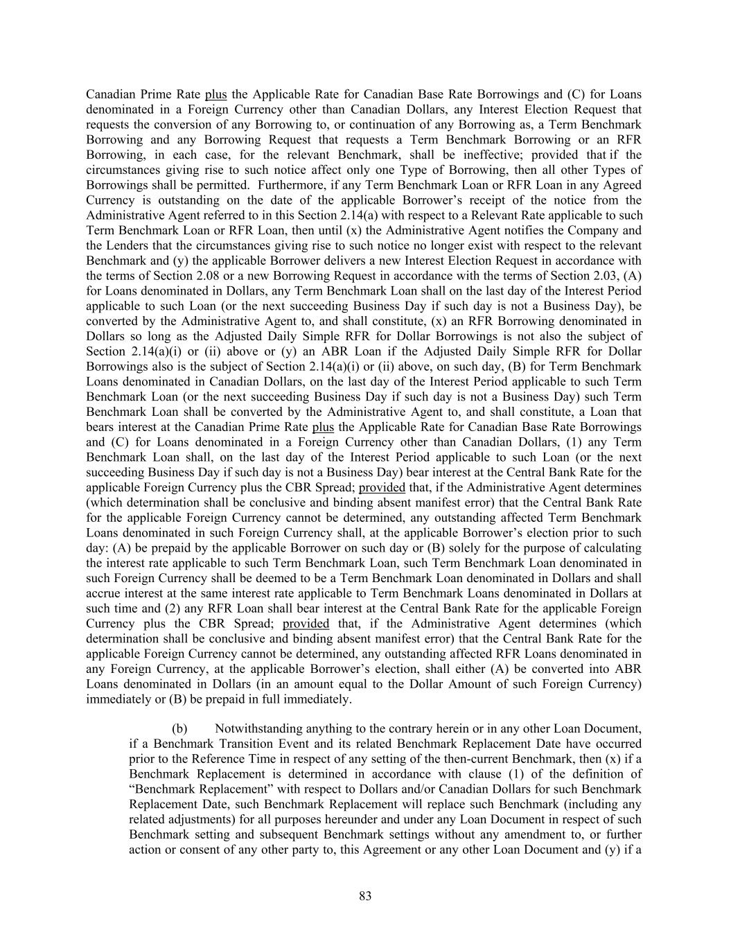 Canadian Prime Rate plus the Applicable Rate for Canadian Base Rate Borrowings and (C) for Loans denominated in a Foreign Currency other than Canadian Dollars, any Interest Election Request that requests the conversion of any Borrowing to, or continuation of any Borrowing as, a Term Benchmark Borrowing and any Borrowing Request that requests a Term Benchmark Borrowing or an RFR Borrowing, in each case, for the relevant Benchmark, shall be ineffective; provided that if the circumstances giving rise to such notice affect only one Type of Borrowing, then all other Types of Borrowings shall be permitted. Furthermore, if any Term Benchmark Loan or RFR Loan in any Agreed Currency is outstanding on the date of the applicable Borrower’s receipt of the notice from the Administrative Agent referred to in this Section 2.14(a) with respect to a Relevant Rate applicable to such Term Benchmark Loan or RFR Loan, then until (x) the Administrative Agent notifies the Company and the Lenders that the circumstances giving rise to such notice no longer exist with respect to the relevant Benchmark and (y) the applicable Borrower delivers a new Interest Election Request in accordance with the terms of Section 2.08 or a new Borrowing Request in accordance with the terms of Section 2.03, (A) for Loans denominated in Dollars, any Term Benchmark Loan shall on the last day of the Interest Period applicable to such Loan (or the next succeeding Business Day if such day is not a Business Day), be converted by the Administrative Agent to, and shall constitute, (x) an RFR Borrowing denominated in Dollars so long as the Adjusted Daily Simple RFR for Dollar Borrowings is not also the subject of Section 2.14(a)(i) or (ii) above or (y) an ABR Loan if the Adjusted Daily Simple RFR for Dollar Borrowings also is the subject of Section 2.14(a)(i) or (ii) above, on such day, (B) for Term Benchmark Loans denominated in Canadian Dollars, on the last day of the Interest Period applicable to such Term Benchmark Loan (or the next succeeding Business Day if such day is not a Business Day) such Term Benchmark Loan shall be converted by the Administrative Agent to, and shall constitute, a Loan that bears interest at the Canadian Prime Rate plus the Applicable Rate for Canadian Base Rate Borrowings and (C) for Loans denominated in a Foreign Currency other than Canadian Dollars, (1) any Term Benchmark Loan shall, on the last day of the Interest Period applicable to such Loan (or the next succeeding Business Day if such day is not a Business Day) bear interest at the Central Bank Rate for the applicable Foreign Currency plus the CBR Spread; provided that, if the Administrative Agent determines (which determination shall be conclusive and binding absent manifest error) that the Central Bank Rate for the applicable Foreign Currency cannot be determined, any outstanding affected Term Benchmark Loans denominated in such Foreign Currency shall, at the applicable Borrower’s election prior to such day: (A) be prepaid by the applicable Borrower on such day or (B) solely for the purpose of calculating the interest rate applicable to such Term Benchmark Loan, such Term Benchmark Loan denominated in such Foreign Currency shall be deemed to be a Term Benchmark Loan denominated in Dollars and shall accrue interest at the same interest rate applicable to Term Benchmark Loans denominated in Dollars at such time and (2) any RFR Loan shall bear interest at the Central Bank Rate for the applicable Foreign Currency plus the CBR Spread; provided that, if the Administrative Agent determines (which determination shall be conclusive and binding absent manifest error) that the Central Bank Rate for the applicable Foreign Currency cannot be determined, any outstanding affected RFR Loans denominated in any Foreign Currency, at the applicable Borrower’s election, shall either (A) be converted into ABR Loans denominated in Dollars (in an amount equal to the Dollar Amount of such Foreign Currency) immediately or (B) be prepaid in full immediately. (b) Notwithstanding anything to the contrary herein or in any other Loan Document, if a Benchmark Transition Event and its related Benchmark Replacement Date have occurred prior to the Reference Time in respect of any setting of the then-current Benchmark, then (x) if a Benchmark Replacement is determined in accordance with clause (1) of the definition of “Benchmark Replacement” with respect to Dollars and/or Canadian Dollars for such Benchmark Replacement Date, such Benchmark Replacement will replace such Benchmark (including any related adjustments) for all purposes hereunder and under any Loan Document in respect of such Benchmark setting and subsequent Benchmark settings without any amendment to, or further action or consent of any other party to, this Agreement or any other Loan Document and (y) if a 83