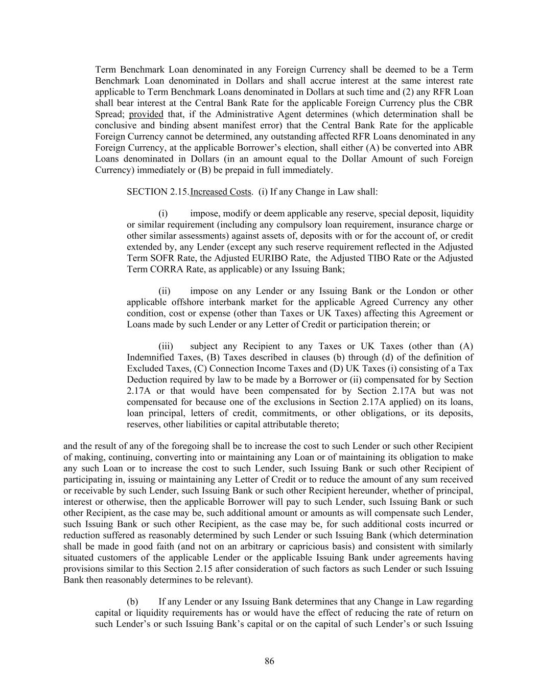 Term Benchmark Loan denominated in any Foreign Currency shall be deemed to be a Term Benchmark Loan denominated in Dollars and shall accrue interest at the same interest rate applicable to Term Benchmark Loans denominated in Dollars at such time and (2) any RFR Loan shall bear interest at the Central Bank Rate for the applicable Foreign Currency plus the CBR Spread; provided that, if the Administrative Agent determines (which determination shall be conclusive and binding absent manifest error) that the Central Bank Rate for the applicable Foreign Currency cannot be determined, any outstanding affected RFR Loans denominated in any Foreign Currency, at the applicable Borrower’s election, shall either (A) be converted into ABR Loans denominated in Dollars (in an amount equal to the Dollar Amount of such Foreign Currency) immediately or (B) be prepaid in full immediately. SECTION 2.15.Increased Costs. (i) If any Change in Law shall: (i) impose, modify or deem applicable any reserve, special deposit, liquidity or similar requirement (including any compulsory loan requirement, insurance charge or other similar assessments) against assets of, deposits with or for the account of, or credit extended by, any Lender (except any such reserve requirement reflected in the Adjusted Term SOFR Rate, the Adjusted EURIBO Rate, the Adjusted TIBO Rate or the Adjusted Term CORRA Rate, as applicable) or any Issuing Bank; (ii) impose on any Lender or any Issuing Bank or the London or other applicable offshore interbank market for the applicable Agreed Currency any other condition, cost or expense (other than Taxes or UK Taxes) affecting this Agreement or Loans made by such Lender or any Letter of Credit or participation therein; or (iii) subject any Recipient to any Taxes or UK Taxes (other than (A) Indemnified Taxes, (B) Taxes described in clauses (b) through (d) of the definition of Excluded Taxes, (C) Connection Income Taxes and (D) UK Taxes (i) consisting of a Tax Deduction required by law to be made by a Borrower or (ii) compensated for by Section 2.17A or that would have been compensated for by Section 2.17A but was not compensated for because one of the exclusions in Section 2.17A applied) on its loans, loan principal, letters of credit, commitments, or other obligations, or its deposits, reserves, other liabilities or capital attributable thereto; and the result of any of the foregoing shall be to increase the cost to such Lender or such other Recipient of making, continuing, converting into or maintaining any Loan or of maintaining its obligation to make any such Loan or to increase the cost to such Lender, such Issuing Bank or such other Recipient of participating in, issuing or maintaining any Letter of Credit or to reduce the amount of any sum received or receivable by such Lender, such Issuing Bank or such other Recipient hereunder, whether of principal, interest or otherwise, then the applicable Borrower will pay to such Lender, such Issuing Bank or such other Recipient, as the case may be, such additional amount or amounts as will compensate such Lender, such Issuing Bank or such other Recipient, as the case may be, for such additional costs incurred or reduction suffered as reasonably determined by such Lender or such Issuing Bank (which determination shall be made in good faith (and not on an arbitrary or capricious basis) and consistent with similarly situated customers of the applicable Lender or the applicable Issuing Bank under agreements having provisions similar to this Section 2.15 after consideration of such factors as such Lender or such Issuing Bank then reasonably determines to be relevant). (b) If any Lender or any Issuing Bank determines that any Change in Law regarding capital or liquidity requirements has or would have the effect of reducing the rate of return on such Lender’s or such Issuing Bank’s capital or on the capital of such Lender’s or such Issuing 86