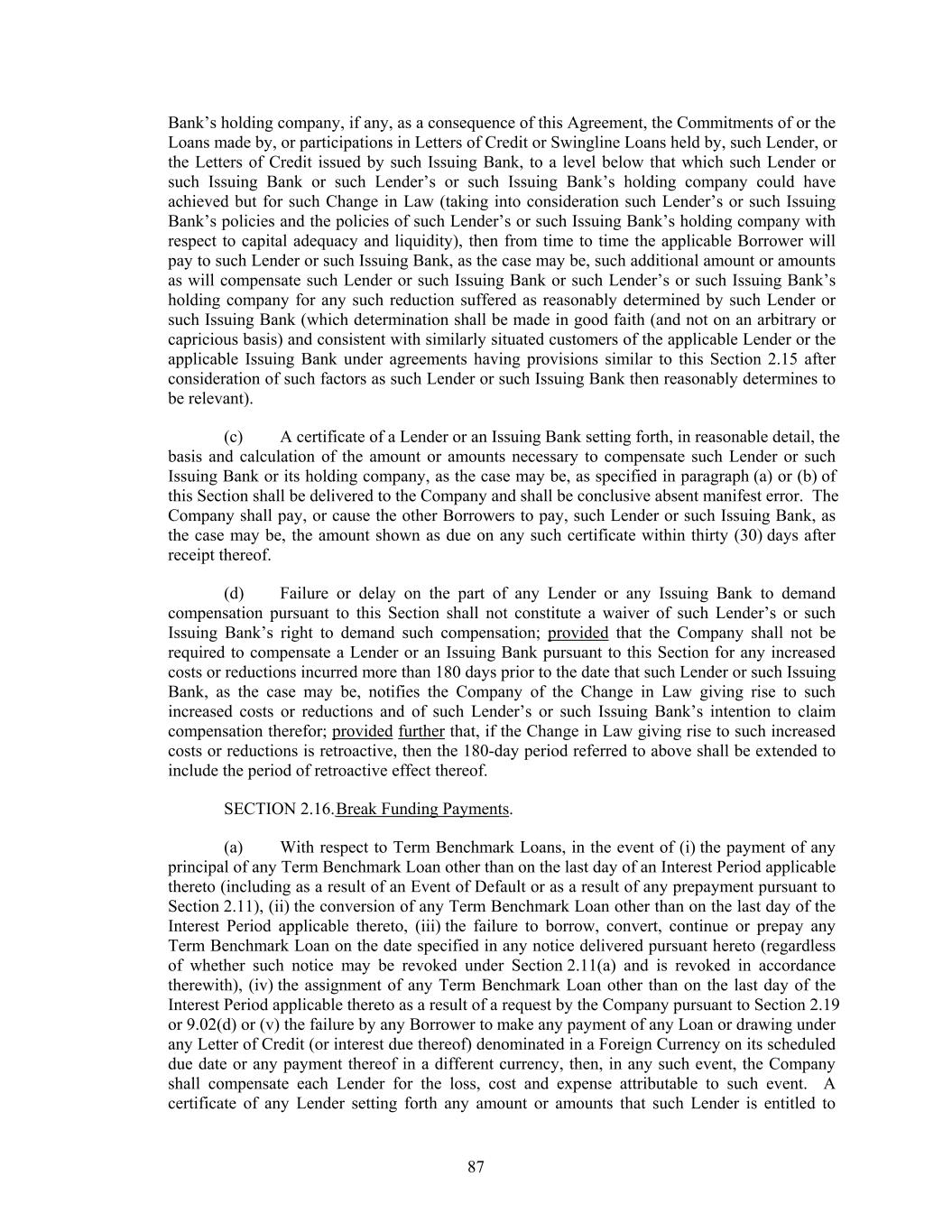 Bank’s holding company, if any, as a consequence of this Agreement, the Commitments of or the Loans made by, or participations in Letters of Credit or Swingline Loans held by, such Lender, or the Letters of Credit issued by such Issuing Bank, to a level below that which such Lender or such Issuing Bank or such Lender’s or such Issuing Bank’s holding company could have achieved but for such Change in Law (taking into consideration such Lender’s or such Issuing Bank’s policies and the policies of such Lender’s or such Issuing Bank’s holding company with respect to capital adequacy and liquidity), then from time to time the applicable Borrower will pay to such Lender or such Issuing Bank, as the case may be, such additional amount or amounts as will compensate such Lender or such Issuing Bank or such Lender’s or such Issuing Bank’s holding company for any such reduction suffered as reasonably determined by such Lender or such Issuing Bank (which determination shall be made in good faith (and not on an arbitrary or capricious basis) and consistent with similarly situated customers of the applicable Lender or the applicable Issuing Bank under agreements having provisions similar to this Section 2.15 after consideration of such factors as such Lender or such Issuing Bank then reasonably determines to be relevant). (c) A certificate of a Lender or an Issuing Bank setting forth, in reasonable detail, the basis and calculation of the amount or amounts necessary to compensate such Lender or such Issuing Bank or its holding company, as the case may be, as specified in paragraph (a) or (b) of this Section shall be delivered to the Company and shall be conclusive absent manifest error. The Company shall pay, or cause the other Borrowers to pay, such Lender or such Issuing Bank, as the case may be, the amount shown as due on any such certificate within thirty (30) days after receipt thereof. (d) Failure or delay on the part of any Lender or any Issuing Bank to demand compensation pursuant to this Section shall not constitute a waiver of such Lender’s or such Issuing Bank’s right to demand such compensation; provided that the Company shall not be required to compensate a Lender or an Issuing Bank pursuant to this Section for any increased costs or reductions incurred more than 180 days prior to the date that such Lender or such Issuing Bank, as the case may be, notifies the Company of the Change in Law giving rise to such increased costs or reductions and of such Lender’s or such Issuing Bank’s intention to claim compensation therefor; provided further that, if the Change in Law giving rise to such increased costs or reductions is retroactive, then the 180-day period referred to above shall be extended to include the period of retroactive effect thereof. SECTION 2.16.Break Funding Payments. (a) With respect to Term Benchmark Loans, in the event of (i) the payment of any principal of any Term Benchmark Loan other than on the last day of an Interest Period applicable thereto (including as a result of an Event of Default or as a result of any prepayment pursuant to Section 2.11), (ii) the conversion of any Term Benchmark Loan other than on the last day of the Interest Period applicable thereto, (iii) the failure to borrow, convert, continue or prepay any Term Benchmark Loan on the date specified in any notice delivered pursuant hereto (regardless of whether such notice may be revoked under Section 2.11(a) and is revoked in accordance therewith), (iv) the assignment of any Term Benchmark Loan other than on the last day of the Interest Period applicable thereto as a result of a request by the Company pursuant to Section 2.19 or 9.02(d) or (v) the failure by any Borrower to make any payment of any Loan or drawing under any Letter of Credit (or interest due thereof) denominated in a Foreign Currency on its scheduled due date or any payment thereof in a different currency, then, in any such event, the Company shall compensate each Lender for the loss, cost and expense attributable to such event. A certificate of any Lender setting forth any amount or amounts that such Lender is entitled to 87