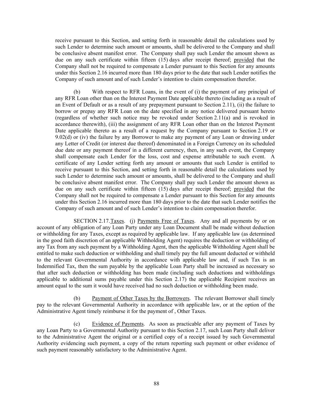 receive pursuant to this Section, and setting forth in reasonable detail the calculations used by such Lender to determine such amount or amounts, shall be delivered to the Company and shall be conclusive absent manifest error. The Company shall pay such Lender the amount shown as due on any such certificate within fifteen (15) days after receipt thereof; provided that the Company shall not be required to compensate a Lender pursuant to this Section for any amounts under this Section 2.16 incurred more than 180 days prior to the date that such Lender notifies the Company of such amount and of such Lender’s intention to claim compensation therefor. (b) With respect to RFR Loans, in the event of (i) the payment of any principal of any RFR Loan other than on the Interest Payment Date applicable thereto (including as a result of an Event of Default or as a result of any prepayment pursuant to Section 2.11), (ii) the failure to borrow or prepay any RFR Loan on the date specified in any notice delivered pursuant hereto (regardless of whether such notice may be revoked under Section 2.11(a) and is revoked in accordance therewith), (iii) the assignment of any RFR Loan other than on the Interest Payment Date applicable thereto as a result of a request by the Company pursuant to Section 2.19 or 9.02(d) or (iv) the failure by any Borrower to make any payment of any Loan or drawing under any Letter of Credit (or interest due thereof) denominated in a Foreign Currency on its scheduled due date or any payment thereof in a different currency, then, in any such event, the Company shall compensate each Lender for the loss, cost and expense attributable to such event. A certificate of any Lender setting forth any amount or amounts that such Lender is entitled to receive pursuant to this Section, and setting forth in reasonable detail the calculations used by such Lender to determine such amount or amounts, shall be delivered to the Company and shall be conclusive absent manifest error. The Company shall pay such Lender the amount shown as due on any such certificate within fifteen (15) days after receipt thereof; provided that the Company shall not be required to compensate a Lender pursuant to this Section for any amounts under this Section 2.16 incurred more than 180 days prior to the date that such Lender notifies the Company of such amount and of such Lender’s intention to claim compensation therefor. SECTION 2.17.Taxes. (j) Payments Free of Taxes. Any and all payments by or on account of any obligation of any Loan Party under any Loan Document shall be made without deduction or withholding for any Taxes, except as required by applicable law. If any applicable law (as determined in the good faith discretion of an applicable Withholding Agent) requires the deduction or withholding of any Tax from any such payment by a Withholding Agent, then the applicable Withholding Agent shall be entitled to make such deduction or withholding and shall timely pay the full amount deducted or withheld to the relevant Governmental Authority in accordance with applicable law and, if such Tax is an Indemnified Tax, then the sum payable by the applicable Loan Party shall be increased as necessary so that after such deduction or withholding has been made (including such deductions and withholdings applicable to additional sums payable under this Section 2.17) the applicable Recipient receives an amount equal to the sum it would have received had no such deduction or withholding been made. (b) Payment of Other Taxes by the Borrowers. The relevant Borrower shall timely pay to the relevant Governmental Authority in accordance with applicable law, or at the option of the Administrative Agent timely reimburse it for the payment of , Other Taxes. (c) Evidence of Payments. As soon as practicable after any payment of Taxes by any Loan Party to a Governmental Authority pursuant to this Section 2.17, such Loan Party shall deliver to the Administrative Agent the original or a certified copy of a receipt issued by such Governmental Authority evidencing such payment, a copy of the return reporting such payment or other evidence of such payment reasonably satisfactory to the Administrative Agent. 88
