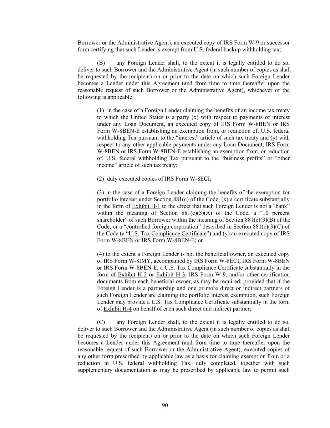 Borrower or the Administrative Agent), an executed copy of IRS Form W-9 or successor form certifying that such Lender is exempt from U.S. federal backup withholding tax; (B) any Foreign Lender shall, to the extent it is legally entitled to do so, deliver to such Borrower and the Administrative Agent (in such number of copies as shall be requested by the recipient) on or prior to the date on which such Foreign Lender becomes a Lender under this Agreement (and from time to time thereafter upon the reasonable request of such Borrower or the Administrative Agent), whichever of the following is applicable: (1) in the case of a Foreign Lender claiming the benefits of an income tax treaty to which the United States is a party (x) with respect to payments of interest under any Loan Document, an executed copy of IRS Form W-8BEN or IRS Form W-8BEN-E establishing an exemption from, or reduction of, U.S. federal withholding Tax pursuant to the “interest” article of such tax treaty and (y) with respect to any other applicable payments under any Loan Document, IRS Form W-8BEN or IRS Form W-8BEN-E establishing an exemption from, or reduction of, U.S. federal withholding Tax pursuant to the “business profits” or “other income” article of such tax treaty; (2) duly executed copies of IRS Form W-8ECI; (3) in the case of a Foreign Lender claiming the benefits of the exemption for portfolio interest under Section 881(c) of the Code, (x) a certificate substantially in the form of Exhibit H-1 to the effect that such Foreign Lender is not a “bank” within the meaning of Section 881(c)(3)(A) of the Code, a “10 percent shareholder” of such Borrower within the meaning of Section 881(c)(3)(B) of the Code, or a “controlled foreign corporation” described in Section 881(c)(3)(C) of the Code (a “U.S. Tax Compliance Certificate”) and (y) an executed copy of IRS Form W-8BEN or IRS Form W-8BEN-E; or (4) to the extent a Foreign Lender is not the beneficial owner, an executed copy of IRS Form W-8IMY, accompanied by IRS Form W-8ECI, IRS Form W-8BEN or IRS Form W-8BEN-E, a U.S. Tax Compliance Certificate substantially in the form of Exhibit H-2 or Exhibit H-3, IRS Form W-9, and/or other certification documents from each beneficial owner, as may be required; provided that if the Foreign Lender is a partnership and one or more direct or indirect partners of such Foreign Lender are claiming the portfolio interest exemption, such Foreign Lender may provide a U.S. Tax Compliance Certificate substantially in the form of Exhibit H-4 on behalf of each such direct and indirect partner; (C) any Foreign Lender shall, to the extent it is legally entitled to do so, deliver to such Borrower and the Administrative Agent (in such number of copies as shall be requested by the recipient) on or prior to the date on which such Foreign Lender becomes a Lender under this Agreement (and from time to time thereafter upon the reasonable request of such Borrower or the Administrative Agent), executed copies of any other form prescribed by applicable law as a basis for claiming exemption from or a reduction in U.S. federal withholding Tax, duly completed, together with such supplementary documentation as may be prescribed by applicable law to permit such 90
