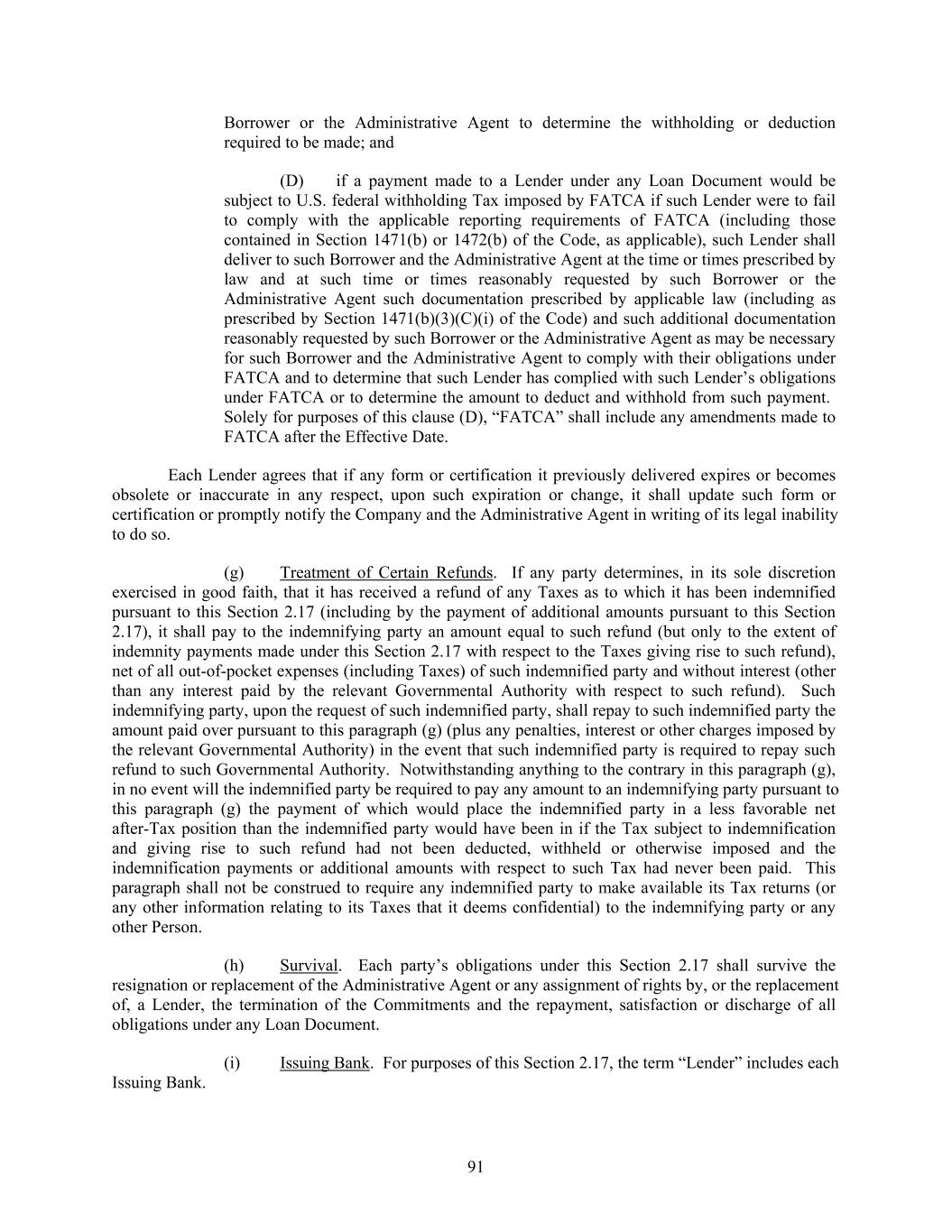 Borrower or the Administrative Agent to determine the withholding or deduction required to be made; and (D) if a payment made to a Lender under any Loan Document would be subject to U.S. federal withholding Tax imposed by FATCA if such Lender were to fail to comply with the applicable reporting requirements of FATCA (including those contained in Section 1471(b) or 1472(b) of the Code, as applicable), such Lender shall deliver to such Borrower and the Administrative Agent at the time or times prescribed by law and at such time or times reasonably requested by such Borrower or the Administrative Agent such documentation prescribed by applicable law (including as prescribed by Section 1471(b)(3)(C)(i) of the Code) and such additional documentation reasonably requested by such Borrower or the Administrative Agent as may be necessary for such Borrower and the Administrative Agent to comply with their obligations under FATCA and to determine that such Lender has complied with such Lender’s obligations under FATCA or to determine the amount to deduct and withhold from such payment. Solely for purposes of this clause (D), “FATCA” shall include any amendments made to FATCA after the Effective Date. Each Lender agrees that if any form or certification it previously delivered expires or becomes obsolete or inaccurate in any respect, upon such expiration or change, it shall update such form or certification or promptly notify the Company and the Administrative Agent in writing of its legal inability to do so. (g) Treatment of Certain Refunds. If any party determines, in its sole discretion exercised in good faith, that it has received a refund of any Taxes as to which it has been indemnified pursuant to this Section 2.17 (including by the payment of additional amounts pursuant to this Section 2.17), it shall pay to the indemnifying party an amount equal to such refund (but only to the extent of indemnity payments made under this Section 2.17 with respect to the Taxes giving rise to such refund), net of all out-of-pocket expenses (including Taxes) of such indemnified party and without interest (other than any interest paid by the relevant Governmental Authority with respect to such refund). Such indemnifying party, upon the request of such indemnified party, shall repay to such indemnified party the amount paid over pursuant to this paragraph (g) (plus any penalties, interest or other charges imposed by the relevant Governmental Authority) in the event that such indemnified party is required to repay such refund to such Governmental Authority. Notwithstanding anything to the contrary in this paragraph (g), in no event will the indemnified party be required to pay any amount to an indemnifying party pursuant to this paragraph (g) the payment of which would place the indemnified party in a less favorable net after-Tax position than the indemnified party would have been in if the Tax subject to indemnification and giving rise to such refund had not been deducted, withheld or otherwise imposed and the indemnification payments or additional amounts with respect to such Tax had never been paid. This paragraph shall not be construed to require any indemnified party to make available its Tax returns (or any other information relating to its Taxes that it deems confidential) to the indemnifying party or any other Person. (h) Survival. Each party’s obligations under this Section 2.17 shall survive the resignation or replacement of the Administrative Agent or any assignment of rights by, or the replacement of, a Lender, the termination of the Commitments and the repayment, satisfaction or discharge of all obligations under any Loan Document. (i) Issuing Bank. For purposes of this Section 2.17, the term “Lender” includes each Issuing Bank. 91