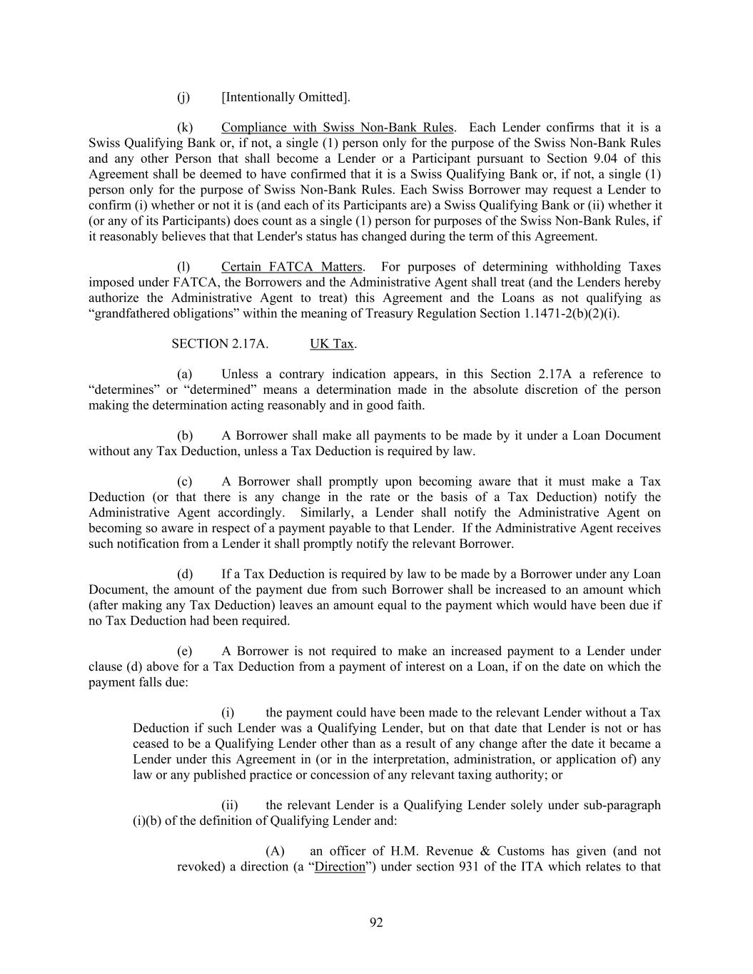 (j) [Intentionally Omitted]. (k) Compliance with Swiss Non-Bank Rules. Each Lender confirms that it is a Swiss Qualifying Bank or, if not, a single (1) person only for the purpose of the Swiss Non-Bank Rules and any other Person that shall become a Lender or a Participant pursuant to Section 9.04 of this Agreement shall be deemed to have confirmed that it is a Swiss Qualifying Bank or, if not, a single (1) person only for the purpose of Swiss Non-Bank Rules. Each Swiss Borrower may request a Lender to confirm (i) whether or not it is (and each of its Participants are) a Swiss Qualifying Bank or (ii) whether it (or any of its Participants) does count as a single (1) person for purposes of the Swiss Non-Bank Rules, if it reasonably believes that that Lender's status has changed during the term of this Agreement. (l) Certain FATCA Matters. For purposes of determining withholding Taxes imposed under FATCA, the Borrowers and the Administrative Agent shall treat (and the Lenders hereby authorize the Administrative Agent to treat) this Agreement and the Loans as not qualifying as “grandfathered obligations” within the meaning of Treasury Regulation Section 1.1471-2(b)(2)(i). SECTION 2.17A. UK Tax. (a) Unless a contrary indication appears, in this Section 2.17A a reference to “determines” or “determined” means a determination made in the absolute discretion of the person making the determination acting reasonably and in good faith. (b) A Borrower shall make all payments to be made by it under a Loan Document without any Tax Deduction, unless a Tax Deduction is required by law. (c) A Borrower shall promptly upon becoming aware that it must make a Tax Deduction (or that there is any change in the rate or the basis of a Tax Deduction) notify the Administrative Agent accordingly. Similarly, a Lender shall notify the Administrative Agent on becoming so aware in respect of a payment payable to that Lender. If the Administrative Agent receives such notification from a Lender it shall promptly notify the relevant Borrower. (d) If a Tax Deduction is required by law to be made by a Borrower under any Loan Document, the amount of the payment due from such Borrower shall be increased to an amount which (after making any Tax Deduction) leaves an amount equal to the payment which would have been due if no Tax Deduction had been required. (e) A Borrower is not required to make an increased payment to a Lender under clause (d) above for a Tax Deduction from a payment of interest on a Loan, if on the date on which the payment falls due: (i) the payment could have been made to the relevant Lender without a Tax Deduction if such Lender was a Qualifying Lender, but on that date that Lender is not or has ceased to be a Qualifying Lender other than as a result of any change after the date it became a Lender under this Agreement in (or in the interpretation, administration, or application of) any law or any published practice or concession of any relevant taxing authority; or (ii) the relevant Lender is a Qualifying Lender solely under sub-paragraph (i)(b) of the definition of Qualifying Lender and: (A) an officer of H.M. Revenue & Customs has given (and not revoked) a direction (a “Direction”) under section 931 of the ITA which relates to that 92