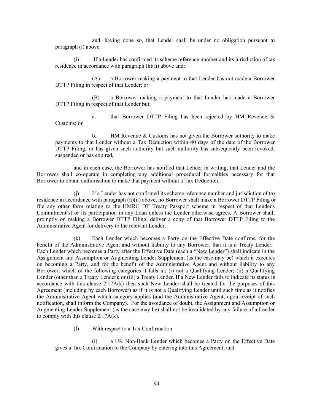 and, having done so, that Lender shall be under no obligation pursuant to paragraph (i) above. (i) If a Lender has confirmed its scheme reference number and its jurisdiction of tax residence in accordance with paragraph (h)(ii) above and: (A) a Borrower making a payment to that Lender has not made a Borrower DTTP Filing in respect of that Lender; or (B) a Borrower making a payment to that Lender has made a Borrower DTTP Filing in respect of that Lender but: a. that Borrower DTTP Filing has been rejected by HM Revenue & Customs; or b. HM Revenue & Customs has not given the Borrower authority to make payments to that Lender without a Tax Deduction within 40 days of the date of the Borrower DTTP Filing, or has given such authority but such authority has subsequently been revoked, suspended or has expired, and in each case, the Borrower has notified that Lender in writing, that Lender and the Borrower shall co-operate in completing any additional procedural formalities necessary for that Borrower to obtain authorisation to make that payment without a Tax Deduction. (j) If a Lender has not confirmed its scheme reference number and jurisdiction of tax residence in accordance with paragraph (h)(ii) above, no Borrower shall make a Borrower DTTP Filing or file any other form relating to the HMRC DT Treaty Passport scheme in respect of that Lender's Commitment(s) or its participation in any Loan unless the Lender otherwise agrees. A Borrower shall, promptly on making a Borrower DTTP Filing, deliver a copy of that Borrower DTTP Filing to the Administrative Agent for delivery to the relevant Lender. (k) Each Lender which becomes a Party on the Effective Date confirms, for the benefit of the Administrative Agent and without liability to any Borrower, that it is a Treaty Lender. Each Lender which becomes a Party after the Effective Date (each a “New Lender”) shall indicate in the Assignment and Assumption or Augmenting Lender Supplement (as the case may be) which it executes on becoming a Party, and for the benefit of the Administrative Agent and without liability to any Borrower, which of the following categories it falls in: (i) not a Qualifying Lender; (ii) a Qualifying Lender (other than a Treaty Lender); or (iii) a Treaty Lender. If a New Lender fails to indicate its status in accordance with this clause 2.17A(k) then such New Lender shall be treated for the purposes of this Agreement (including by each Borrower) as if it is not a Qualifying Lender until such time as it notifies the Administrative Agent which category applies (and the Administrative Agent, upon receipt of such notification, shall inform the Company). For the avoidance of doubt, the Assignment and Assumption or Augmenting Lender Supplement (as the case may be) shall not be invalidated by any failure of a Lender to comply with this clause 2.17A(k). (l) With respect to a Tax Confirmation: (i) a UK Non-Bank Lender which becomes a Party on the Effective Date gives a Tax Confirmation to the Company by entering into this Agreement; and 94