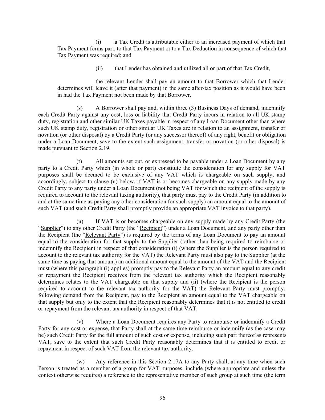 (i) a Tax Credit is attributable either to an increased payment of which that Tax Payment forms part, to that Tax Payment or to a Tax Deduction in consequence of which that Tax Payment was required; and (ii) that Lender has obtained and utilized all or part of that Tax Credit, the relevant Lender shall pay an amount to that Borrower which that Lender determines will leave it (after that payment) in the same after-tax position as it would have been in had the Tax Payment not been made by that Borrower. (s) A Borrower shall pay and, within three (3) Business Days of demand, indemnify each Credit Party against any cost, loss or liability that Credit Party incurs in relation to all UK stamp duty, registration and other similar UK Taxes payable in respect of any Loan Document other than where such UK stamp duty, registration or other similar UK Taxes are in relation to an assignment, transfer or novation (or other disposal) by a Credit Party (or any successor thereof) of any right, benefit or obligation under a Loan Document, save to the extent such assignment, transfer or novation (or other disposal) is made pursuant to Section 2.19. (t) All amounts set out, or expressed to be payable under a Loan Document by any party to a Credit Party which (in whole or part) constitute the consideration for any supply for VAT purposes shall be deemed to be exclusive of any VAT which is chargeable on such supply, and accordingly, subject to clause (u) below, if VAT is or becomes chargeable on any supply made by any Credit Party to any party under a Loan Document (not being VAT for which the recipient of the supply is required to account to the relevant taxing authority), that party must pay to the Credit Party (in addition to and at the same time as paying any other consideration for such supply) an amount equal to the amount of such VAT (and such Credit Party shall promptly provide an appropriate VAT invoice to that party). (u) If VAT is or becomes chargeable on any supply made by any Credit Party (the “Supplier”) to any other Credit Party (the “Recipient”) under a Loan Document, and any party other than the Recipient (the “Relevant Party”) is required by the terms of any Loan Document to pay an amount equal to the consideration for that supply to the Supplier (rather than being required to reimburse or indemnify the Recipient in respect of that consideration (i) (where the Supplier is the person required to account to the relevant tax authority for the VAT) the Relevant Party must also pay to the Supplier (at the same time as paying that amount) an additional amount equal to the amount of the VAT and the Recipient must (where this paragraph (i) applies) promptly pay to the Relevant Party an amount equal to any credit or repayment the Recipient receives from the relevant tax authority which the Recipient reasonably determines relates to the VAT chargeable on that supply and (ii) (where the Recipient is the person required to account to the relevant tax authority for the VAT) the Relevant Party must promptly, following demand from the Recipient, pay to the Recipient an amount equal to the VAT chargeable on that supply but only to the extent that the Recipient reasonably determines that it is not entitled to credit or repayment from the relevant tax authority in respect of that VAT. (v) Where a Loan Document requires any Party to reimburse or indemnify a Credit Party for any cost or expense, that Party shall at the same time reimburse or indemnify (as the case may be) such Credit Party for the full amount of such cost or expense, including such part thereof as represents VAT, save to the extent that such Credit Party reasonably determines that it is entitled to credit or repayment in respect of such VAT from the relevant tax authority. (w) Any reference in this Section 2.17A to any Party shall, at any time when such Person is treated as a member of a group for VAT purposes, include (where appropriate and unless the context otherwise requires) a reference to the representative member of such group at such time (the term 96