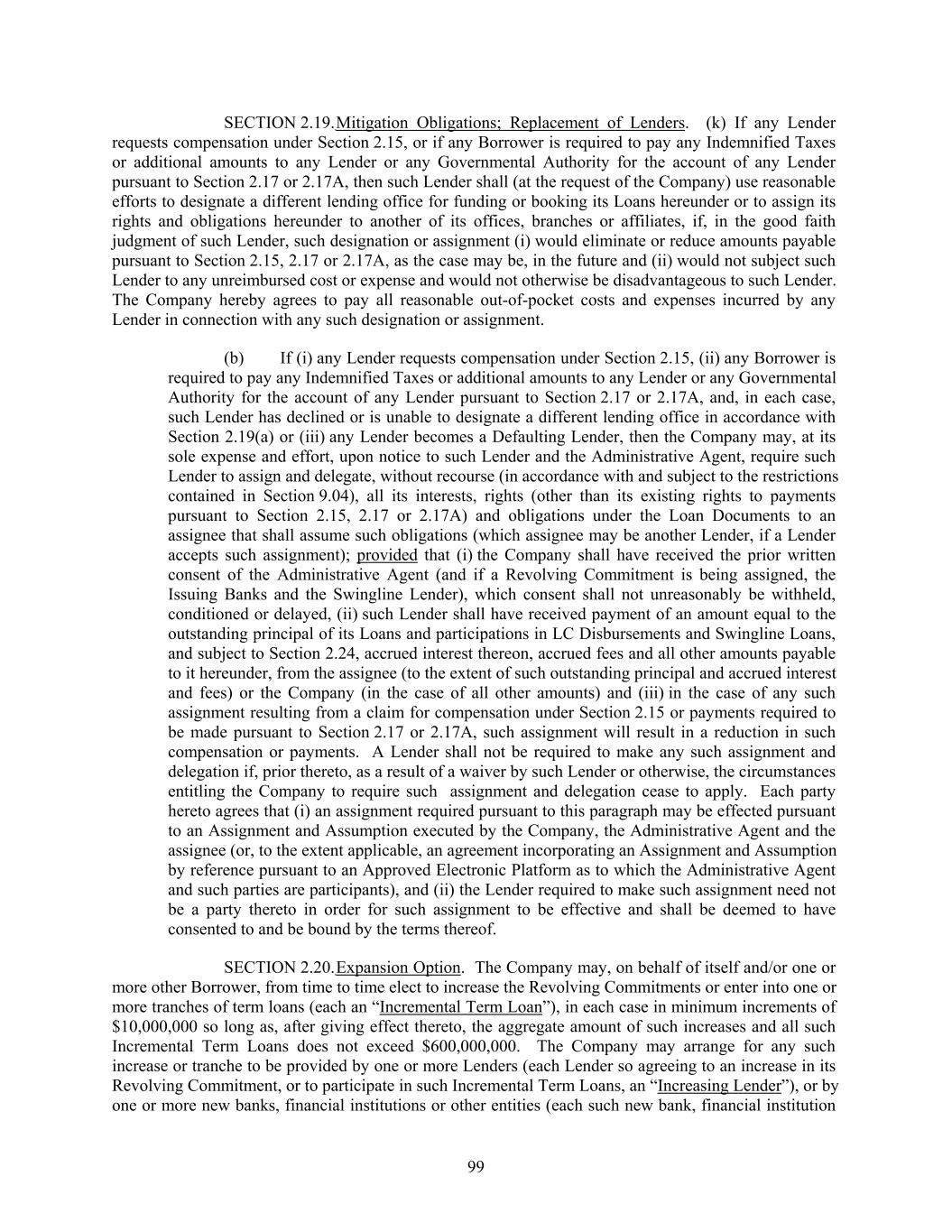 SECTION 2.19.Mitigation Obligations; Replacement of Lenders. (k) If any Lender requests compensation under Section 2.15, or if any Borrower is required to pay any Indemnified Taxes or additional amounts to any Lender or any Governmental Authority for the account of any Lender pursuant to Section 2.17 or 2.17A, then such Lender shall (at the request of the Company) use reasonable efforts to designate a different lending office for funding or booking its Loans hereunder or to assign its rights and obligations hereunder to another of its offices, branches or affiliates, if, in the good faith judgment of such Lender, such designation or assignment (i) would eliminate or reduce amounts payable pursuant to Section 2.15, 2.17 or 2.17A, as the case may be, in the future and (ii) would not subject such Lender to any unreimbursed cost or expense and would not otherwise be disadvantageous to such Lender. The Company hereby agrees to pay all reasonable out-of-pocket costs and expenses incurred by any Lender in connection with any such designation or assignment. (b) If (i) any Lender requests compensation under Section 2.15, (ii) any Borrower is required to pay any Indemnified Taxes or additional amounts to any Lender or any Governmental Authority for the account of any Lender pursuant to Section 2.17 or 2.17A, and, in each case, such Lender has declined or is unable to designate a different lending office in accordance with Section 2.19(a) or (iii) any Lender becomes a Defaulting Lender, then the Company may, at its sole expense and effort, upon notice to such Lender and the Administrative Agent, require such Lender to assign and delegate, without recourse (in accordance with and subject to the restrictions contained in Section 9.04), all its interests, rights (other than its existing rights to payments pursuant to Section 2.15, 2.17 or 2.17A) and obligations under the Loan Documents to an assignee that shall assume such obligations (which assignee may be another Lender, if a Lender accepts such assignment); provided that (i) the Company shall have received the prior written consent of the Administrative Agent (and if a Revolving Commitment is being assigned, the Issuing Banks and the Swingline Lender), which consent shall not unreasonably be withheld, conditioned or delayed, (ii) such Lender shall have received payment of an amount equal to the outstanding principal of its Loans and participations in LC Disbursements and Swingline Loans, and subject to Section 2.24, accrued interest thereon, accrued fees and all other amounts payable to it hereunder, from the assignee (to the extent of such outstanding principal and accrued interest and fees) or the Company (in the case of all other amounts) and (iii) in the case of any such assignment resulting from a claim for compensation under Section 2.15 or payments required to be made pursuant to Section 2.17 or 2.17A, such assignment will result in a reduction in such compensation or payments. A Lender shall not be required to make any such assignment and delegation if, prior thereto, as a result of a waiver by such Lender or otherwise, the circumstances entitling the Company to require such assignment and delegation cease to apply. Each party hereto agrees that (i) an assignment required pursuant to this paragraph may be effected pursuant to an Assignment and Assumption executed by the Company, the Administrative Agent and the assignee (or, to the extent applicable, an agreement incorporating an Assignment and Assumption by reference pursuant to an Approved Electronic Platform as to which the Administrative Agent and such parties are participants), and (ii) the Lender required to make such assignment need not be a party thereto in order for such assignment to be effective and shall be deemed to have consented to and be bound by the terms thereof. SECTION 2.20.Expansion Option. The Company may, on behalf of itself and/or one or more other Borrower, from time to time elect to increase the Revolving Commitments or enter into one or more tranches of term loans (each an “Incremental Term Loan”), in each case in minimum increments of $10,000,000 so long as, after giving effect thereto, the aggregate amount of such increases and all such Incremental Term Loans does not exceed $600,000,000. The Company may arrange for any such increase or tranche to be provided by one or more Lenders (each Lender so agreeing to an increase in its Revolving Commitment, or to participate in such Incremental Term Loans, an “Increasing Lender”), or by one or more new banks, financial institutions or other entities (each such new bank, financial institution 99