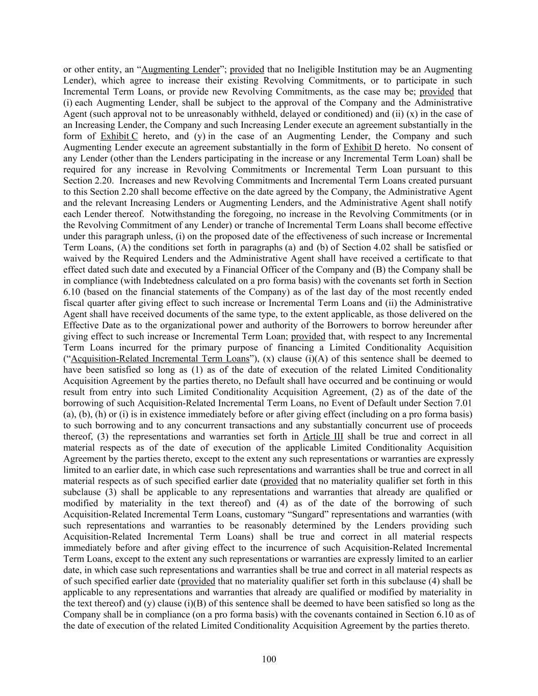 or other entity, an “Augmenting Lender”; provided that no Ineligible Institution may be an Augmenting Lender), which agree to increase their existing Revolving Commitments, or to participate in such Incremental Term Loans, or provide new Revolving Commitments, as the case may be; provided that (i) each Augmenting Lender, shall be subject to the approval of the Company and the Administrative Agent (such approval not to be unreasonably withheld, delayed or conditioned) and (ii) (x) in the case of an Increasing Lender, the Company and such Increasing Lender execute an agreement substantially in the form of Exhibit C hereto, and (y) in the case of an Augmenting Lender, the Company and such Augmenting Lender execute an agreement substantially in the form of Exhibit D hereto. No consent of any Lender (other than the Lenders participating in the increase or any Incremental Term Loan) shall be required for any increase in Revolving Commitments or Incremental Term Loan pursuant to this Section 2.20. Increases and new Revolving Commitments and Incremental Term Loans created pursuant to this Section 2.20 shall become effective on the date agreed by the Company, the Administrative Agent and the relevant Increasing Lenders or Augmenting Lenders, and the Administrative Agent shall notify each Lender thereof. Notwithstanding the foregoing, no increase in the Revolving Commitments (or in the Revolving Commitment of any Lender) or tranche of Incremental Term Loans shall become effective under this paragraph unless, (i) on the proposed date of the effectiveness of such increase or Incremental Term Loans, (A) the conditions set forth in paragraphs (a) and (b) of Section 4.02 shall be satisfied or waived by the Required Lenders and the Administrative Agent shall have received a certificate to that effect dated such date and executed by a Financial Officer of the Company and (B) the Company shall be in compliance (with Indebtedness calculated on a pro forma basis) with the covenants set forth in Section 6.10 (based on the financial statements of the Company) as of the last day of the most recently ended fiscal quarter after giving effect to such increase or Incremental Term Loans and (ii) the Administrative Agent shall have received documents of the same type, to the extent applicable, as those delivered on the Effective Date as to the organizational power and authority of the Borrowers to borrow hereunder after giving effect to such increase or Incremental Term Loan; provided that, with respect to any Incremental Term Loans incurred for the primary purpose of financing a Limited Conditionality Acquisition (“Acquisition-Related Incremental Term Loans”), (x) clause (i)(A) of this sentence shall be deemed to have been satisfied so long as (1) as of the date of execution of the related Limited Conditionality Acquisition Agreement by the parties thereto, no Default shall have occurred and be continuing or would result from entry into such Limited Conditionality Acquisition Agreement, (2) as of the date of the borrowing of such Acquisition-Related Incremental Term Loans, no Event of Default under Section 7.01 (a), (b), (h) or (i) is in existence immediately before or after giving effect (including on a pro forma basis) to such borrowing and to any concurrent transactions and any substantially concurrent use of proceeds thereof, (3) the representations and warranties set forth in Article III shall be true and correct in all material respects as of the date of execution of the applicable Limited Conditionality Acquisition Agreement by the parties thereto, except to the extent any such representations or warranties are expressly limited to an earlier date, in which case such representations and warranties shall be true and correct in all material respects as of such specified earlier date (provided that no materiality qualifier set forth in this subclause (3) shall be applicable to any representations and warranties that already are qualified or modified by materiality in the text thereof) and (4) as of the date of the borrowing of such Acquisition-Related Incremental Term Loans, customary “Sungard” representations and warranties (with such representations and warranties to be reasonably determined by the Lenders providing such Acquisition-Related Incremental Term Loans) shall be true and correct in all material respects immediately before and after giving effect to the incurrence of such Acquisition-Related Incremental Term Loans, except to the extent any such representations or warranties are expressly limited to an earlier date, in which case such representations and warranties shall be true and correct in all material respects as of such specified earlier date (provided that no materiality qualifier set forth in this subclause (4) shall be applicable to any representations and warranties that already are qualified or modified by materiality in the text thereof) and (y) clause (i)(B) of this sentence shall be deemed to have been satisfied so long as the Company shall be in compliance (on a pro forma basis) with the covenants contained in Section 6.10 as of the date of execution of the related Limited Conditionality Acquisition Agreement by the parties thereto. 100