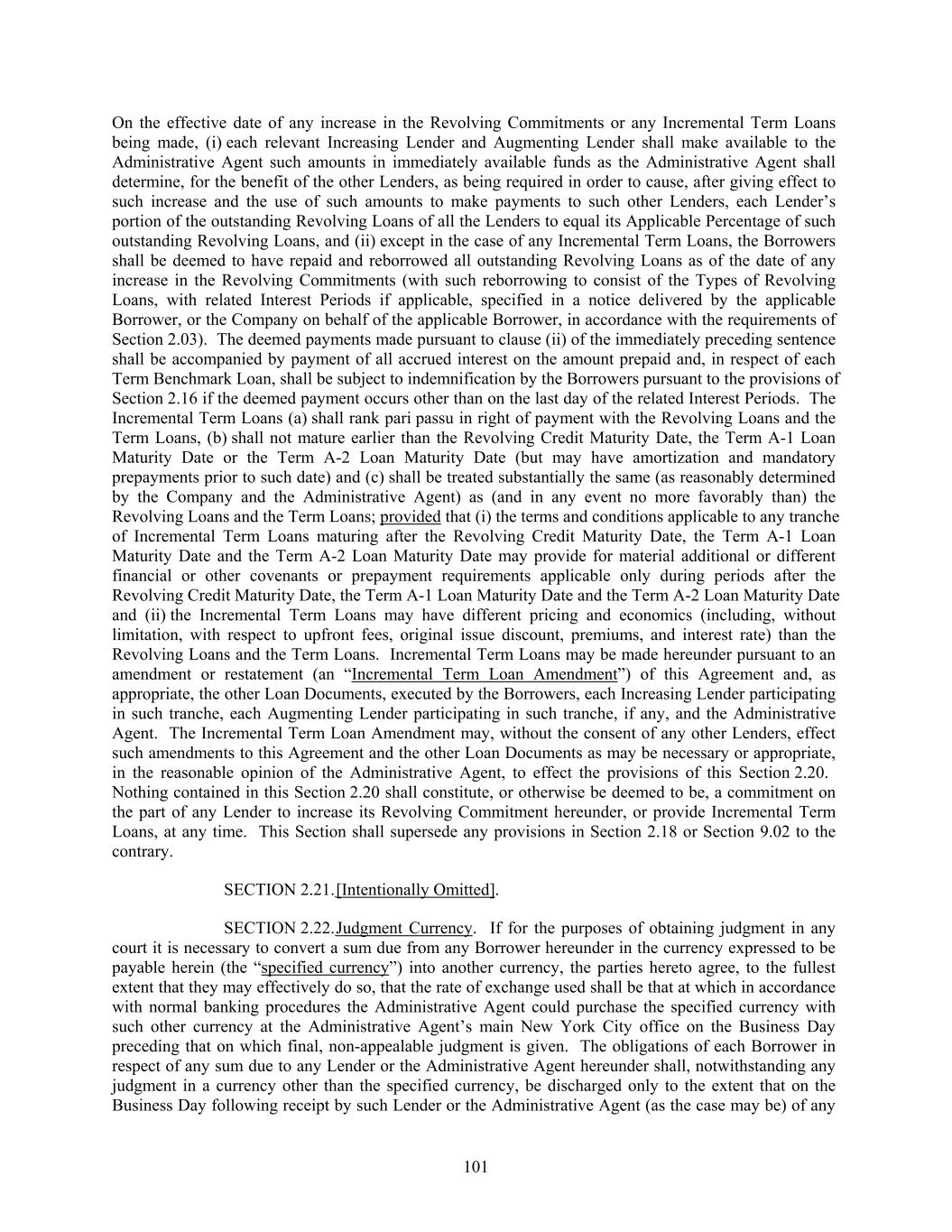 On the effective date of any increase in the Revolving Commitments or any Incremental Term Loans being made, (i) each relevant Increasing Lender and Augmenting Lender shall make available to the Administrative Agent such amounts in immediately available funds as the Administrative Agent shall determine, for the benefit of the other Lenders, as being required in order to cause, after giving effect to such increase and the use of such amounts to make payments to such other Lenders, each Lender’s portion of the outstanding Revolving Loans of all the Lenders to equal its Applicable Percentage of such outstanding Revolving Loans, and (ii) except in the case of any Incremental Term Loans, the Borrowers shall be deemed to have repaid and reborrowed all outstanding Revolving Loans as of the date of any increase in the Revolving Commitments (with such reborrowing to consist of the Types of Revolving Loans, with related Interest Periods if applicable, specified in a notice delivered by the applicable Borrower, or the Company on behalf of the applicable Borrower, in accordance with the requirements of Section 2.03). The deemed payments made pursuant to clause (ii) of the immediately preceding sentence shall be accompanied by payment of all accrued interest on the amount prepaid and, in respect of each Term Benchmark Loan, shall be subject to indemnification by the Borrowers pursuant to the provisions of Section 2.16 if the deemed payment occurs other than on the last day of the related Interest Periods. The Incremental Term Loans (a) shall rank pari passu in right of payment with the Revolving Loans and the Term Loans, (b) shall not mature earlier than the Revolving Credit Maturity Date, the Term A-1 Loan Maturity Date or the Term A-2 Loan Maturity Date (but may have amortization and mandatory prepayments prior to such date) and (c) shall be treated substantially the same (as reasonably determined by the Company and the Administrative Agent) as (and in any event no more favorably than) the Revolving Loans and the Term Loans; provided that (i) the terms and conditions applicable to any tranche of Incremental Term Loans maturing after the Revolving Credit Maturity Date, the Term A-1 Loan Maturity Date and the Term A-2 Loan Maturity Date may provide for material additional or different financial or other covenants or prepayment requirements applicable only during periods after the Revolving Credit Maturity Date, the Term A-1 Loan Maturity Date and the Term A-2 Loan Maturity Date and (ii) the Incremental Term Loans may have different pricing and economics (including, without limitation, with respect to upfront fees, original issue discount, premiums, and interest rate) than the Revolving Loans and the Term Loans. Incremental Term Loans may be made hereunder pursuant to an amendment or restatement (an “Incremental Term Loan Amendment”) of this Agreement and, as appropriate, the other Loan Documents, executed by the Borrowers, each Increasing Lender participating in such tranche, each Augmenting Lender participating in such tranche, if any, and the Administrative Agent. The Incremental Term Loan Amendment may, without the consent of any other Lenders, effect such amendments to this Agreement and the other Loan Documents as may be necessary or appropriate, in the reasonable opinion of the Administrative Agent, to effect the provisions of this Section 2.20. Nothing contained in this Section 2.20 shall constitute, or otherwise be deemed to be, a commitment on the part of any Lender to increase its Revolving Commitment hereunder, or provide Incremental Term Loans, at any time. This Section shall supersede any provisions in Section 2.18 or Section 9.02 to the contrary. SECTION 2.21.[Intentionally Omitted]. SECTION 2.22.Judgment Currency. If for the purposes of obtaining judgment in any court it is necessary to convert a sum due from any Borrower hereunder in the currency expressed to be payable herein (the “specified currency”) into another currency, the parties hereto agree, to the fullest extent that they may effectively do so, that the rate of exchange used shall be that at which in accordance with normal banking procedures the Administrative Agent could purchase the specified currency with such other currency at the Administrative Agent’s main New York City office on the Business Day preceding that on which final, non-appealable judgment is given. The obligations of each Borrower in respect of any sum due to any Lender or the Administrative Agent hereunder shall, notwithstanding any judgment in a currency other than the specified currency, be discharged only to the extent that on the Business Day following receipt by such Lender or the Administrative Agent (as the case may be) of any 101