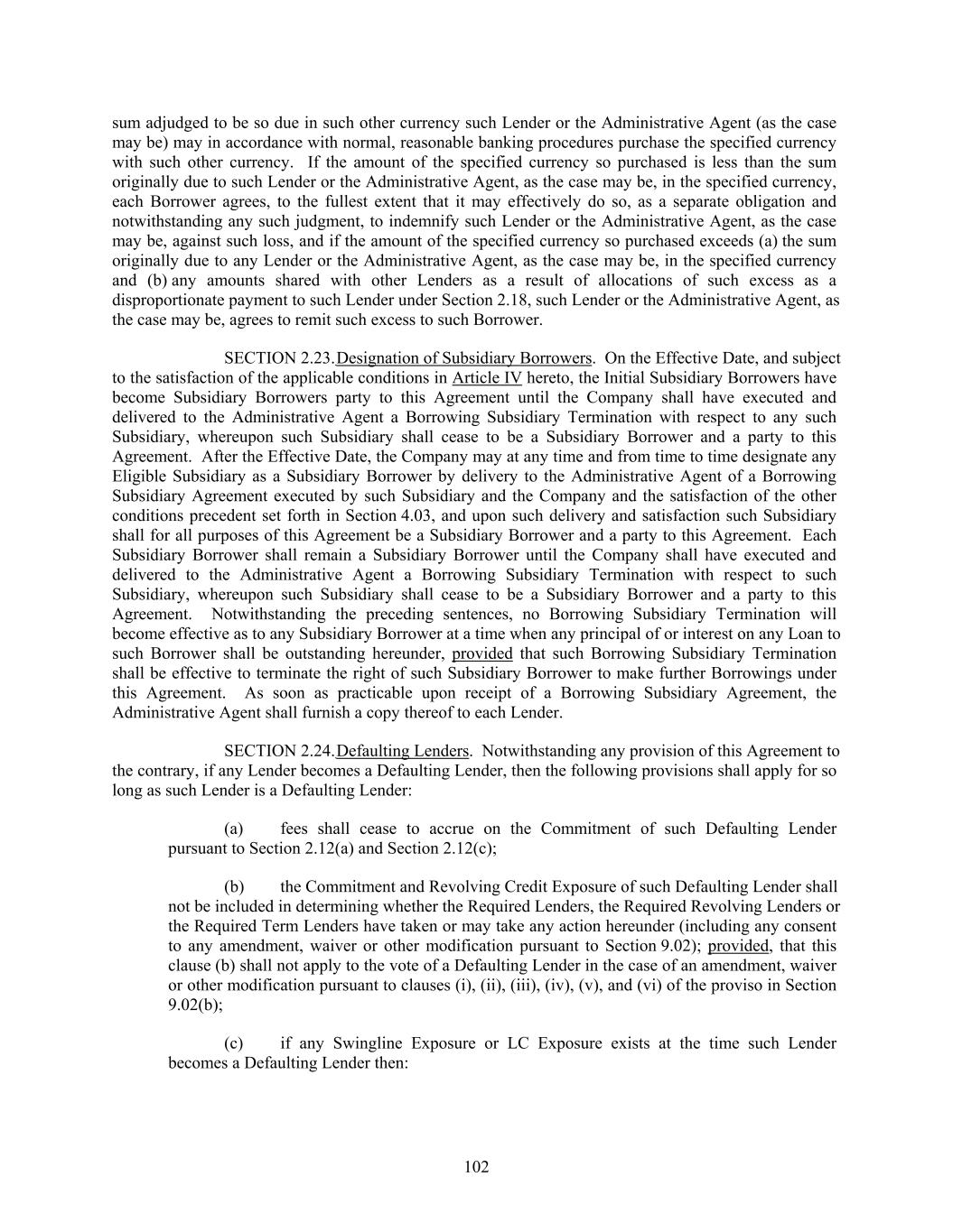 sum adjudged to be so due in such other currency such Lender or the Administrative Agent (as the case may be) may in accordance with normal, reasonable banking procedures purchase the specified currency with such other currency. If the amount of the specified currency so purchased is less than the sum originally due to such Lender or the Administrative Agent, as the case may be, in the specified currency, each Borrower agrees, to the fullest extent that it may effectively do so, as a separate obligation and notwithstanding any such judgment, to indemnify such Lender or the Administrative Agent, as the case may be, against such loss, and if the amount of the specified currency so purchased exceeds (a) the sum originally due to any Lender or the Administrative Agent, as the case may be, in the specified currency and (b) any amounts shared with other Lenders as a result of allocations of such excess as a disproportionate payment to such Lender under Section 2.18, such Lender or the Administrative Agent, as the case may be, agrees to remit such excess to such Borrower. SECTION 2.23.Designation of Subsidiary Borrowers. On the Effective Date, and subject to the satisfaction of the applicable conditions in Article IV hereto, the Initial Subsidiary Borrowers have become Subsidiary Borrowers party to this Agreement until the Company shall have executed and delivered to the Administrative Agent a Borrowing Subsidiary Termination with respect to any such Subsidiary, whereupon such Subsidiary shall cease to be a Subsidiary Borrower and a party to this Agreement. After the Effective Date, the Company may at any time and from time to time designate any Eligible Subsidiary as a Subsidiary Borrower by delivery to the Administrative Agent of a Borrowing Subsidiary Agreement executed by such Subsidiary and the Company and the satisfaction of the other conditions precedent set forth in Section 4.03, and upon such delivery and satisfaction such Subsidiary shall for all purposes of this Agreement be a Subsidiary Borrower and a party to this Agreement. Each Subsidiary Borrower shall remain a Subsidiary Borrower until the Company shall have executed and delivered to the Administrative Agent a Borrowing Subsidiary Termination with respect to such Subsidiary, whereupon such Subsidiary shall cease to be a Subsidiary Borrower and a party to this Agreement. Notwithstanding the preceding sentences, no Borrowing Subsidiary Termination will become effective as to any Subsidiary Borrower at a time when any principal of or interest on any Loan to such Borrower shall be outstanding hereunder, provided that such Borrowing Subsidiary Termination shall be effective to terminate the right of such Subsidiary Borrower to make further Borrowings under this Agreement. As soon as practicable upon receipt of a Borrowing Subsidiary Agreement, the Administrative Agent shall furnish a copy thereof to each Lender. SECTION 2.24.Defaulting Lenders. Notwithstanding any provision of this Agreement to the contrary, if any Lender becomes a Defaulting Lender, then the following provisions shall apply for so long as such Lender is a Defaulting Lender: (a) fees shall cease to accrue on the Commitment of such Defaulting Lender pursuant to Section 2.12(a) and Section 2.12(c); (b) the Commitment and Revolving Credit Exposure of such Defaulting Lender shall not be included in determining whether the Required Lenders, the Required Revolving Lenders or the Required Term Lenders have taken or may take any action hereunder (including any consent to any amendment, waiver or other modification pursuant to Section 9.02); provided, that this clause (b) shall not apply to the vote of a Defaulting Lender in the case of an amendment, waiver or other modification pursuant to clauses (i), (ii), (iii), (iv), (v), and (vi) of the proviso in Section 9.02(b); (c) if any Swingline Exposure or LC Exposure exists at the time such Lender becomes a Defaulting Lender then: 102