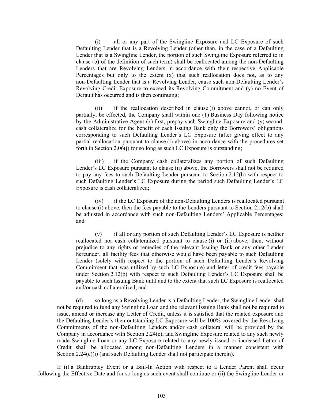 (i) all or any part of the Swingline Exposure and LC Exposure of such Defaulting Lender that is a Revolving Lender (other than, in the case of a Defaulting Lender that is a Swingline Lender, the portion of such Swingline Exposure referred to in clause (b) of the definition of such term) shall be reallocated among the non-Defaulting Lenders that are Revolving Lenders in accordance with their respective Applicable Percentages but only to the extent (x) that such reallocation does not, as to any non-Defaulting Lender that is a Revolving Lender, cause such non-Defaulting Lender’s Revolving Credit Exposure to exceed its Revolving Commitment and (y) no Event of Default has occurred and is then continuing; (ii) if the reallocation described in clause (i) above cannot, or can only partially, be effected, the Company shall within one (1) Business Day following notice by the Administrative Agent (x) first, prepay such Swingline Exposure and (y) second, cash collateralize for the benefit of each Issuing Bank only the Borrowers’ obligations corresponding to such Defaulting Lender’s LC Exposure (after giving effect to any partial reallocation pursuant to clause (i) above) in accordance with the procedures set forth in Section 2.06(j) for so long as such LC Exposure is outstanding; (iii) if the Company cash collateralizes any portion of such Defaulting Lender’s LC Exposure pursuant to clause (ii) above, the Borrowers shall not be required to pay any fees to such Defaulting Lender pursuant to Section 2.12(b) with respect to such Defaulting Lender’s LC Exposure during the period such Defaulting Lender’s LC Exposure is cash collateralized; (iv) if the LC Exposure of the non-Defaulting Lenders is reallocated pursuant to clause (i) above, then the fees payable to the Lenders pursuant to Section 2.12(b) shall be adjusted in accordance with such non-Defaulting Lenders’ Applicable Percentages; and (v) if all or any portion of such Defaulting Lender’s LC Exposure is neither reallocated nor cash collateralized pursuant to clause (i) or (ii) above, then, without prejudice to any rights or remedies of the relevant Issuing Bank or any other Lender hereunder, all facility fees that otherwise would have been payable to such Defaulting Lender (solely with respect to the portion of such Defaulting Lender’s Revolving Commitment that was utilized by such LC Exposure) and letter of credit fees payable under Section 2.12(b) with respect to such Defaulting Lender’s LC Exposure shall be payable to such Issuing Bank until and to the extent that such LC Exposure is reallocated and/or cash collateralized; and (d) so long as a Revolving Lender is a Defaulting Lender, the Swingline Lender shall not be required to fund any Swingline Loan and the relevant Issuing Bank shall not be required to issue, amend or increase any Letter of Credit, unless it is satisfied that the related exposure and the Defaulting Lender’s then outstanding LC Exposure will be 100% covered by the Revolving Commitments of the non-Defaulting Lenders and/or cash collateral will be provided by the Company in accordance with Section 2.24(c), and Swingline Exposure related to any such newly made Swingline Loan or any LC Exposure related to any newly issued or increased Letter of Credit shall be allocated among non-Defaulting Lenders in a manner consistent with Section 2.24(c)(i) (and such Defaulting Lender shall not participate therein). If (i) a Bankruptcy Event or a Bail-In Action with respect to a Lender Parent shall occur following the Effective Date and for so long as such event shall continue or (ii) the Swingline Lender or 103