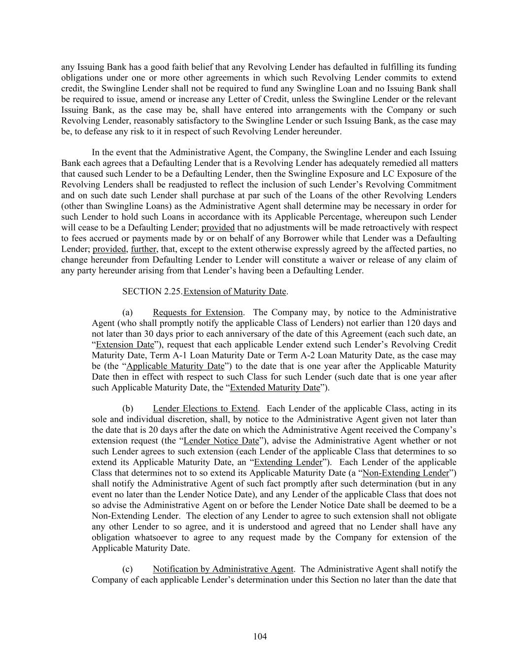 any Issuing Bank has a good faith belief that any Revolving Lender has defaulted in fulfilling its funding obligations under one or more other agreements in which such Revolving Lender commits to extend credit, the Swingline Lender shall not be required to fund any Swingline Loan and no Issuing Bank shall be required to issue, amend or increase any Letter of Credit, unless the Swingline Lender or the relevant Issuing Bank, as the case may be, shall have entered into arrangements with the Company or such Revolving Lender, reasonably satisfactory to the Swingline Lender or such Issuing Bank, as the case may be, to defease any risk to it in respect of such Revolving Lender hereunder. In the event that the Administrative Agent, the Company, the Swingline Lender and each Issuing Bank each agrees that a Defaulting Lender that is a Revolving Lender has adequately remedied all matters that caused such Lender to be a Defaulting Lender, then the Swingline Exposure and LC Exposure of the Revolving Lenders shall be readjusted to reflect the inclusion of such Lender’s Revolving Commitment and on such date such Lender shall purchase at par such of the Loans of the other Revolving Lenders (other than Swingline Loans) as the Administrative Agent shall determine may be necessary in order for such Lender to hold such Loans in accordance with its Applicable Percentage, whereupon such Lender will cease to be a Defaulting Lender; provided that no adjustments will be made retroactively with respect to fees accrued or payments made by or on behalf of any Borrower while that Lender was a Defaulting Lender; provided, further, that, except to the extent otherwise expressly agreed by the affected parties, no change hereunder from Defaulting Lender to Lender will constitute a waiver or release of any claim of any party hereunder arising from that Lender’s having been a Defaulting Lender. SECTION 2.25.Extension of Maturity Date. (a) Requests for Extension. The Company may, by notice to the Administrative Agent (who shall promptly notify the applicable Class of Lenders) not earlier than 120 days and not later than 30 days prior to each anniversary of the date of this Agreement (each such date, an “Extension Date”), request that each applicable Lender extend such Lender’s Revolving Credit Maturity Date, Term A-1 Loan Maturity Date or Term A-2 Loan Maturity Date, as the case may be (the “Applicable Maturity Date”) to the date that is one year after the Applicable Maturity Date then in effect with respect to such Class for such Lender (such date that is one year after such Applicable Maturity Date, the “Extended Maturity Date”). (b) Lender Elections to Extend. Each Lender of the applicable Class, acting in its sole and individual discretion, shall, by notice to the Administrative Agent given not later than the date that is 20 days after the date on which the Administrative Agent received the Company’s extension request (the “Lender Notice Date”), advise the Administrative Agent whether or not such Lender agrees to such extension (each Lender of the applicable Class that determines to so extend its Applicable Maturity Date, an “Extending Lender”). Each Lender of the applicable Class that determines not to so extend its Applicable Maturity Date (a “Non-Extending Lender”) shall notify the Administrative Agent of such fact promptly after such determination (but in any event no later than the Lender Notice Date), and any Lender of the applicable Class that does not so advise the Administrative Agent on or before the Lender Notice Date shall be deemed to be a Non-Extending Lender. The election of any Lender to agree to such extension shall not obligate any other Lender to so agree, and it is understood and agreed that no Lender shall have any obligation whatsoever to agree to any request made by the Company for extension of the Applicable Maturity Date. (c) Notification by Administrative Agent. The Administrative Agent shall notify the Company of each applicable Lender’s determination under this Section no later than the date that 104
