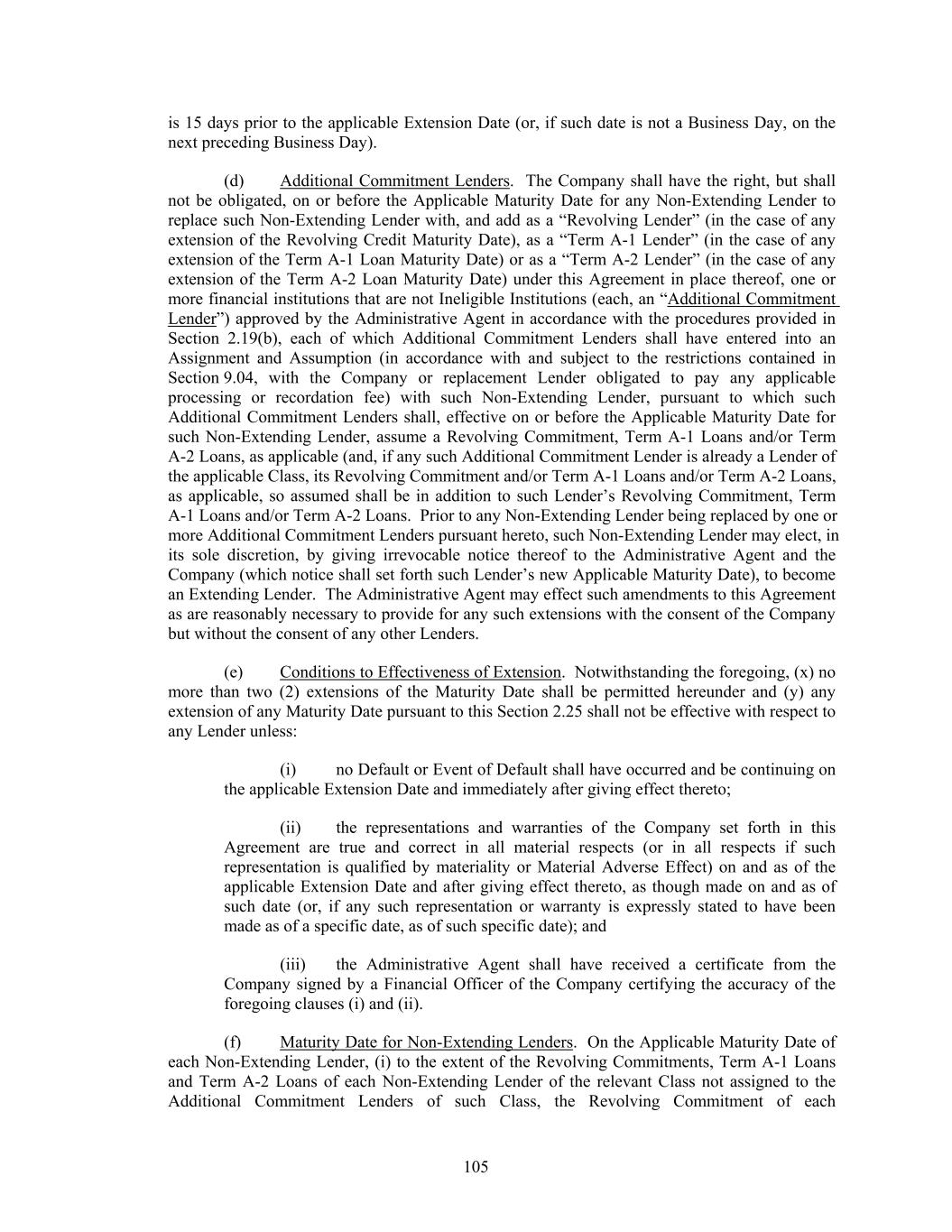 is 15 days prior to the applicable Extension Date (or, if such date is not a Business Day, on the next preceding Business Day). (d) Additional Commitment Lenders. The Company shall have the right, but shall not be obligated, on or before the Applicable Maturity Date for any Non-Extending Lender to replace such Non-Extending Lender with, and add as a “Revolving Lender” (in the case of any extension of the Revolving Credit Maturity Date), as a “Term A-1 Lender” (in the case of any extension of the Term A-1 Loan Maturity Date) or as a “Term A-2 Lender” (in the case of any extension of the Term A-2 Loan Maturity Date) under this Agreement in place thereof, one or more financial institutions that are not Ineligible Institutions (each, an “Additional Commitment Lender”) approved by the Administrative Agent in accordance with the procedures provided in Section 2.19(b), each of which Additional Commitment Lenders shall have entered into an Assignment and Assumption (in accordance with and subject to the restrictions contained in Section 9.04, with the Company or replacement Lender obligated to pay any applicable processing or recordation fee) with such Non-Extending Lender, pursuant to which such Additional Commitment Lenders shall, effective on or before the Applicable Maturity Date for such Non-Extending Lender, assume a Revolving Commitment, Term A-1 Loans and/or Term A-2 Loans, as applicable (and, if any such Additional Commitment Lender is already a Lender of the applicable Class, its Revolving Commitment and/or Term A-1 Loans and/or Term A-2 Loans, as applicable, so assumed shall be in addition to such Lender’s Revolving Commitment, Term A-1 Loans and/or Term A-2 Loans. Prior to any Non-Extending Lender being replaced by one or more Additional Commitment Lenders pursuant hereto, such Non-Extending Lender may elect, in its sole discretion, by giving irrevocable notice thereof to the Administrative Agent and the Company (which notice shall set forth such Lender’s new Applicable Maturity Date), to become an Extending Lender. The Administrative Agent may effect such amendments to this Agreement as are reasonably necessary to provide for any such extensions with the consent of the Company but without the consent of any other Lenders. (e) Conditions to Effectiveness of Extension. Notwithstanding the foregoing, (x) no more than two (2) extensions of the Maturity Date shall be permitted hereunder and (y) any extension of any Maturity Date pursuant to this Section 2.25 shall not be effective with respect to any Lender unless: (i) no Default or Event of Default shall have occurred and be continuing on the applicable Extension Date and immediately after giving effect thereto; (ii) the representations and warranties of the Company set forth in this Agreement are true and correct in all material respects (or in all respects if such representation is qualified by materiality or Material Adverse Effect) on and as of the applicable Extension Date and after giving effect thereto, as though made on and as of such date (or, if any such representation or warranty is expressly stated to have been made as of a specific date, as of such specific date); and (iii) the Administrative Agent shall have received a certificate from the Company signed by a Financial Officer of the Company certifying the accuracy of the foregoing clauses (i) and (ii). (f) Maturity Date for Non-Extending Lenders. On the Applicable Maturity Date of each Non-Extending Lender, (i) to the extent of the Revolving Commitments, Term A-1 Loans and Term A-2 Loans of each Non-Extending Lender of the relevant Class not assigned to the Additional Commitment Lenders of such Class, the Revolving Commitment of each 105