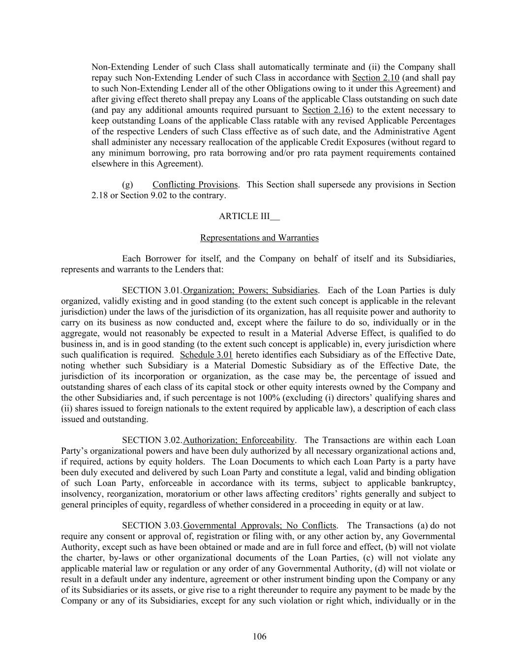 Non-Extending Lender of such Class shall automatically terminate and (ii) the Company shall repay such Non-Extending Lender of such Class in accordance with Section 2.10 (and shall pay to such Non-Extending Lender all of the other Obligations owing to it under this Agreement) and after giving effect thereto shall prepay any Loans of the applicable Class outstanding on such date (and pay any additional amounts required pursuant to Section 2.16) to the extent necessary to keep outstanding Loans of the applicable Class ratable with any revised Applicable Percentages of the respective Lenders of such Class effective as of such date, and the Administrative Agent shall administer any necessary reallocation of the applicable Credit Exposures (without regard to any minimum borrowing, pro rata borrowing and/or pro rata payment requirements contained elsewhere in this Agreement). (g) Conflicting Provisions. This Section shall supersede any provisions in Section 2.18 or Section 9.02 to the contrary. ARTICLE III Representations and Warranties Each Borrower for itself, and the Company on behalf of itself and its Subsidiaries, represents and warrants to the Lenders that: SECTION 3.01.Organization; Powers; Subsidiaries. Each of the Loan Parties is duly organized, validly existing and in good standing (to the extent such concept is applicable in the relevant jurisdiction) under the laws of the jurisdiction of its organization, has all requisite power and authority to carry on its business as now conducted and, except where the failure to do so, individually or in the aggregate, would not reasonably be expected to result in a Material Adverse Effect, is qualified to do business in, and is in good standing (to the extent such concept is applicable) in, every jurisdiction where such qualification is required. Schedule 3.01 hereto identifies each Subsidiary as of the Effective Date, noting whether such Subsidiary is a Material Domestic Subsidiary as of the Effective Date, the jurisdiction of its incorporation or organization, as the case may be, the percentage of issued and outstanding shares of each class of its capital stock or other equity interests owned by the Company and the other Subsidiaries and, if such percentage is not 100% (excluding (i) directors’ qualifying shares and (ii) shares issued to foreign nationals to the extent required by applicable law), a description of each class issued and outstanding. SECTION 3.02.Authorization; Enforceability. The Transactions are within each Loan Party’s organizational powers and have been duly authorized by all necessary organizational actions and, if required, actions by equity holders. The Loan Documents to which each Loan Party is a party have been duly executed and delivered by such Loan Party and constitute a legal, valid and binding obligation of such Loan Party, enforceable in accordance with its terms, subject to applicable bankruptcy, insolvency, reorganization, moratorium or other laws affecting creditors’ rights generally and subject to general principles of equity, regardless of whether considered in a proceeding in equity or at law. SECTION 3.03.Governmental Approvals; No Conflicts. The Transactions (a) do not require any consent or approval of, registration or filing with, or any other action by, any Governmental Authority, except such as have been obtained or made and are in full force and effect, (b) will not violate the charter, by-laws or other organizational documents of the Loan Parties, (c) will not violate any applicable material law or regulation or any order of any Governmental Authority, (d) will not violate or result in a default under any indenture, agreement or other instrument binding upon the Company or any of its Subsidiaries or its assets, or give rise to a right thereunder to require any payment to be made by the Company or any of its Subsidiaries, except for any such violation or right which, individually or in the 106