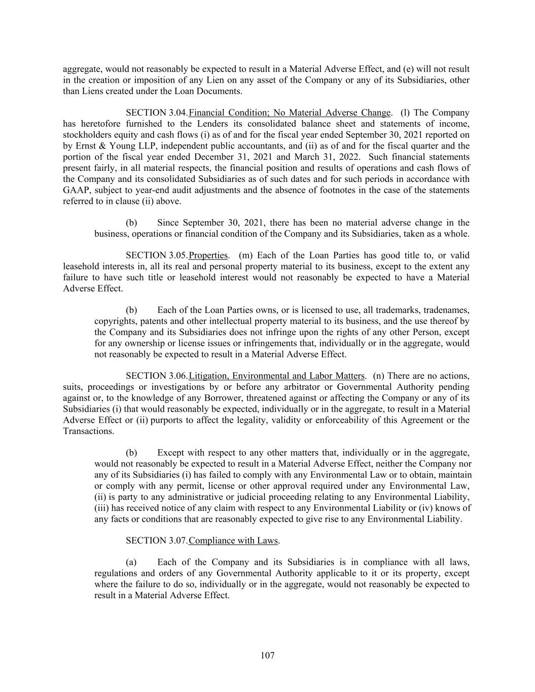 aggregate, would not reasonably be expected to result in a Material Adverse Effect, and (e) will not result in the creation or imposition of any Lien on any asset of the Company or any of its Subsidiaries, other than Liens created under the Loan Documents. SECTION 3.04.Financial Condition; No Material Adverse Change. (l) The Company has heretofore furnished to the Lenders its consolidated balance sheet and statements of income, stockholders equity and cash flows (i) as of and for the fiscal year ended September 30, 2021 reported on by Ernst & Young LLP, independent public accountants, and (ii) as of and for the fiscal quarter and the portion of the fiscal year ended December 31, 2021 and March 31, 2022. Such financial statements present fairly, in all material respects, the financial position and results of operations and cash flows of the Company and its consolidated Subsidiaries as of such dates and for such periods in accordance with GAAP, subject to year-end audit adjustments and the absence of footnotes in the case of the statements referred to in clause (ii) above. (b) Since September 30, 2021, there has been no material adverse change in the business, operations or financial condition of the Company and its Subsidiaries, taken as a whole. SECTION 3.05.Properties. (m) Each of the Loan Parties has good title to, or valid leasehold interests in, all its real and personal property material to its business, except to the extent any failure to have such title or leasehold interest would not reasonably be expected to have a Material Adverse Effect. (b) Each of the Loan Parties owns, or is licensed to use, all trademarks, tradenames, copyrights, patents and other intellectual property material to its business, and the use thereof by the Company and its Subsidiaries does not infringe upon the rights of any other Person, except for any ownership or license issues or infringements that, individually or in the aggregate, would not reasonably be expected to result in a Material Adverse Effect. SECTION 3.06.Litigation, Environmental and Labor Matters. (n) There are no actions, suits, proceedings or investigations by or before any arbitrator or Governmental Authority pending against or, to the knowledge of any Borrower, threatened against or affecting the Company or any of its Subsidiaries (i) that would reasonably be expected, individually or in the aggregate, to result in a Material Adverse Effect or (ii) purports to affect the legality, validity or enforceability of this Agreement or the Transactions. (b) Except with respect to any other matters that, individually or in the aggregate, would not reasonably be expected to result in a Material Adverse Effect, neither the Company nor any of its Subsidiaries (i) has failed to comply with any Environmental Law or to obtain, maintain or comply with any permit, license or other approval required under any Environmental Law, (ii) is party to any administrative or judicial proceeding relating to any Environmental Liability, (iii) has received notice of any claim with respect to any Environmental Liability or (iv) knows of any facts or conditions that are reasonably expected to give rise to any Environmental Liability. SECTION 3.07.Compliance with Laws. (a) Each of the Company and its Subsidiaries is in compliance with all laws, regulations and orders of any Governmental Authority applicable to it or its property, except where the failure to do so, individually or in the aggregate, would not reasonably be expected to result in a Material Adverse Effect. 107