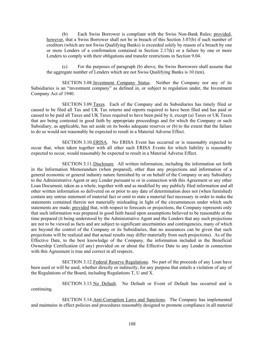 (b) Each Swiss Borrower is compliant with the Swiss Non-Bank Rules; provided, however, that a Swiss Borrower shall not be in breach of this Section 3.07(b) if such number of creditors (which are not Swiss Qualifying Banks) is exceeded solely by reason of a breach by one or more Lenders of a confirmation contained in Section 2.17(k) or a failure by one or more Lenders to comply with their obligations and transfer restrictions in Section 9.04. (c) For the purposes of paragraph (b) above, the Swiss Borrowers shall assume that the aggregate number of Lenders which are not Swiss Qualifying Banks is 10 (ten). SECTION 3.08.Investment Company Status. Neither the Company nor any of its Subsidiaries is an “investment company” as defined in, or subject to regulation under, the Investment Company Act of 1940. SECTION 3.09.Taxes. Each of the Company and its Subsidiaries has timely filed or caused to be filed all Tax and UK Tax returns and reports required to have been filed and has paid or caused to be paid all Taxes and UK Taxes required to have been paid by it, except (a) Taxes or UK Taxes that are being contested in good faith by appropriate proceedings and for which the Company or such Subsidiary, as applicable, has set aside on its books adequate reserves or (b) to the extent that the failure to do so would not reasonably be expected to result in a Material Adverse Effect. SECTION 3.10.ERISA. No ERISA Event has occurred or is reasonably expected to occur that, when taken together with all other such ERISA Events for which liability is reasonably expected to occur, would reasonably be expected to result in a Material Adverse Effect. SECTION 3.11.Disclosure. All written information, including the information set forth in the Information Memorandum (when prepared), other than any projections and information of a general economic or general industry nature furnished by or on behalf of the Company or any Subsidiary to the Administrative Agent or any Lender pursuant to or in connection with this Agreement or any other Loan Document, taken as a whole, together with and as modified by any publicly filed information and all other written information so delivered on or prior to any date of determination does not (when furnished) contain any untrue statement of material fact or omit to state a material fact necessary in order to make the statements contained therein not materially misleading in light of the circumstances under which such statements are made; provided that, with respect to forecasts or projections, the Company represents only that such information was prepared in good faith based upon assumptions believed to be reasonable at the time prepared (it being understood by the Administrative Agent and the Lenders that any such projections are not to be viewed as facts and are subject to significant uncertainties and contingencies, many of which are beyond the control of the Company or its Subsidiaries, that no assurances can be given that such projections will be realized and that actual results may differ materially from such projections). As of the Effective Date, to the best knowledge of the Company, the information included in the Beneficial Ownership Certification (if any) provided on or about the Effective Date to any Lender in connection with this Agreement is true and correct in all respects. SECTION 3.12.Federal Reserve Regulations. No part of the proceeds of any Loan have been used or will be used, whether directly or indirectly, for any purpose that entails a violation of any of the Regulations of the Board, including Regulations T, U and X. SECTION 3.13.No Default. No Default or Event of Default has occurred and is continuing. SECTION 3.14.Anti-Corruption Laws and Sanctions. The Company has implemented and maintains in effect policies and procedures reasonably designed to promote compliance in all material 108