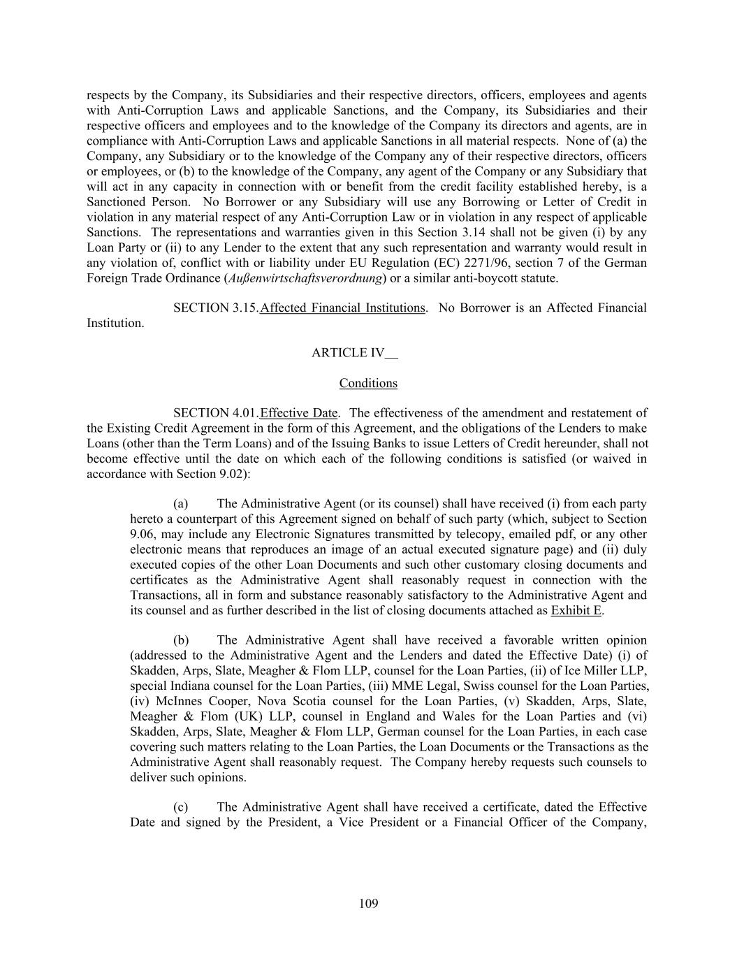 respects by the Company, its Subsidiaries and their respective directors, officers, employees and agents with Anti-Corruption Laws and applicable Sanctions, and the Company, its Subsidiaries and their respective officers and employees and to the knowledge of the Company its directors and agents, are in compliance with Anti-Corruption Laws and applicable Sanctions in all material respects. None of (a) the Company, any Subsidiary or to the knowledge of the Company any of their respective directors, officers or employees, or (b) to the knowledge of the Company, any agent of the Company or any Subsidiary that will act in any capacity in connection with or benefit from the credit facility established hereby, is a Sanctioned Person. No Borrower or any Subsidiary will use any Borrowing or Letter of Credit in violation in any material respect of any Anti-Corruption Law or in violation in any respect of applicable Sanctions. The representations and warranties given in this Section 3.14 shall not be given (i) by any Loan Party or (ii) to any Lender to the extent that any such representation and warranty would result in any violation of, conflict with or liability under EU Regulation (EC) 2271/96, section 7 of the German Foreign Trade Ordinance (Außenwirtschaftsverordnung) or a similar anti-boycott statute. SECTION 3.15.Affected Financial Institutions. No Borrower is an Affected Financial Institution. ARTICLE IV Conditions SECTION 4.01.Effective Date. The effectiveness of the amendment and restatement of the Existing Credit Agreement in the form of this Agreement, and the obligations of the Lenders to make Loans (other than the Term Loans) and of the Issuing Banks to issue Letters of Credit hereunder, shall not become effective until the date on which each of the following conditions is satisfied (or waived in accordance with Section 9.02): (a) The Administrative Agent (or its counsel) shall have received (i) from each party hereto a counterpart of this Agreement signed on behalf of such party (which, subject to Section 9.06, may include any Electronic Signatures transmitted by telecopy, emailed pdf, or any other electronic means that reproduces an image of an actual executed signature page) and (ii) duly executed copies of the other Loan Documents and such other customary closing documents and certificates as the Administrative Agent shall reasonably request in connection with the Transactions, all in form and substance reasonably satisfactory to the Administrative Agent and its counsel and as further described in the list of closing documents attached as Exhibit E. (b) The Administrative Agent shall have received a favorable written opinion (addressed to the Administrative Agent and the Lenders and dated the Effective Date) (i) of Skadden, Arps, Slate, Meagher & Flom LLP, counsel for the Loan Parties, (ii) of Ice Miller LLP, special Indiana counsel for the Loan Parties, (iii) MME Legal, Swiss counsel for the Loan Parties, (iv) McInnes Cooper, Nova Scotia counsel for the Loan Parties, (v) Skadden, Arps, Slate, Meagher & Flom (UK) LLP, counsel in England and Wales for the Loan Parties and (vi) Skadden, Arps, Slate, Meagher & Flom LLP, German counsel for the Loan Parties, in each case covering such matters relating to the Loan Parties, the Loan Documents or the Transactions as the Administrative Agent shall reasonably request. The Company hereby requests such counsels to deliver such opinions. (c) The Administrative Agent shall have received a certificate, dated the Effective Date and signed by the President, a Vice President or a Financial Officer of the Company, 109
